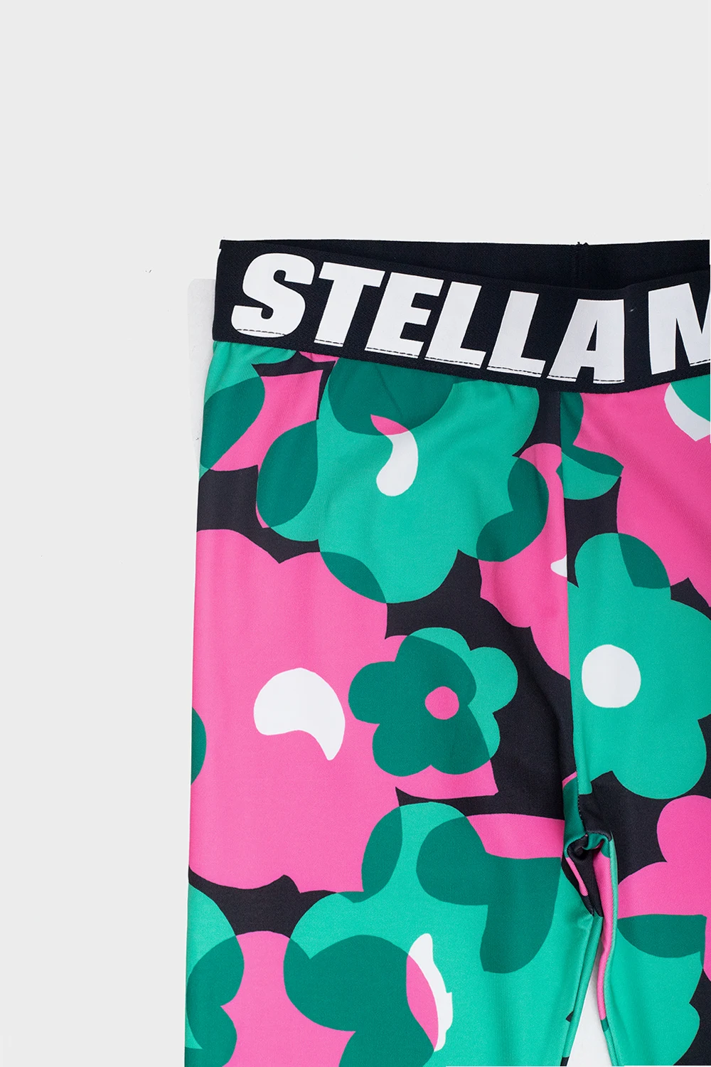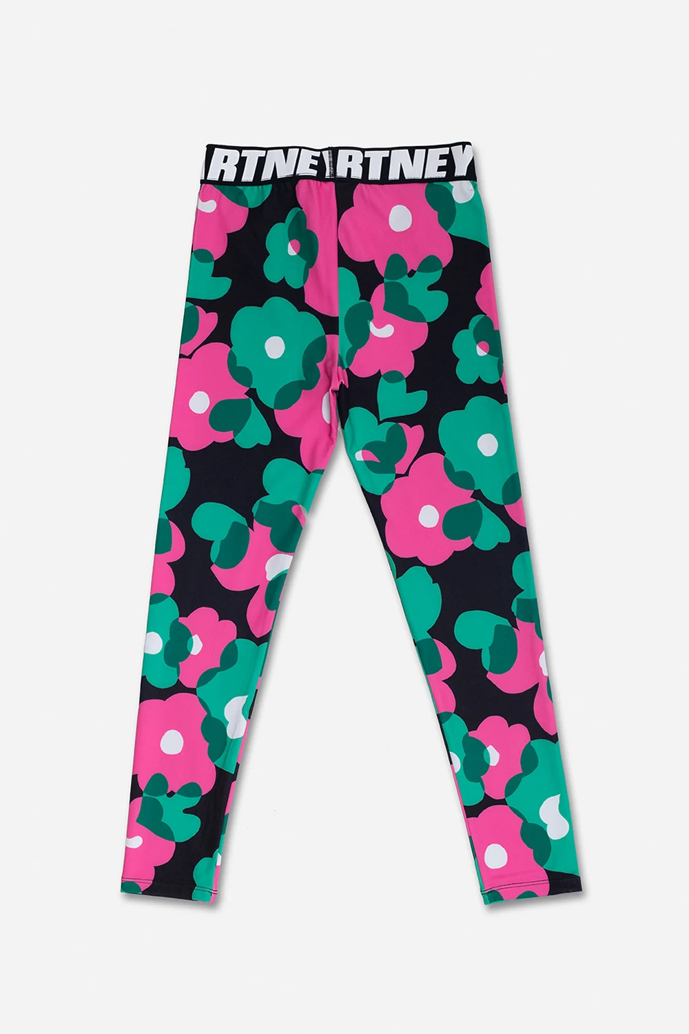 Multicolored leggings from Stella McCartney Kids. This pair features a black elastic waistband with a white logo print and an all-over floral pattern.
