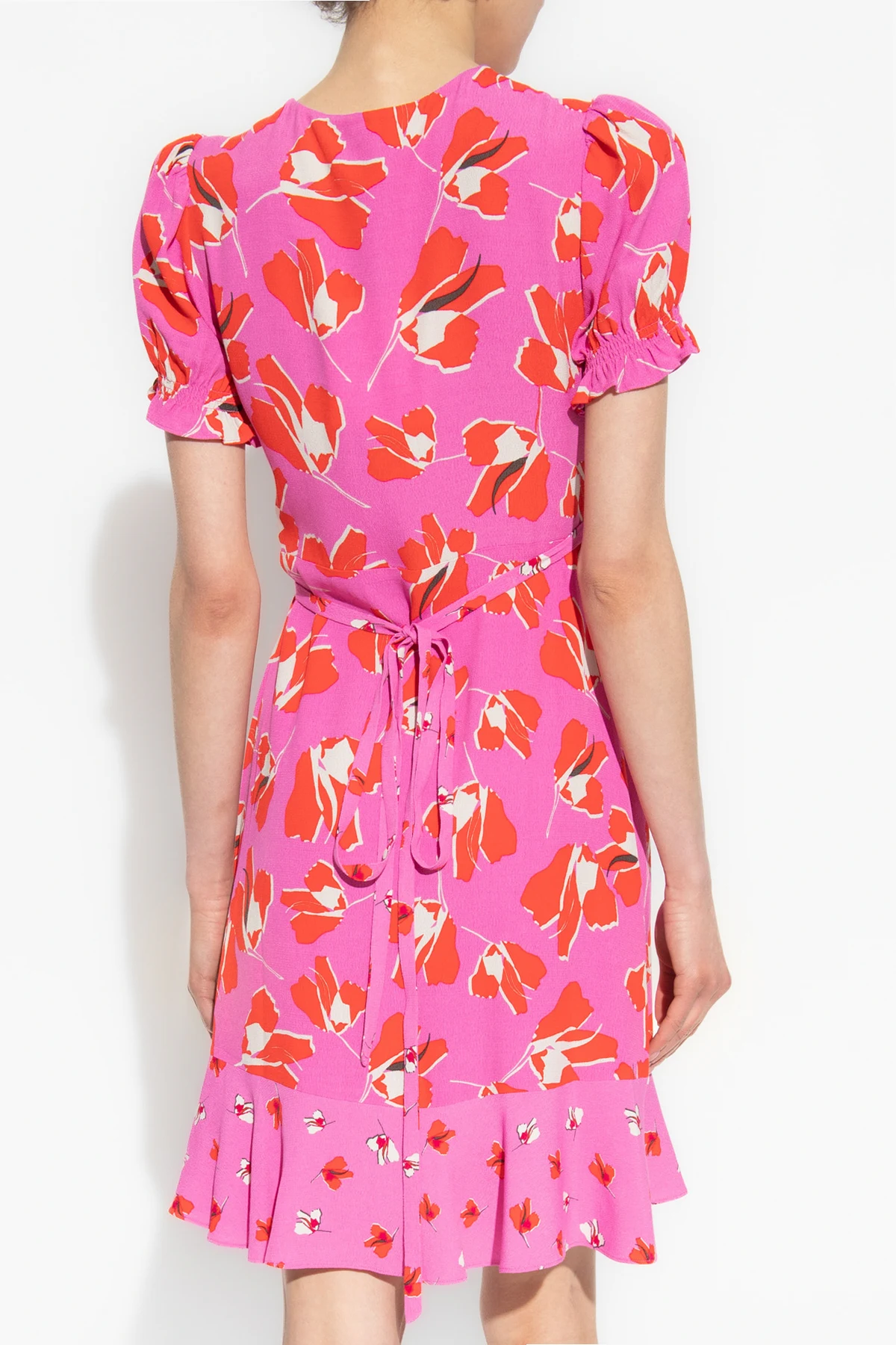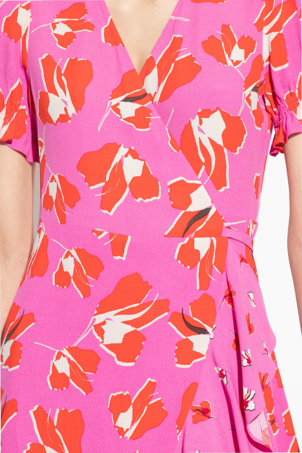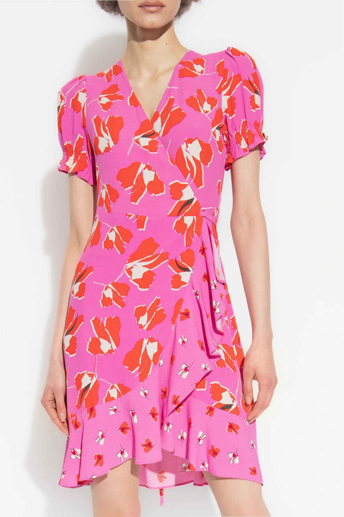 Pink, red and cream ‘Emilia Mini’ dress from Diane Von Furstenberg. Embellished with a floral pattern, this style features a wrap silhouette with puff short sleeves.