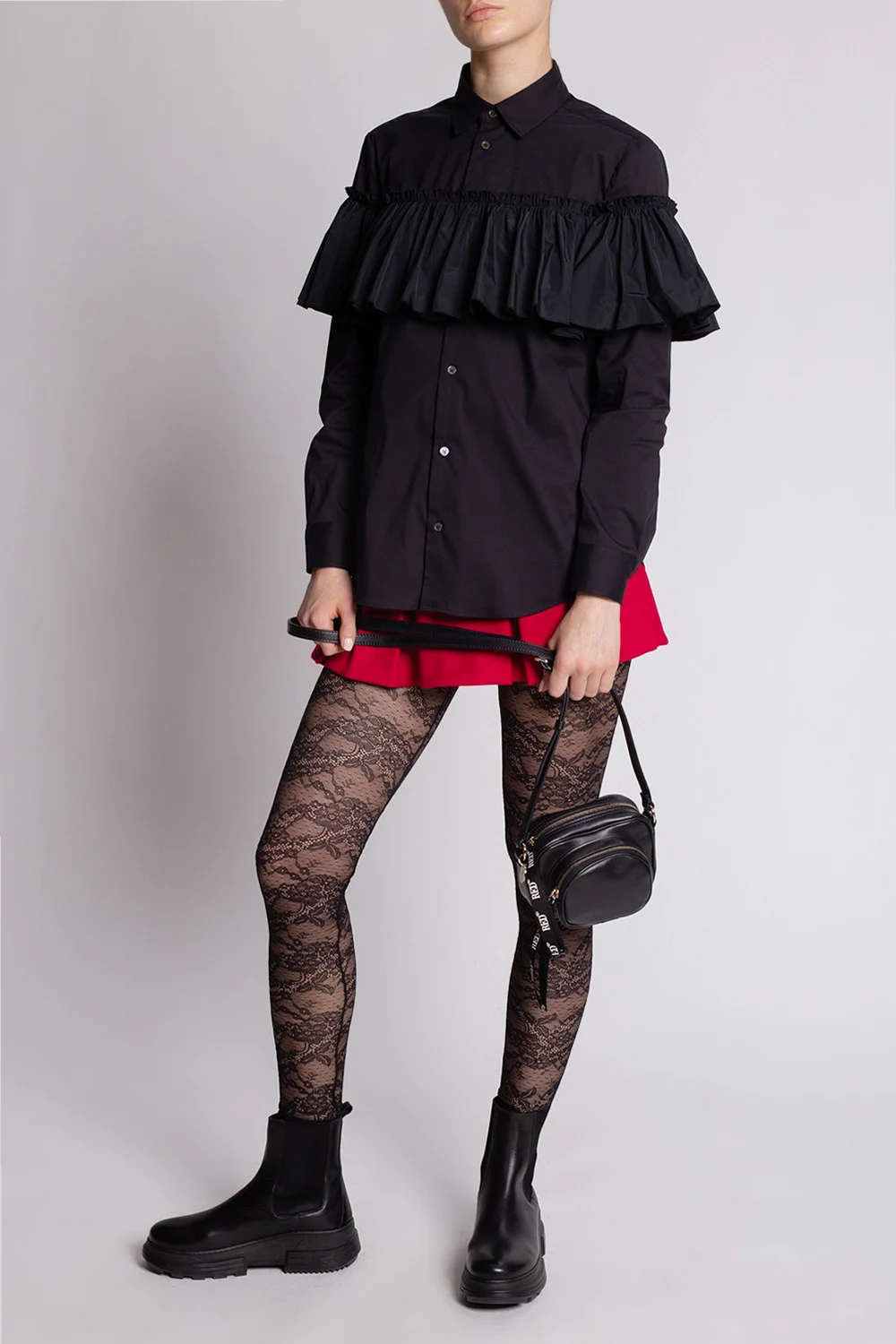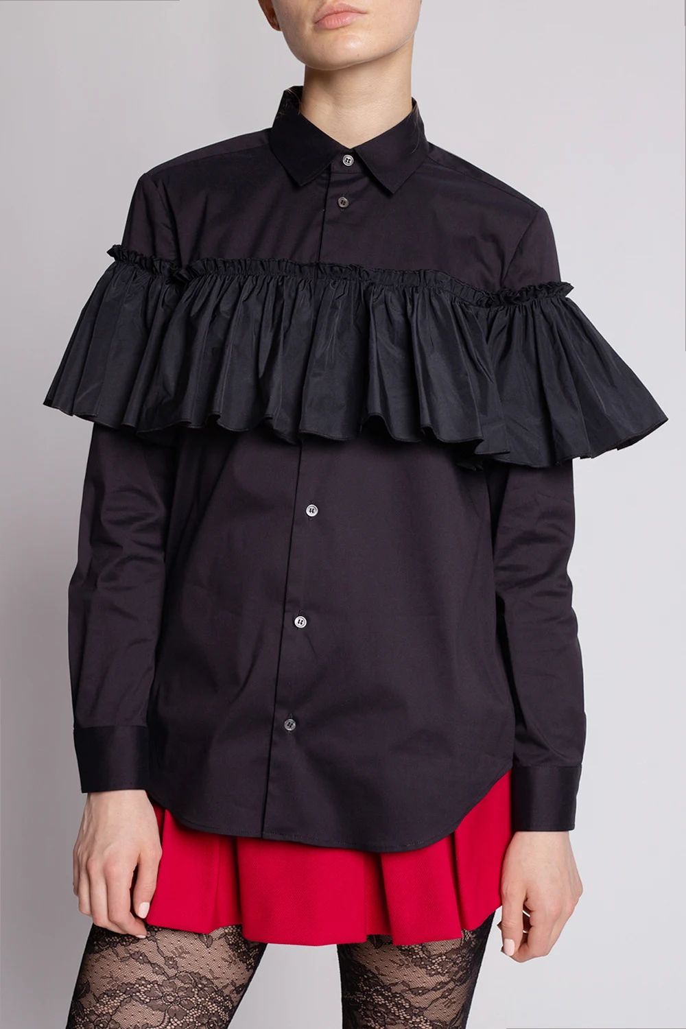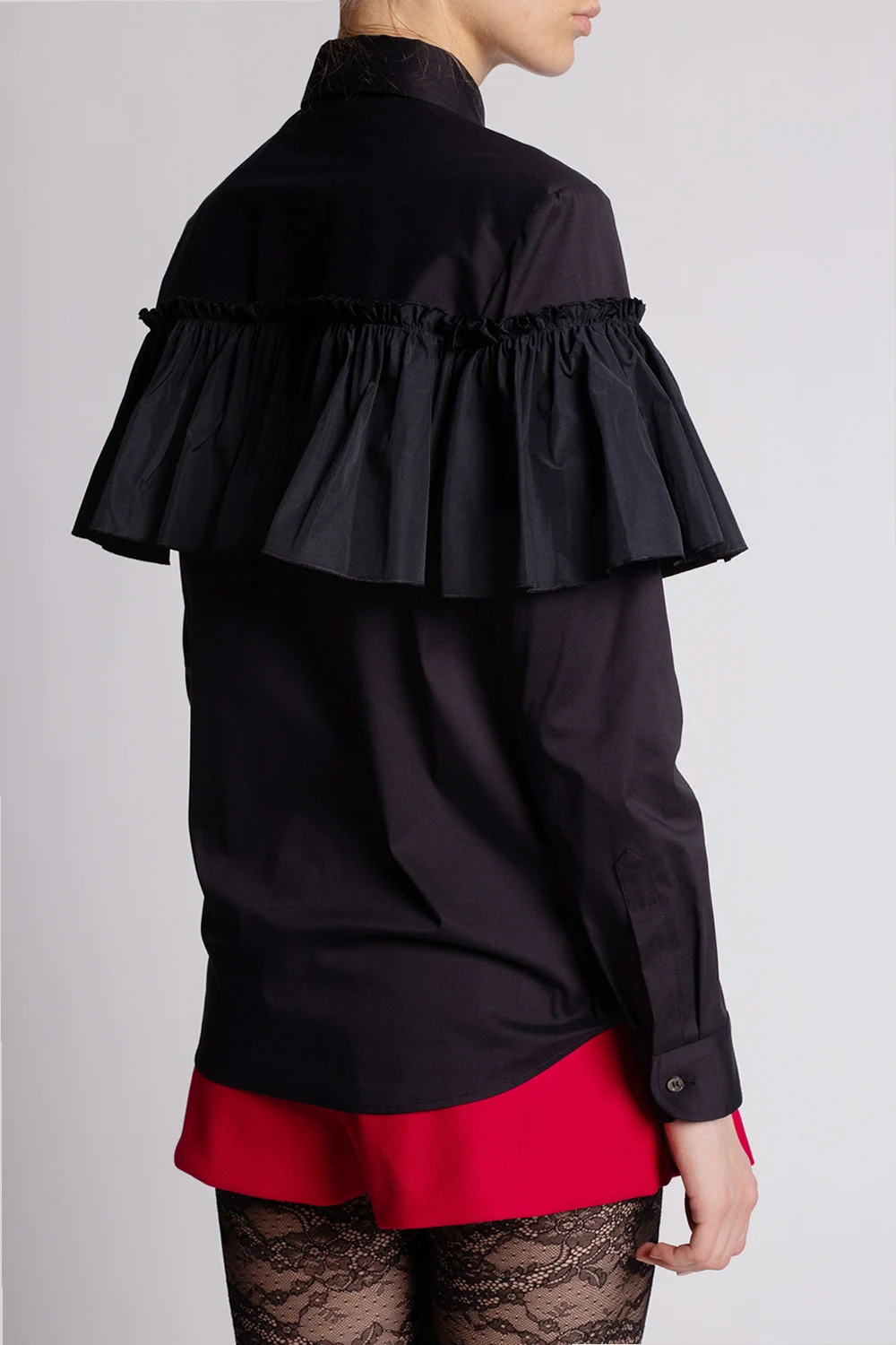 Black shirt from Red Valentino. Made of cotton, this style fastens via buttons and features ruffled detailing and long sleeves with button cuffs.