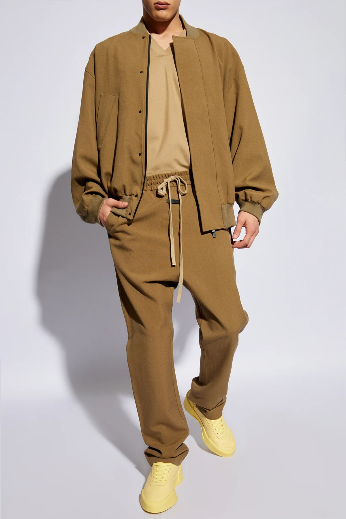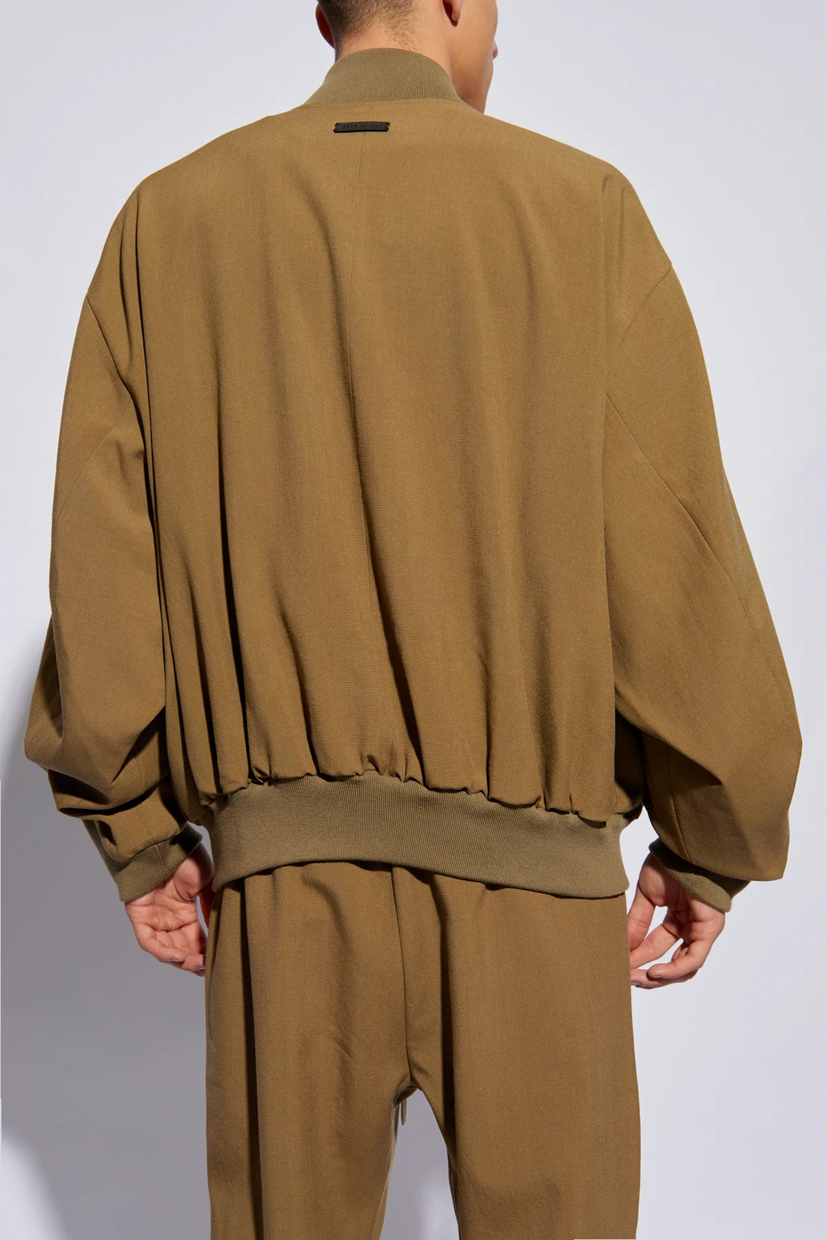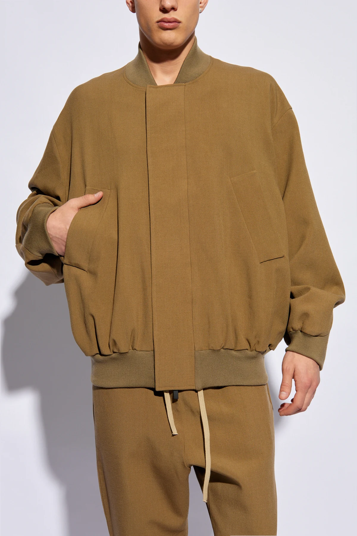 Die Jacke, gehalten in einem einfachen, lockeren Schnitt, ist aus einer hochwertigen Fasermischung gefertigt, einschließlich 100% Wolle , was unübertroffenen Tragekomfort und Langlebigkeit gewährleistet. Sie zeichnet sich durch ein minimalistisches Design aus, mit einem Stehkragen anstelle eines traditionellen Kragens und beidseitigen Taschen mit flachen Klappen. Der lange Ärmel, abgeschlossen mit einem breiten Bündchen, und ein elastisches Bündchen am unteren Ende der Jacke sorgen für eine perfekte Passform. Ein diskreter, aber markanter Akzent in Form eines kontrastierenden "FEAR OF GOD" -Labels am oberen Rücken verleiht der Jacke einen exklusiven Charakter.