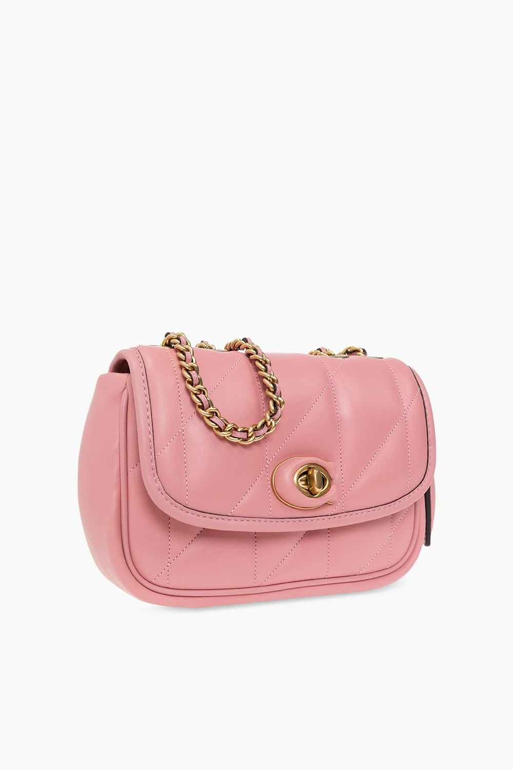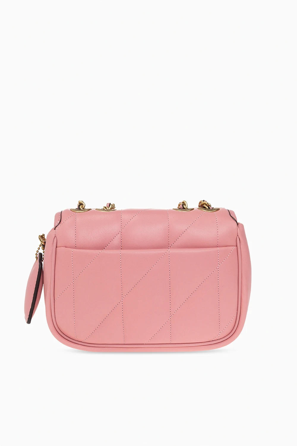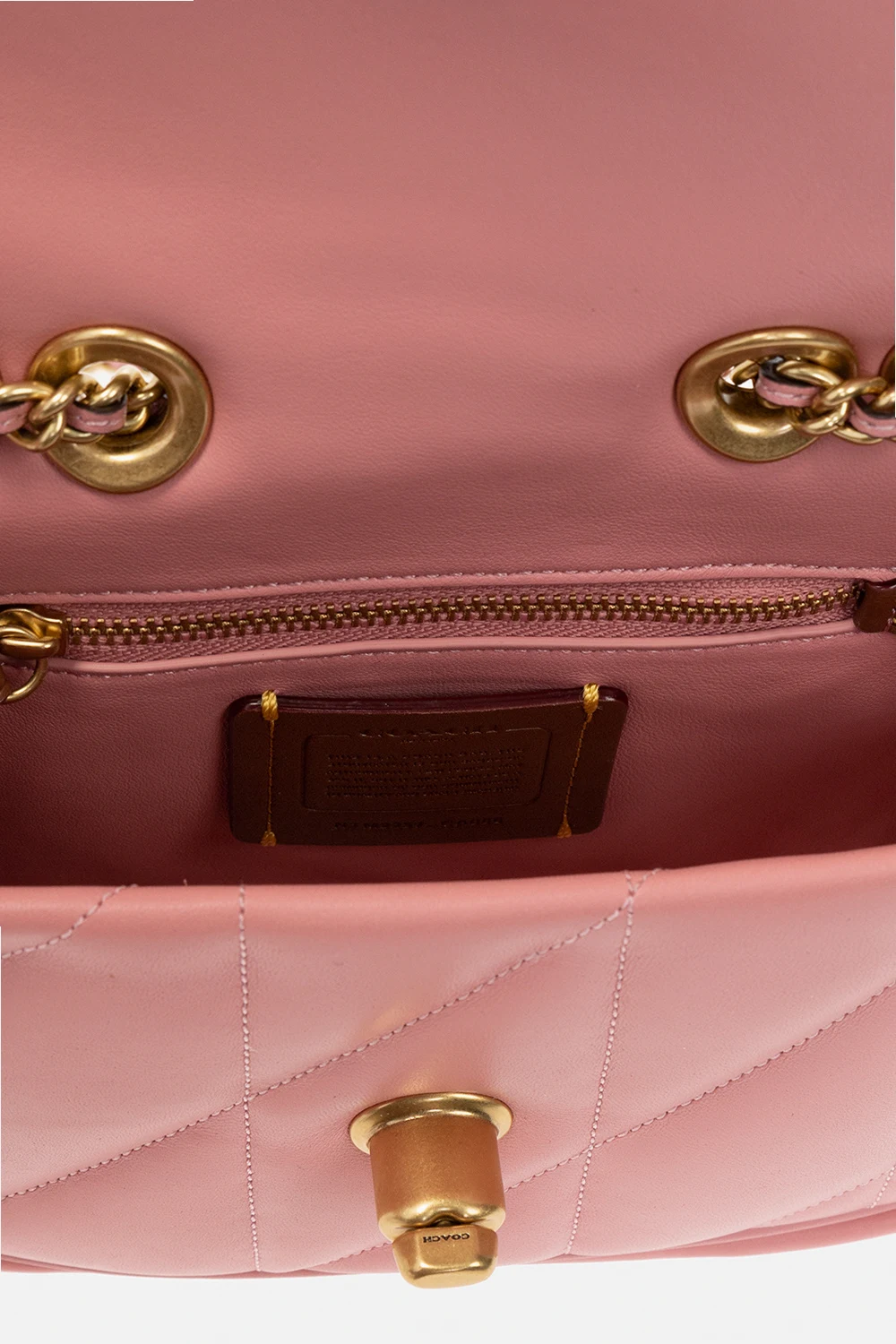 Pink 'Pillow Madison 18' quilted shoulder bag from Coach. Made of leather, this design features a twist closure with a raised logo, back pocket, adjustable shoulder strap with a chain, gold-tone metal hardware and one internal compartment with one zip pocket and three card slots.