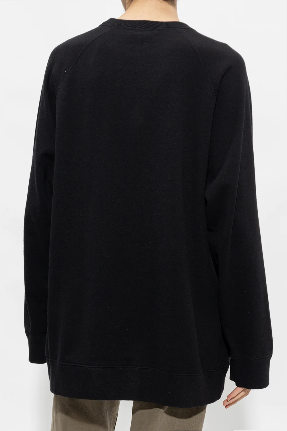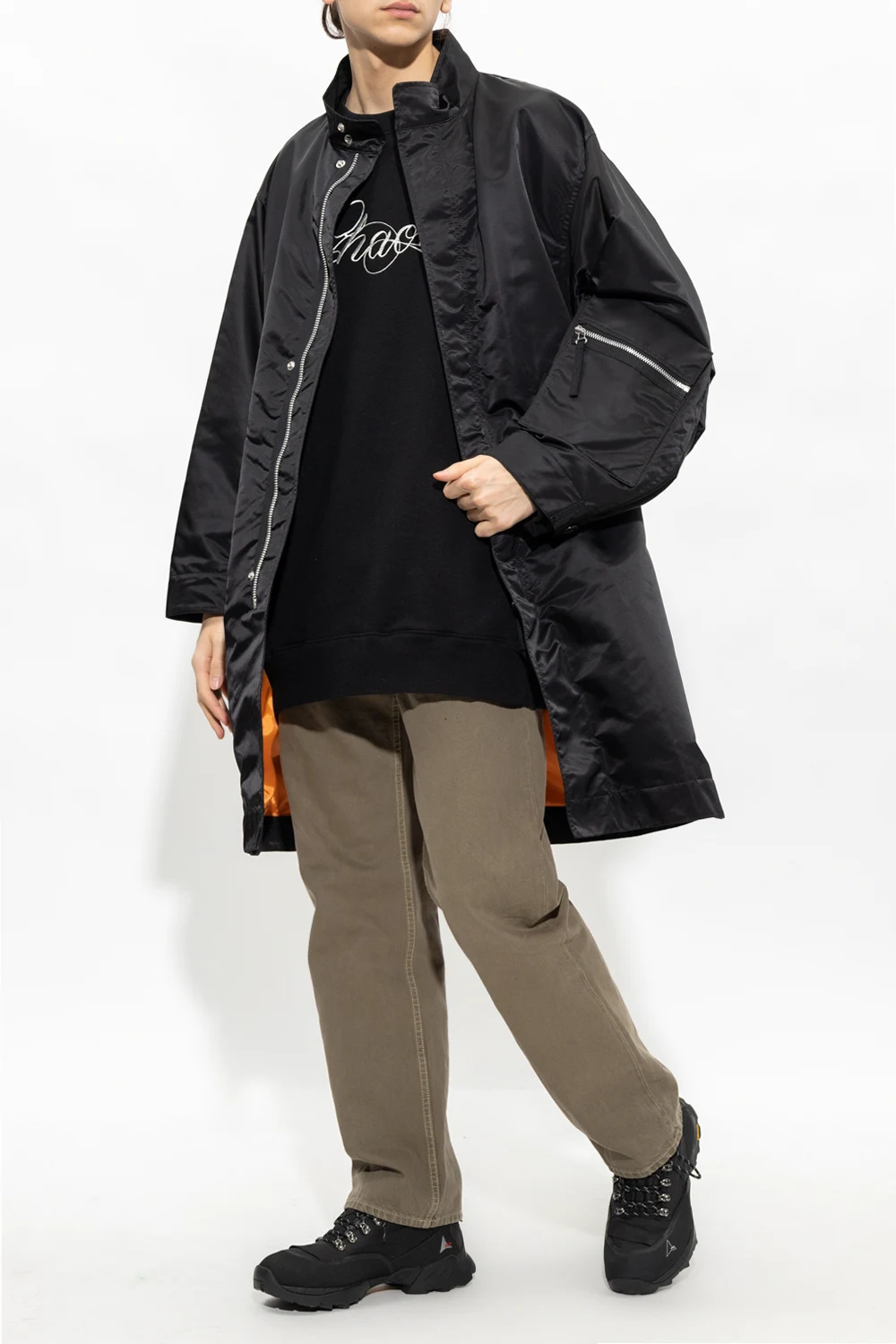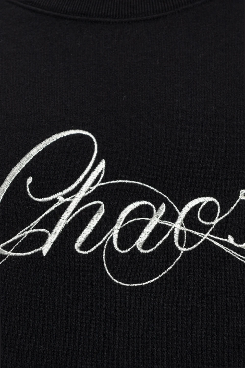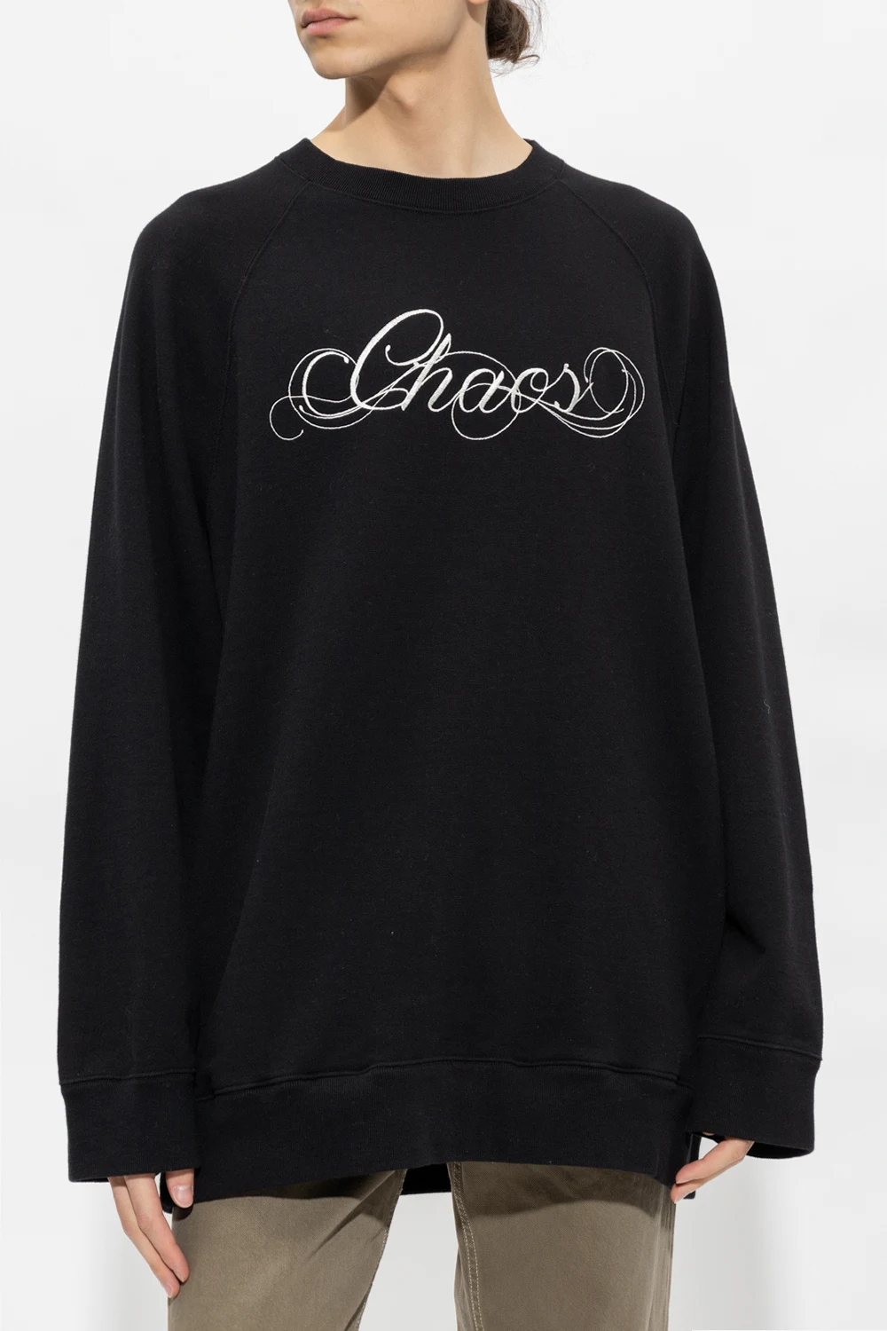 Black crewneck sweatshirt from Undercover. Crafted from cotton with a relaxed fit, this style showcases white ‘Chaos’ lettering embroidered on the front, two slip pockets, long sleeves and ribbed trims on the edges.