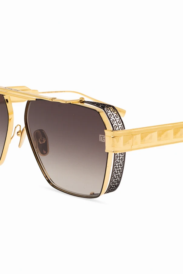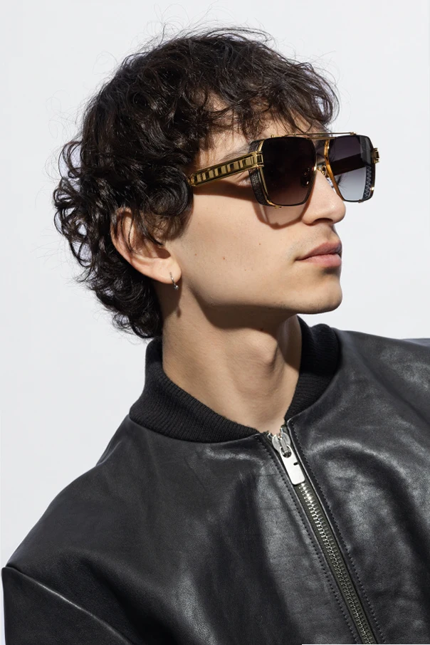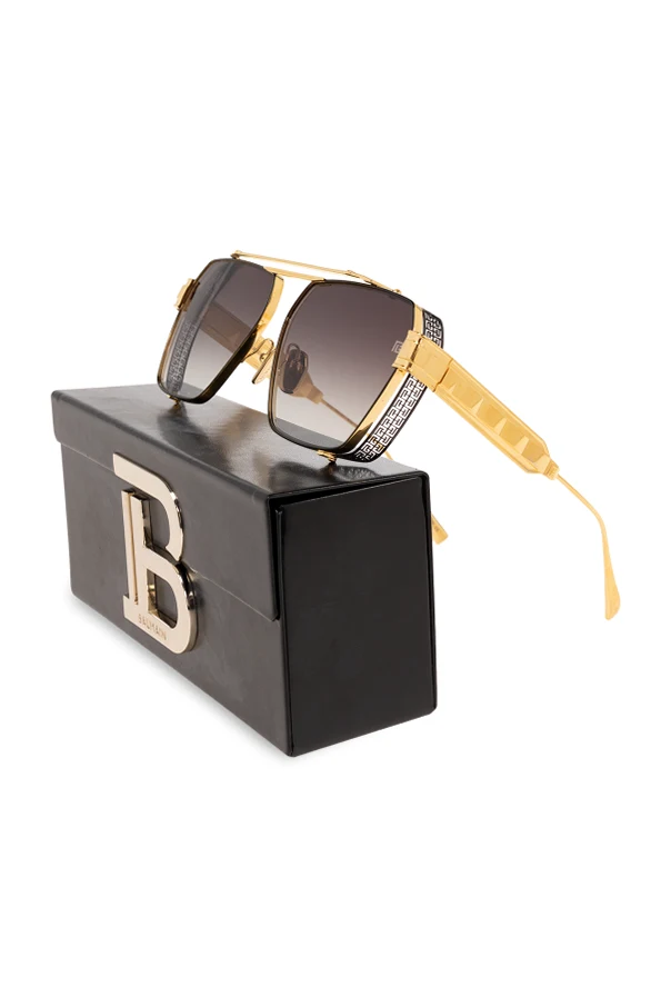 Gold-tone and black ‘Premier’ aviator sunglasses from Balmain. Crafted from titanium, this model features a double bridge with a logo and adjustable nose pads, openwork panels with a monogram motif on the sides, decorative temples and grey lenses with blue light and UV protection. Case included.