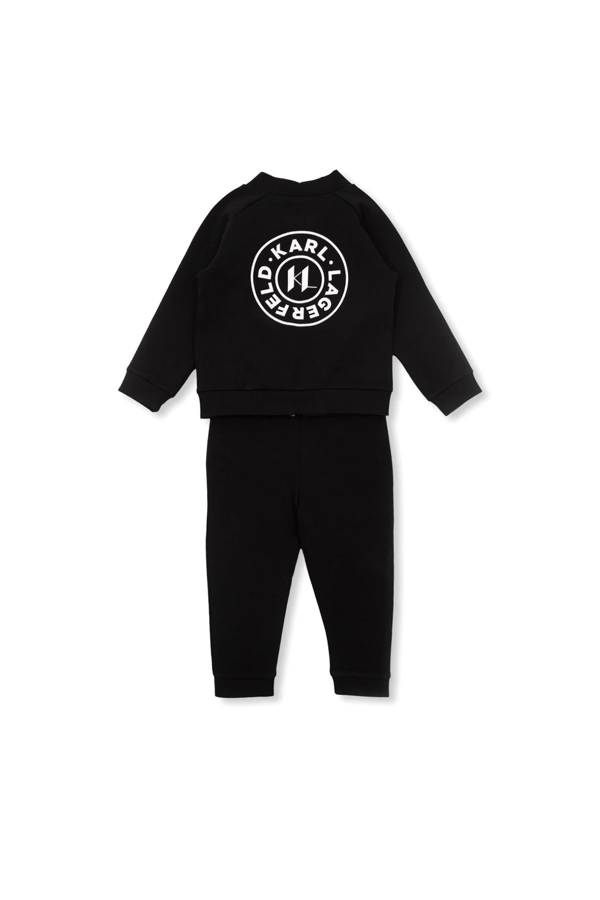 Black and white sweatpants, T-shirt & sweatshirt set from Karl Lagerfeld Kids. Made of cotton. The set includes sweatpants with an elastic drawstring waistband, a T-shirt with a logo print and a zip-up sweatshirt with a white pattern.