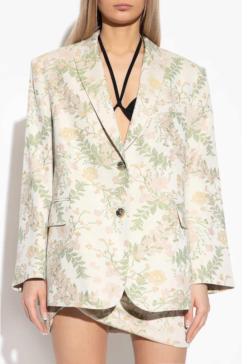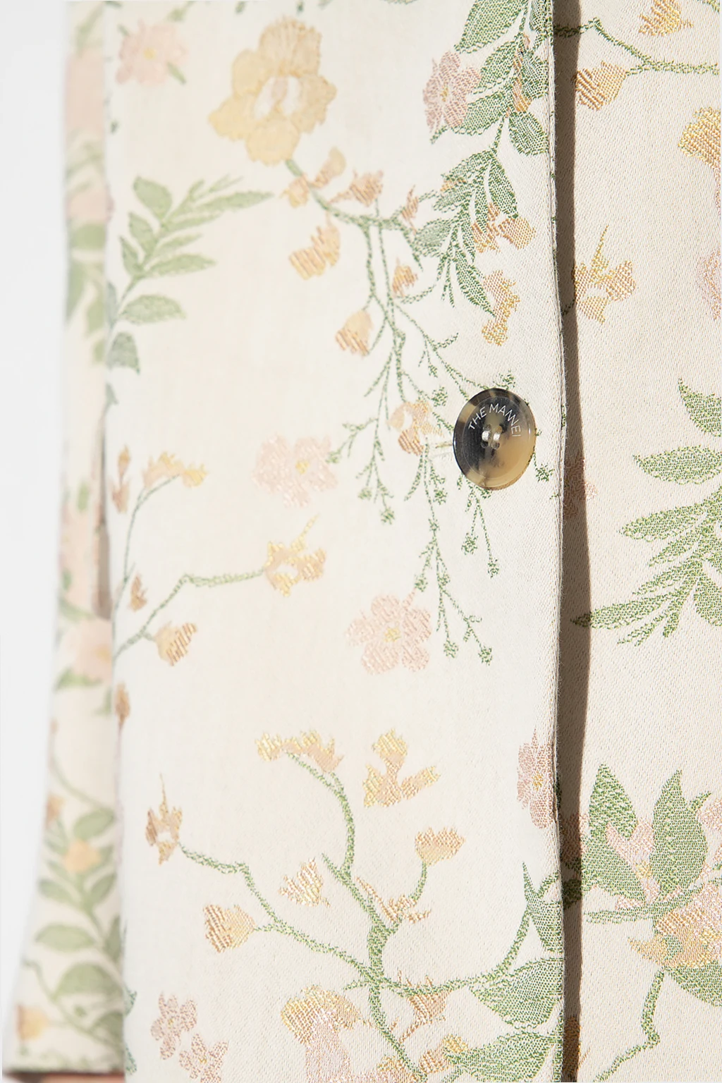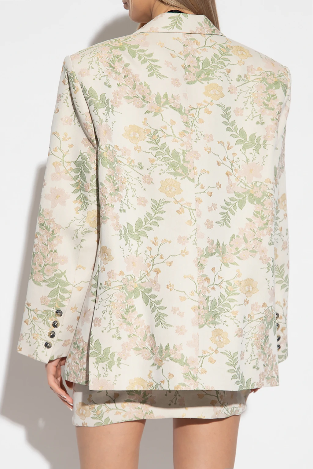 Cream ‘Mafraq’ single-breasted blazer from The Mannei. Made in part from cotton, this garment features button fastenings, a multicolored jacquard floral motif, peak lapels, two flap pockets, one slip pocket, double rear vent and long sleeves with buttoned cuffs.