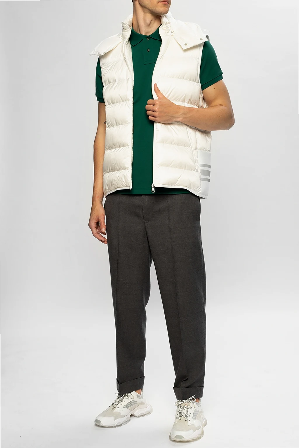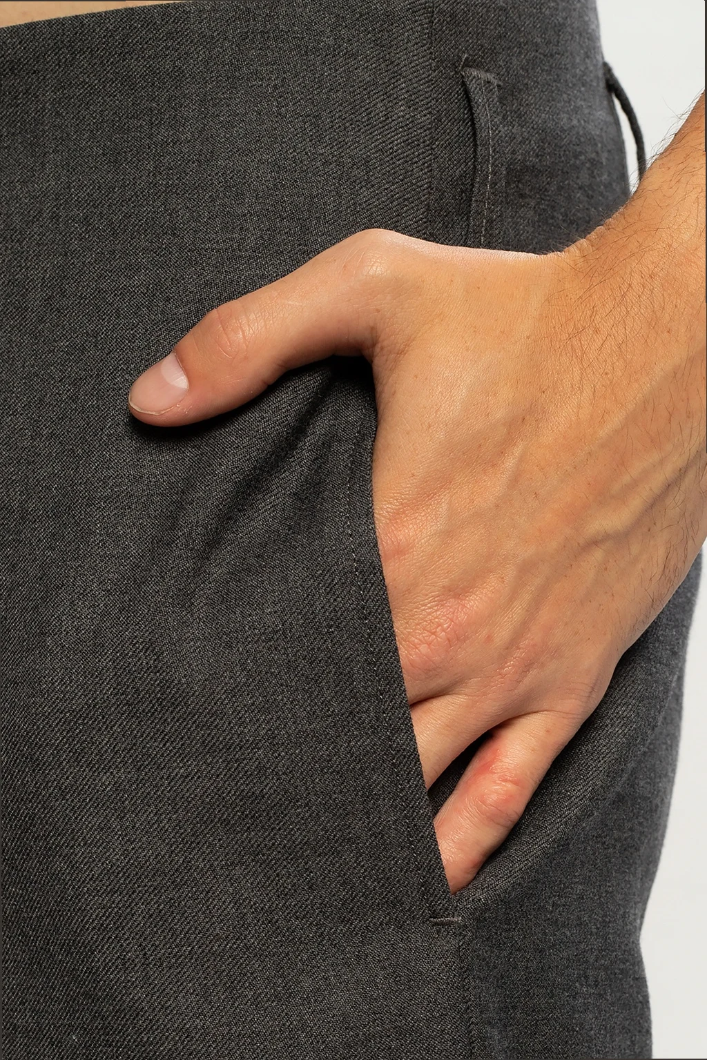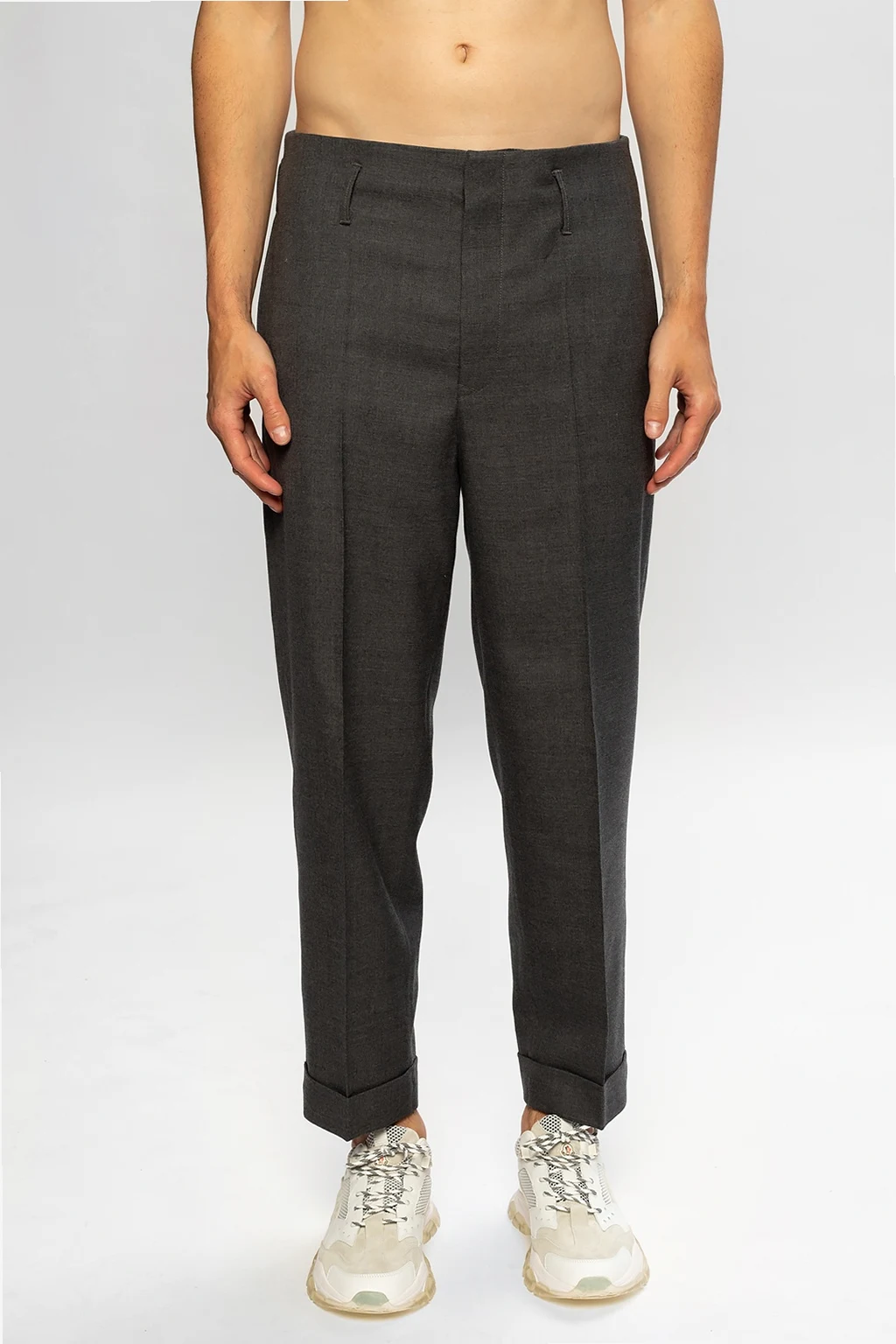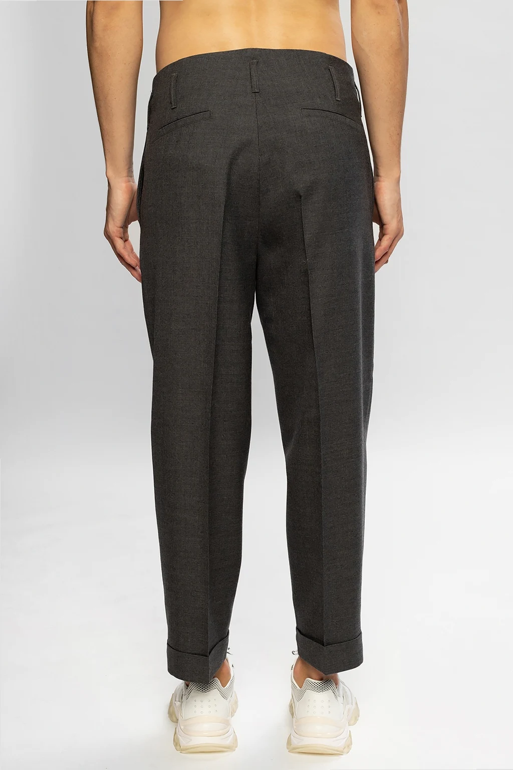 Grey trousers from Moncler Genius, ‘Fragment Hiroshi Fujiwara no.7’ collection. Made of wool. Zip, button and hook fastening. Two slip pockets on the front, two at the back. Tapered legs.