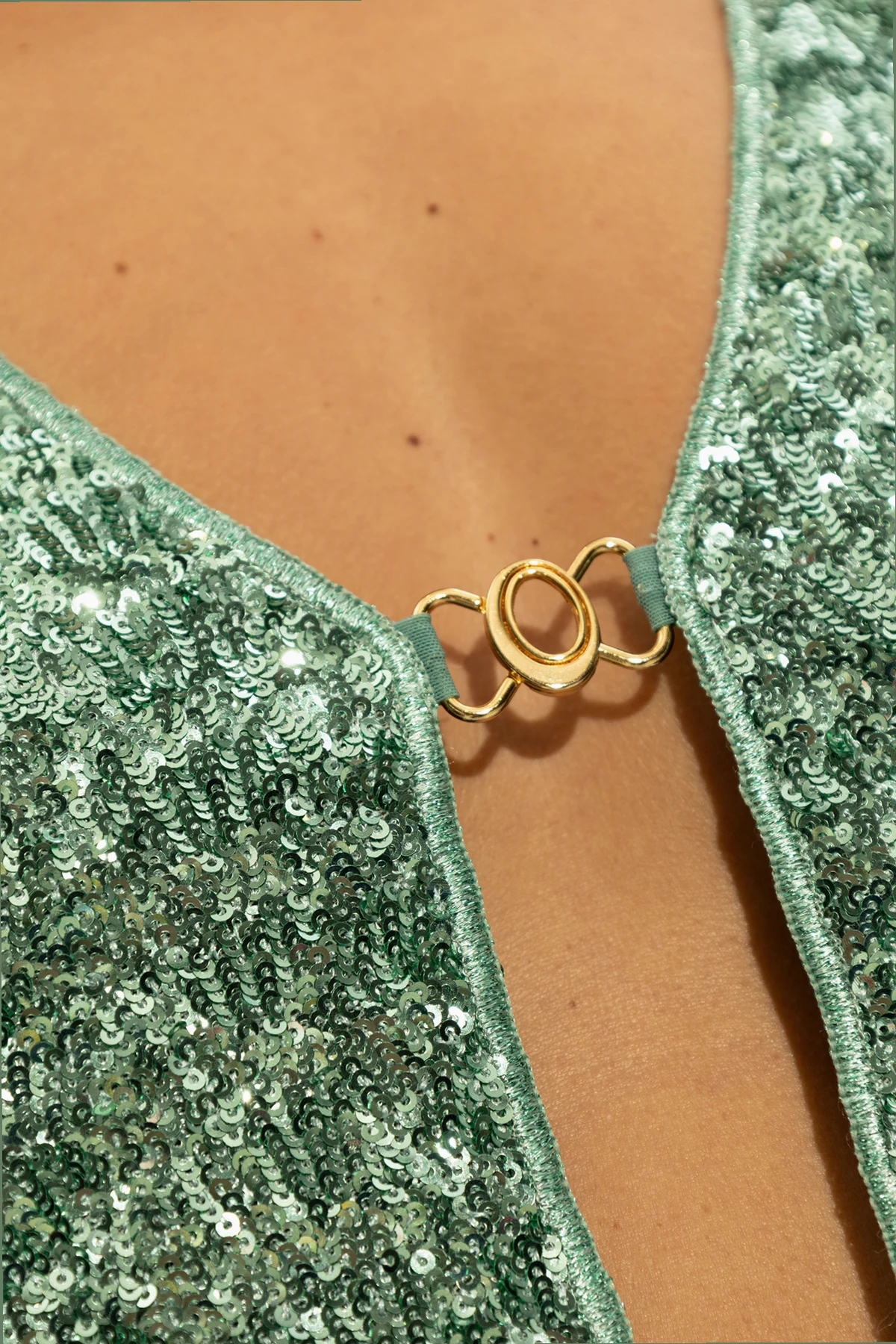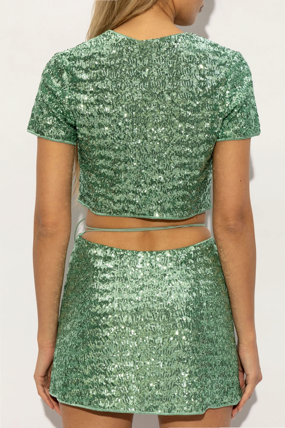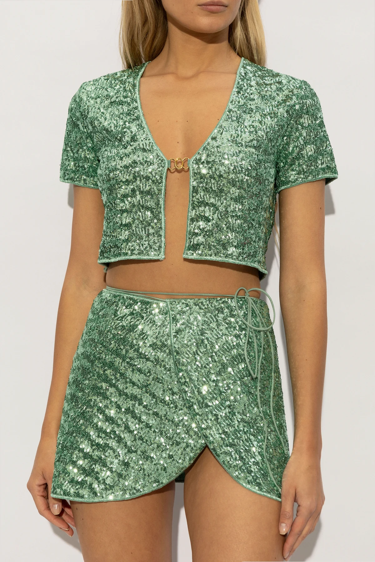 Charakterisiert durch eine lebendige grüne Farbe sowie ein glänzendes Finish mit glitzernden Pailletten, wird dieses Top zur Quintessenz des Luxus. Kurze Ärmel, die bis zur Mitte des Arms reichen, und ein tiefer V-Ausschnitt, akzentuiert durch eine einzigartige goldene Metallverschluss, unterstreichen seine außergewöhnliche Konstruktion. Der Schnitt des Tops, mit kurzem Schnitt und dezentem Bauchfrei-Look, bietet die Möglichkeit, ein harmonisches Ensemble mit einem hoch geschnittenen Unterteil zu kreieren, und bietet unzählige Styling-Möglichkeiten.