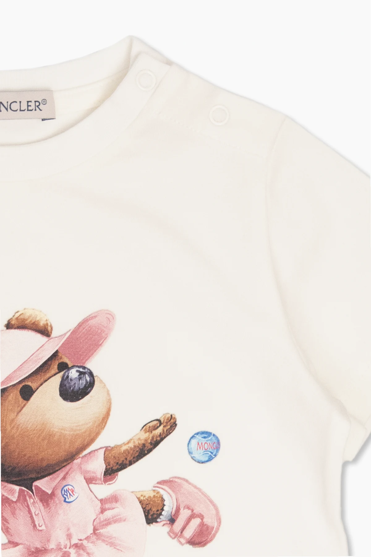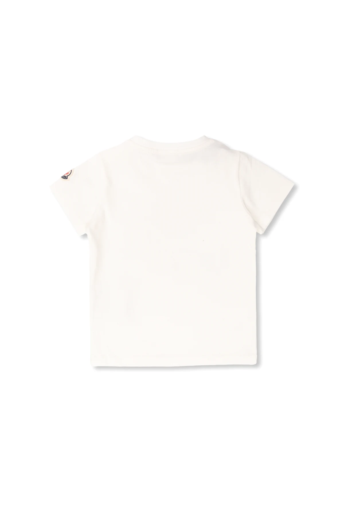 White crewneck T-shirt from Moncler Enfant. Made of cotton, this style is embellished with a colourful graphic print on the front and features short sleeves – one has a colourful logo patch.