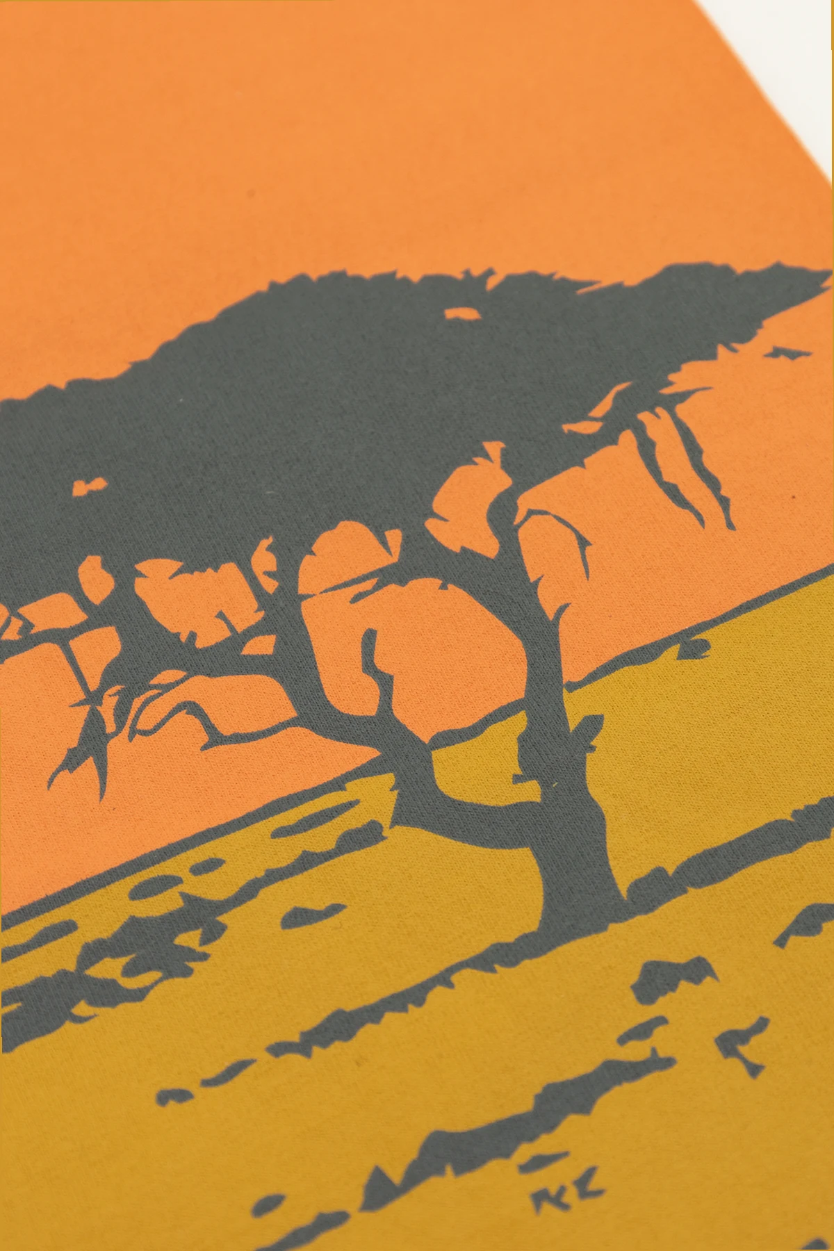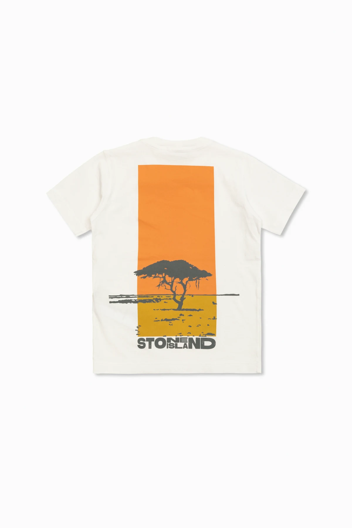 Dieses weiße T-Shirt im klassischen Schnitt mit kurzen Ärmeln begeistert durch subtile Details. Auf der Vorderseite befindet sich ein dezentes Logo in Form eines runden Aufnähers, während die Rückseite mit einem majestätischen Druck eines Landschaftsmotivs auf einem orangefarbenen Feld mit der Aufschrift "STONE ISLAND" verziert ist.