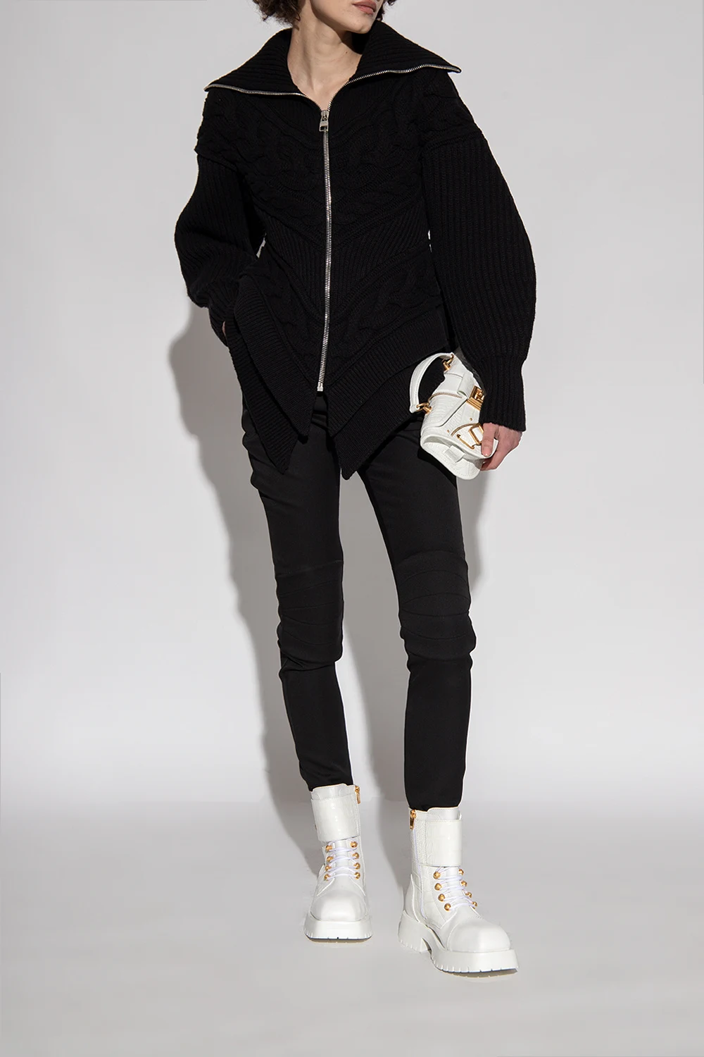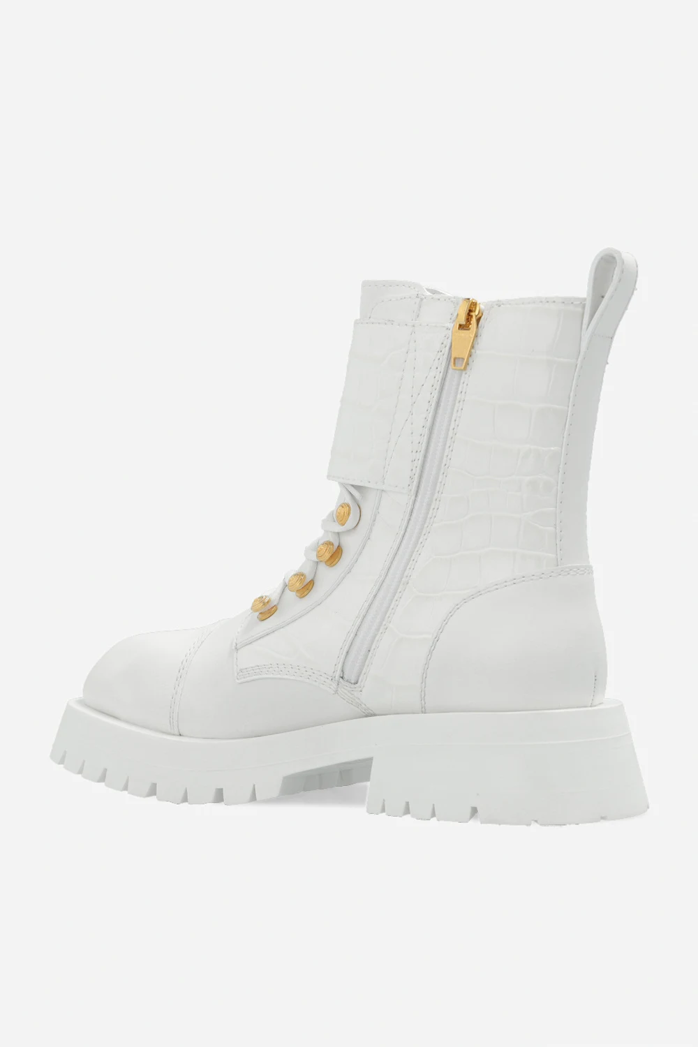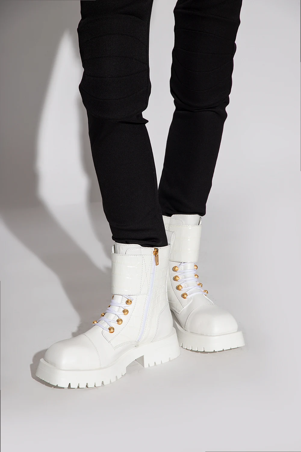 White ‘Ranger Romy’ ankle boots from Balmain. Crafted from leather with a crocodile skin effect, this lace-up model sits on a white rubber sole and features a side zipper and gold-tone applications with an embossed logo.