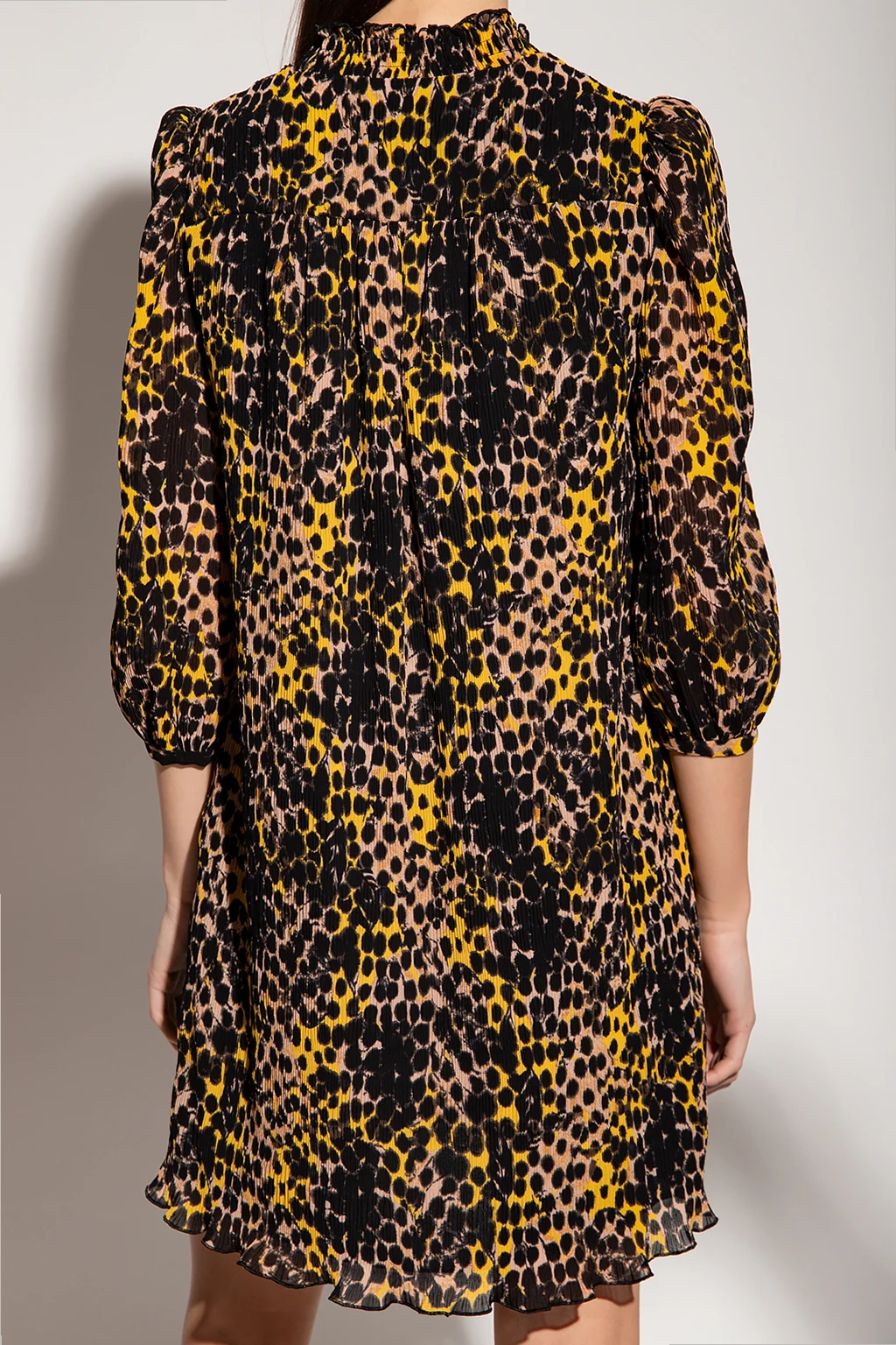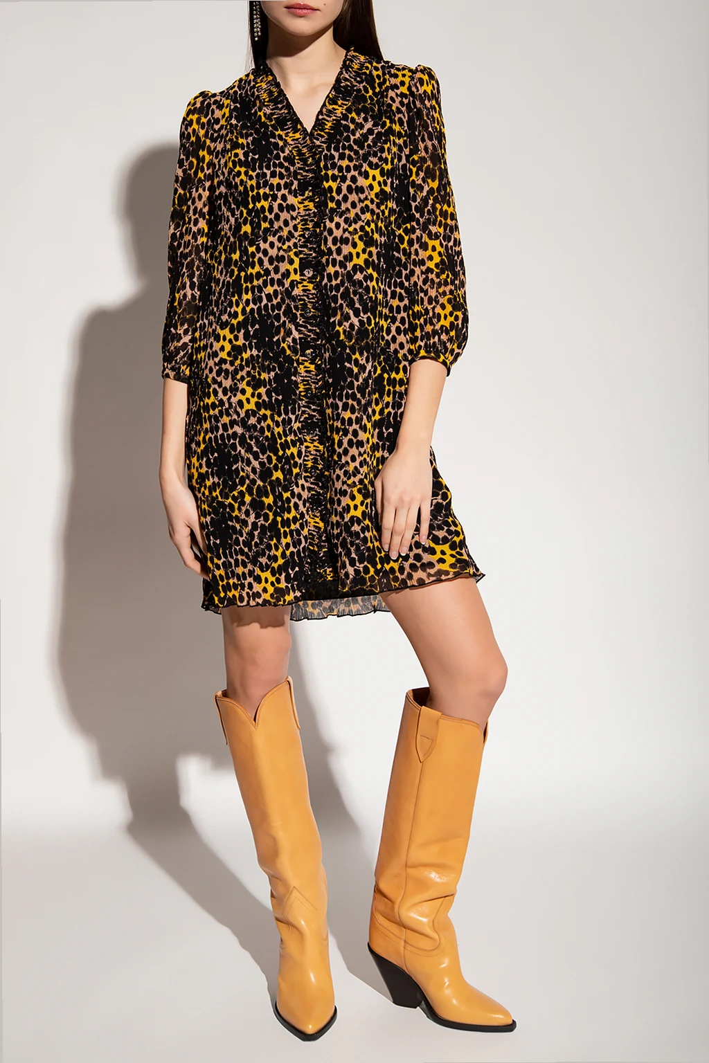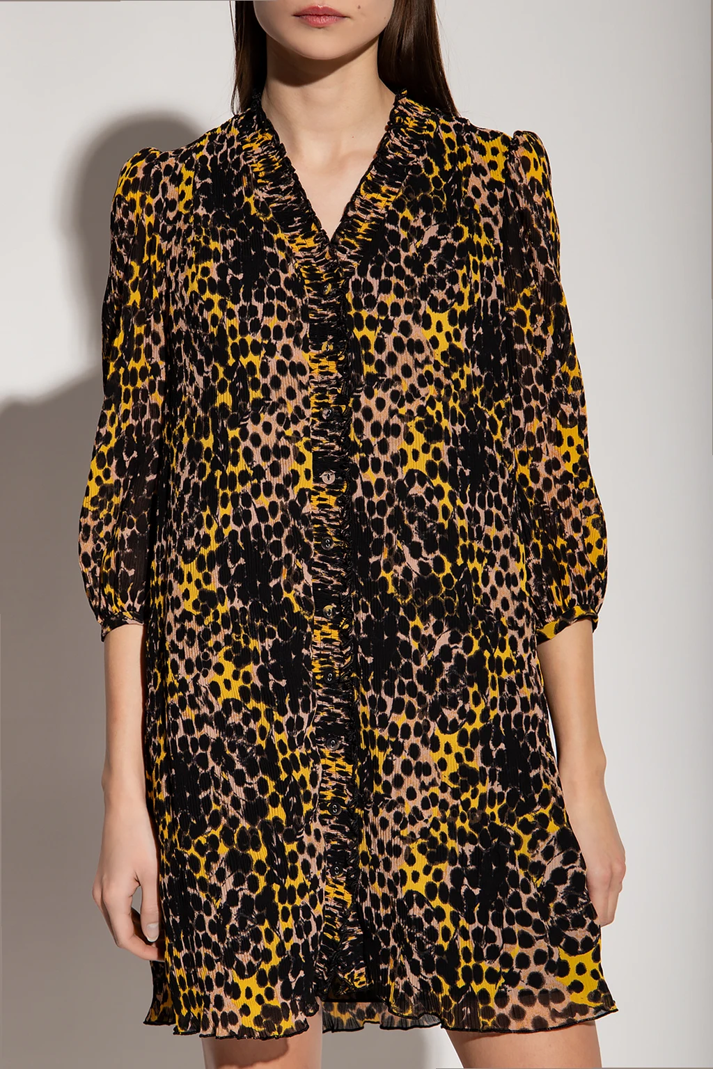 Beige, yellow and black ‘Layla’ dress with animal motif from Diane Von Furstenberg. Fastened with buttons, this V-neck design is decorated with an animal pattern and has puff sleeves with decorative trimming.