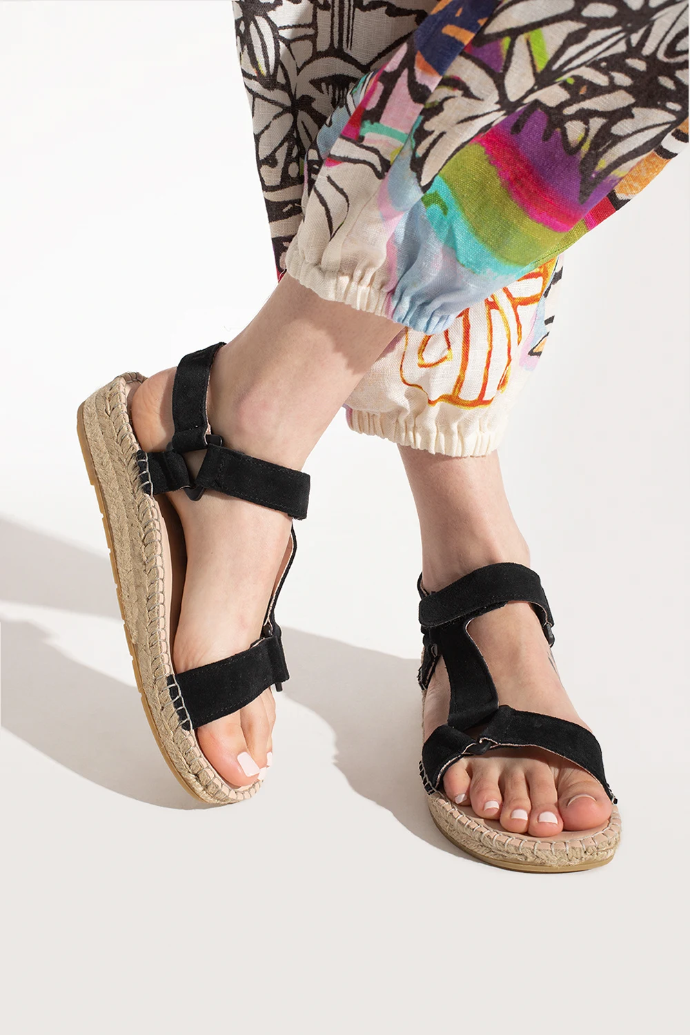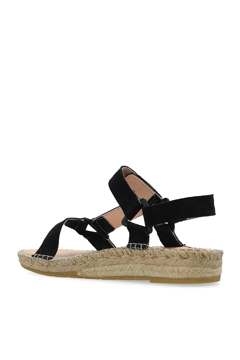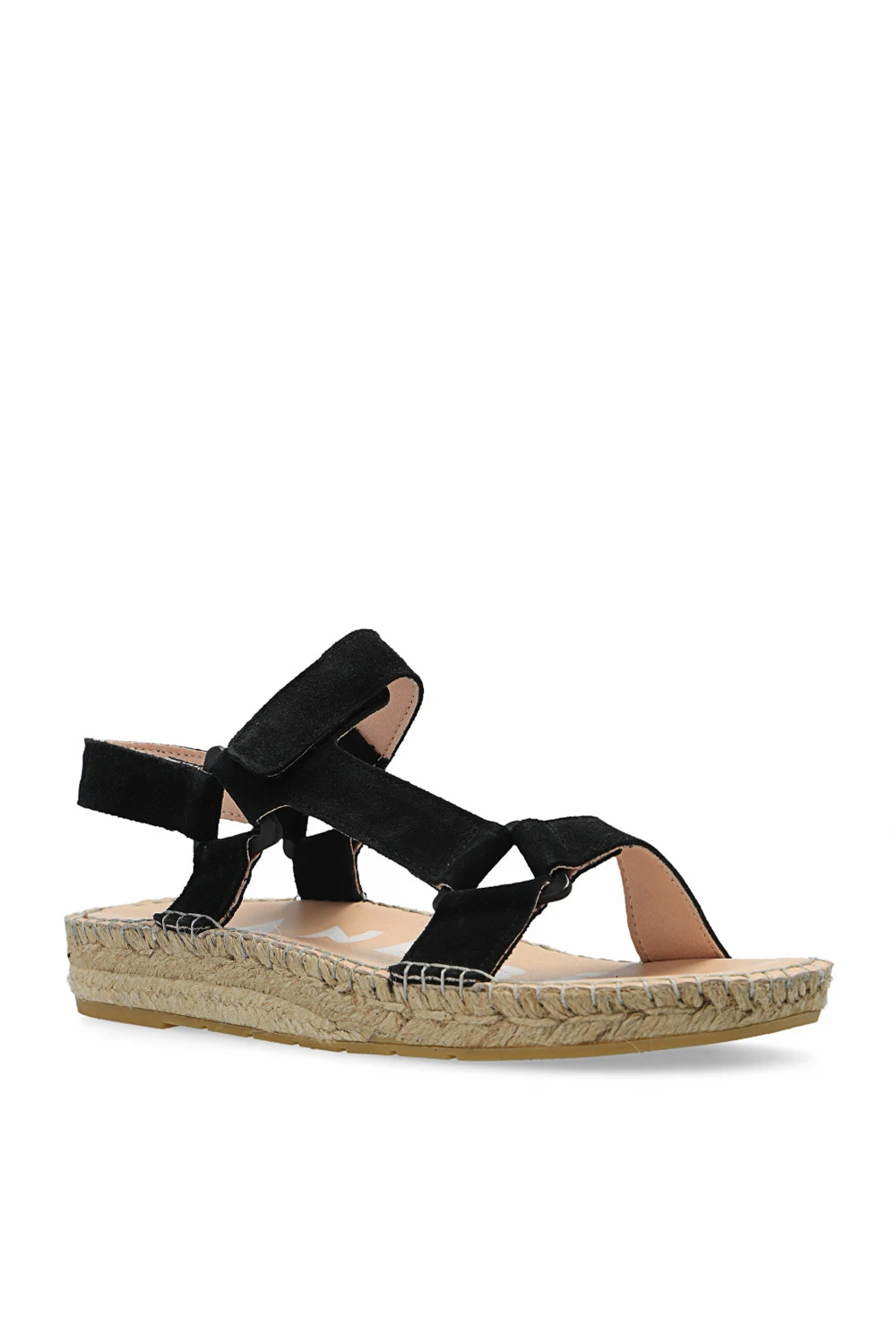 Black ‘Hamptons’ sandals from Manebi. Made of leather, this model features a velcro fastener, an embossed logo at the back and a beige sole in woven jute and natural rubber at the base.