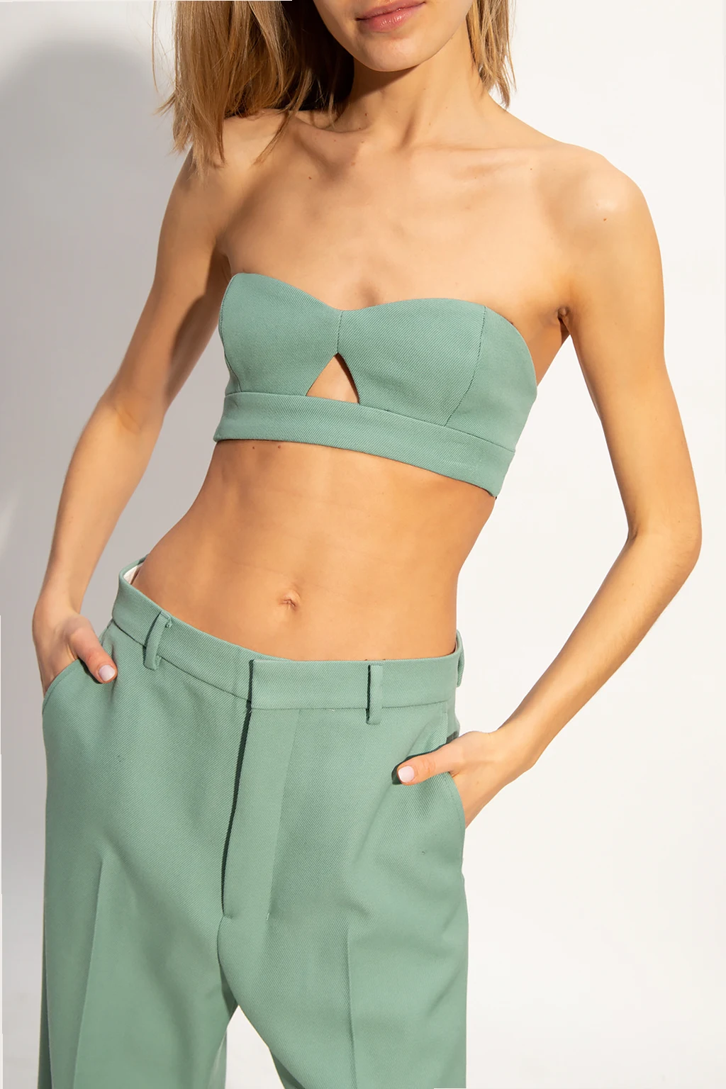 Green crop top with open shoulders from Ami Alexandre Mattiussi. Crafted from wool, this design features velcro fastening and a decorative cut-out.