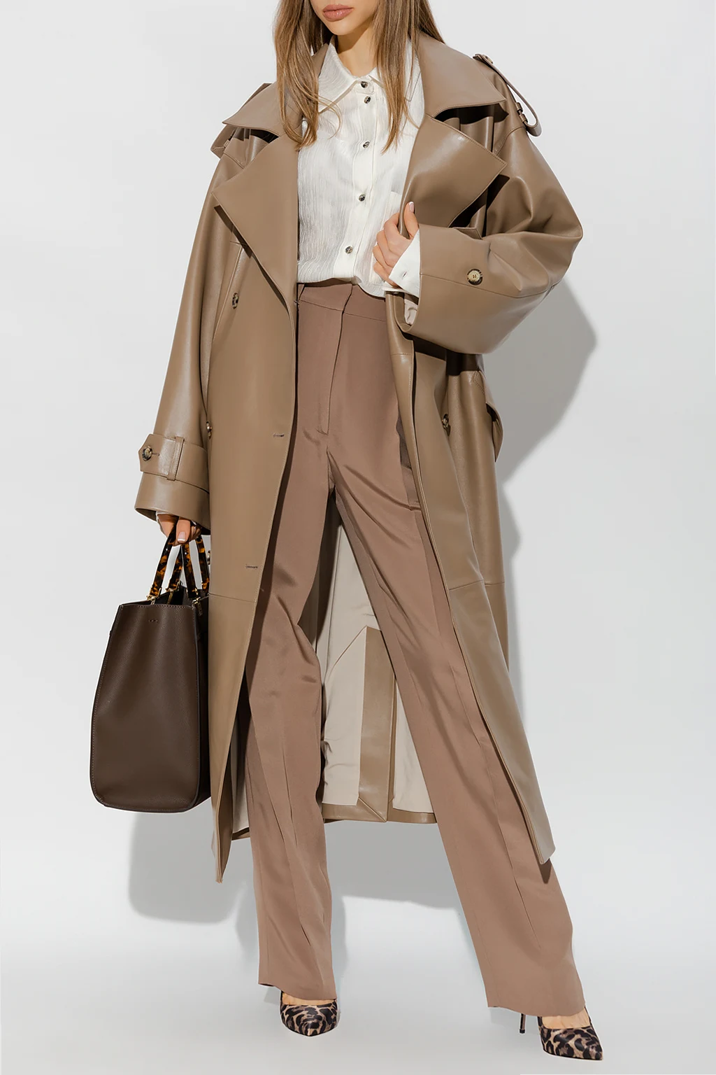 Beige ‘Nausa’ trousers from The Mannei. Made of silk with a high-rise waist, this pair falls with wide legs and features a zip fly with hooks, pleats and two frontal pockets.