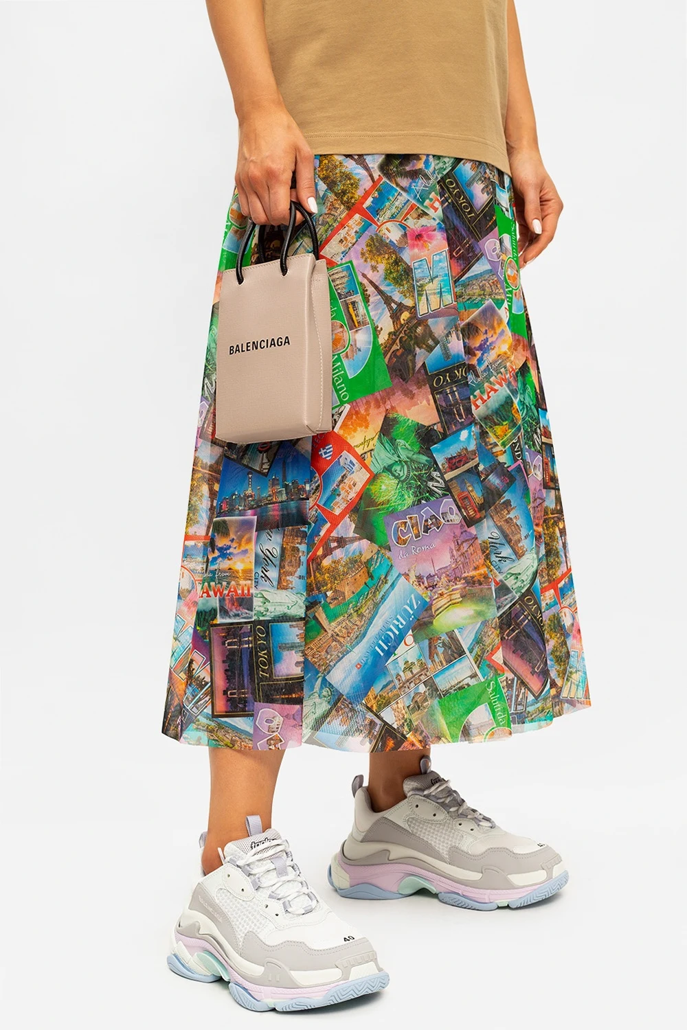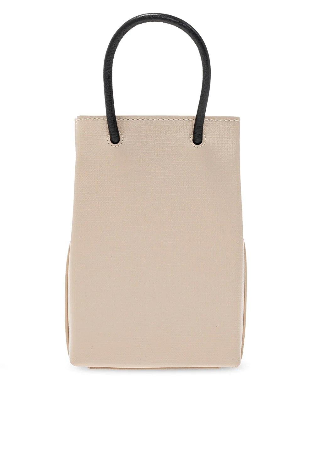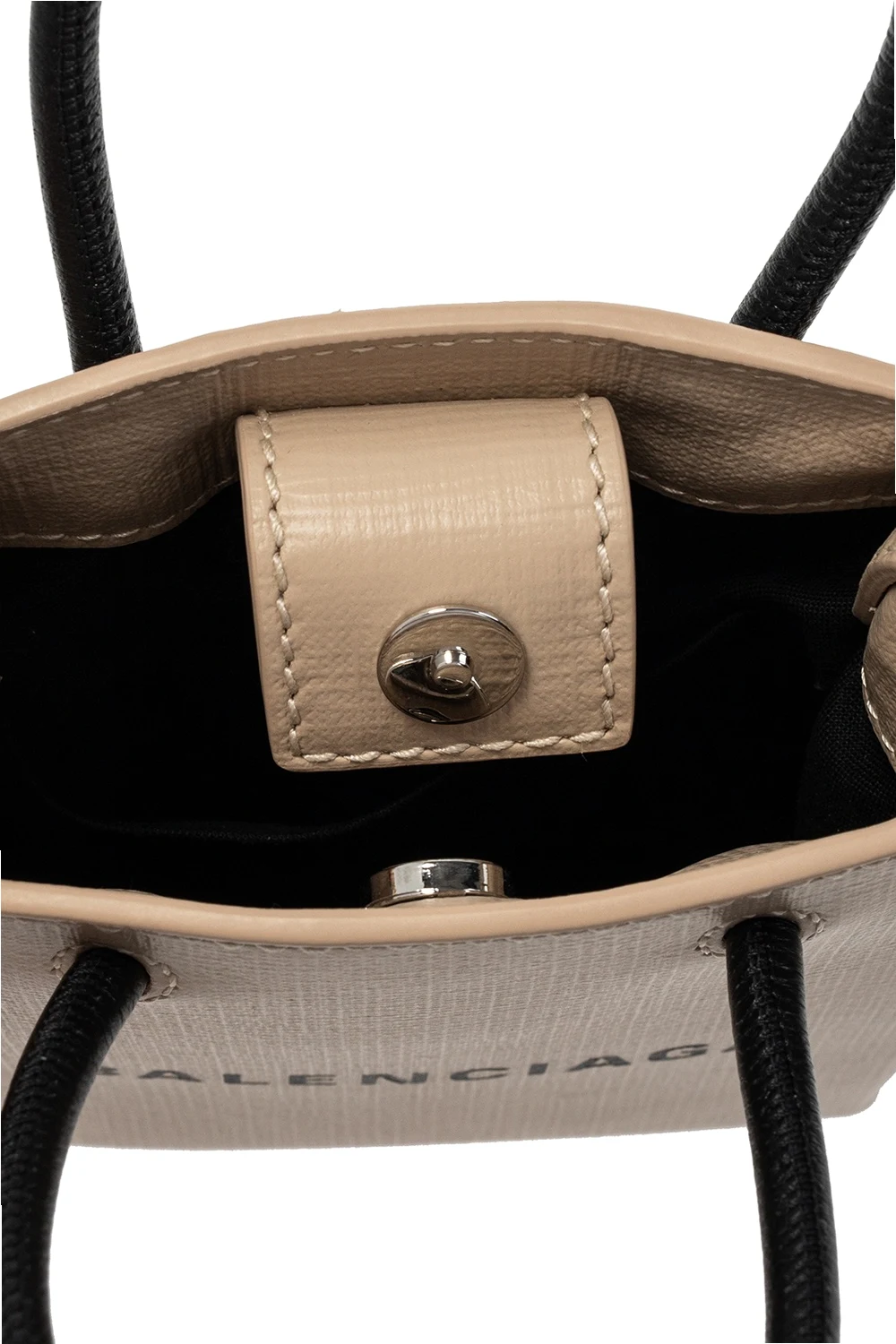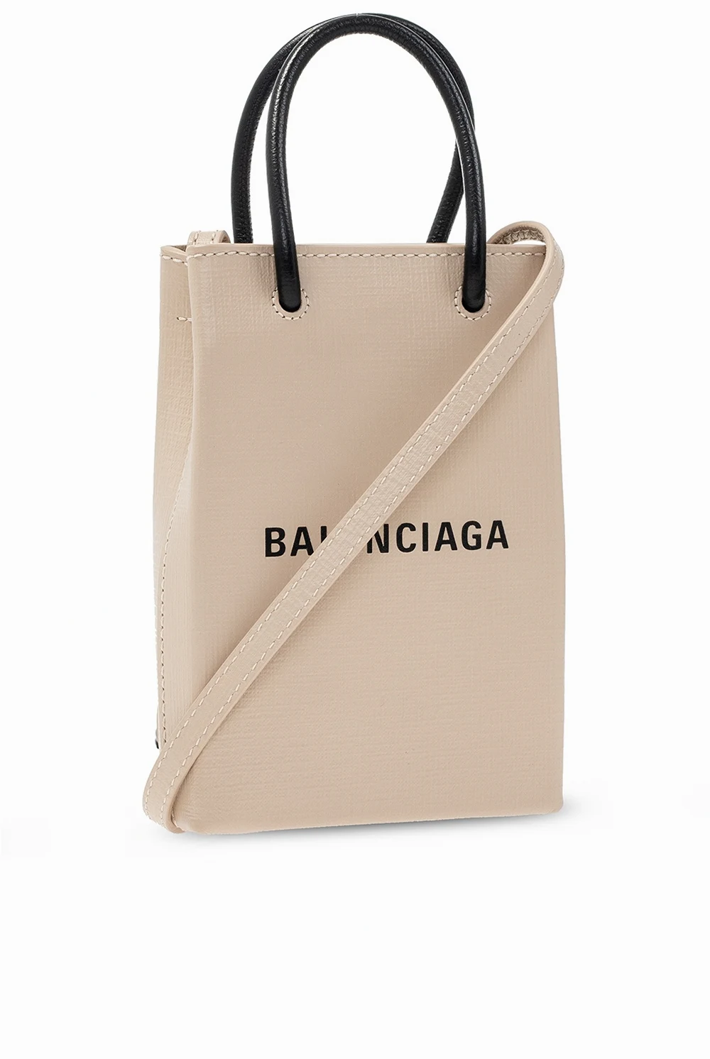 Beige ‘Shopping’ smartphone case from Balenciaga. Made of calf leather, this item secures with a snap and showcases a black logo print on the front, two half-round black handles, an adjustable shoulder strap, silver-tone metal hardware and one internal compartment with one slip pocket.