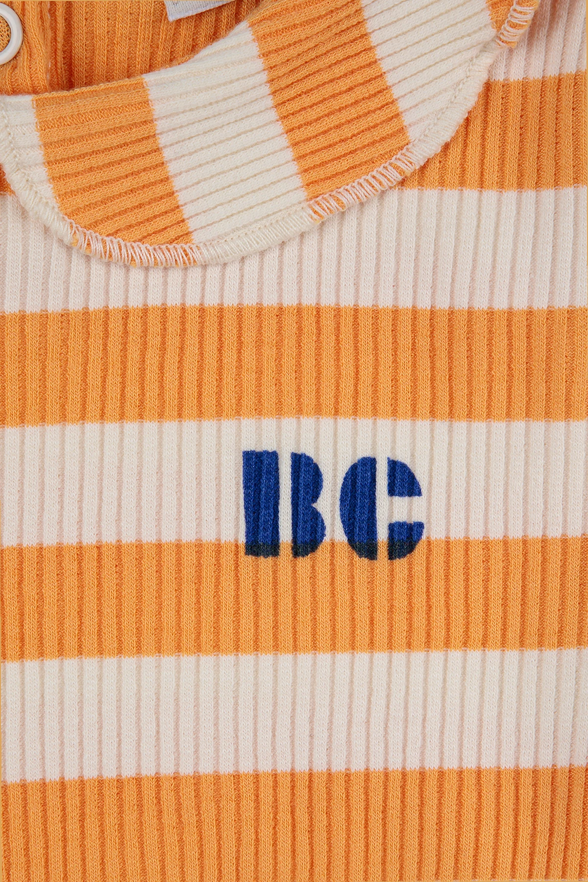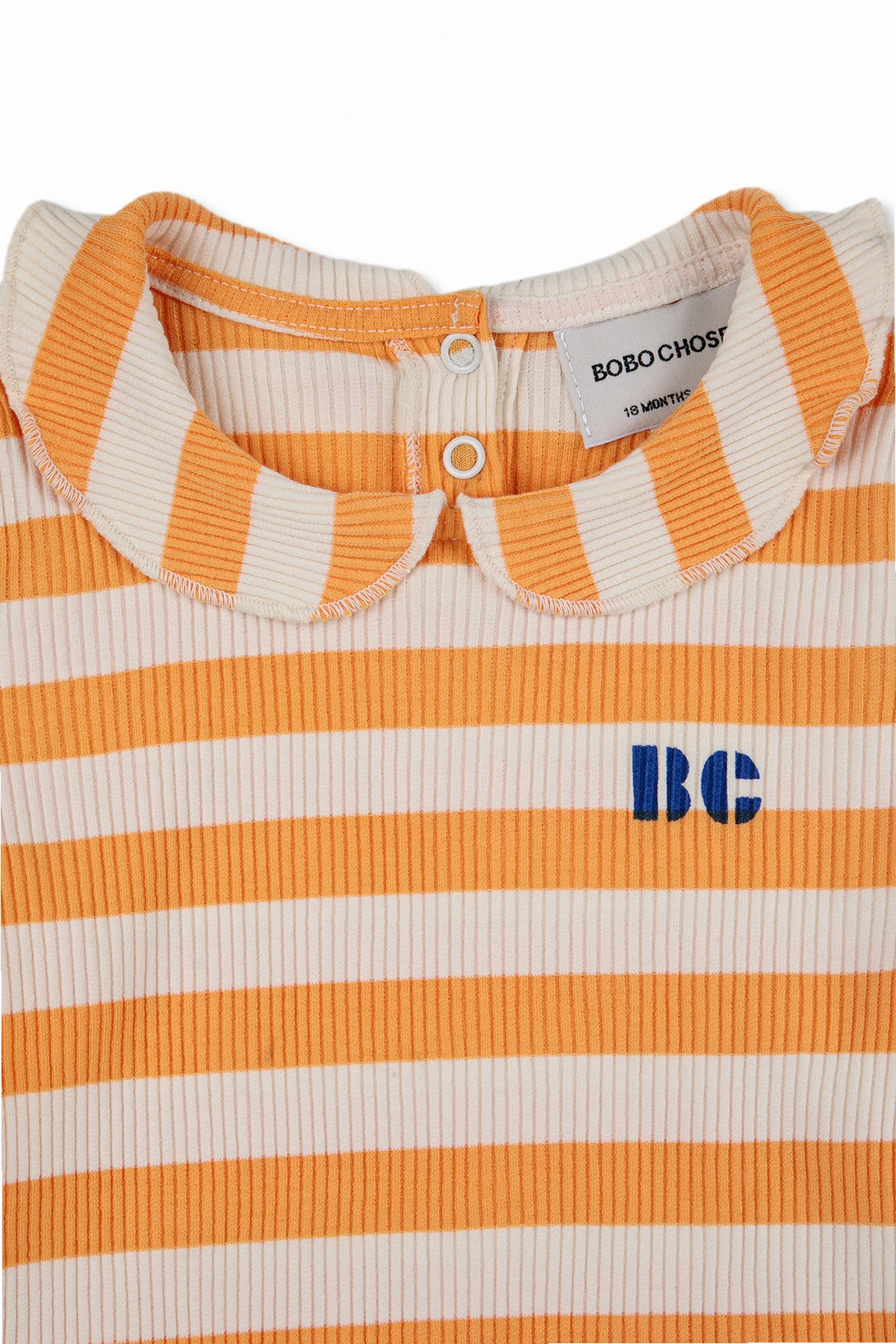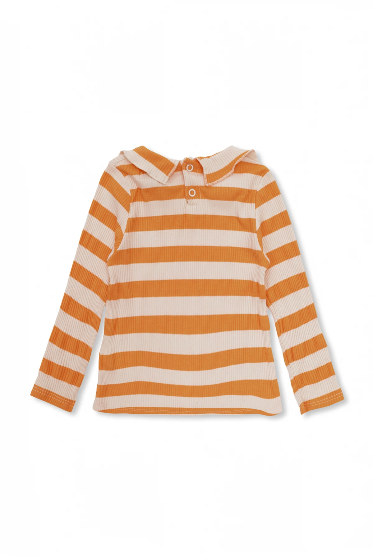 Cream and orange top from Bobo Choses. Fastened with a snap button, this long sleeve design features a stripe pattern, logo print and ruffles at the hem.