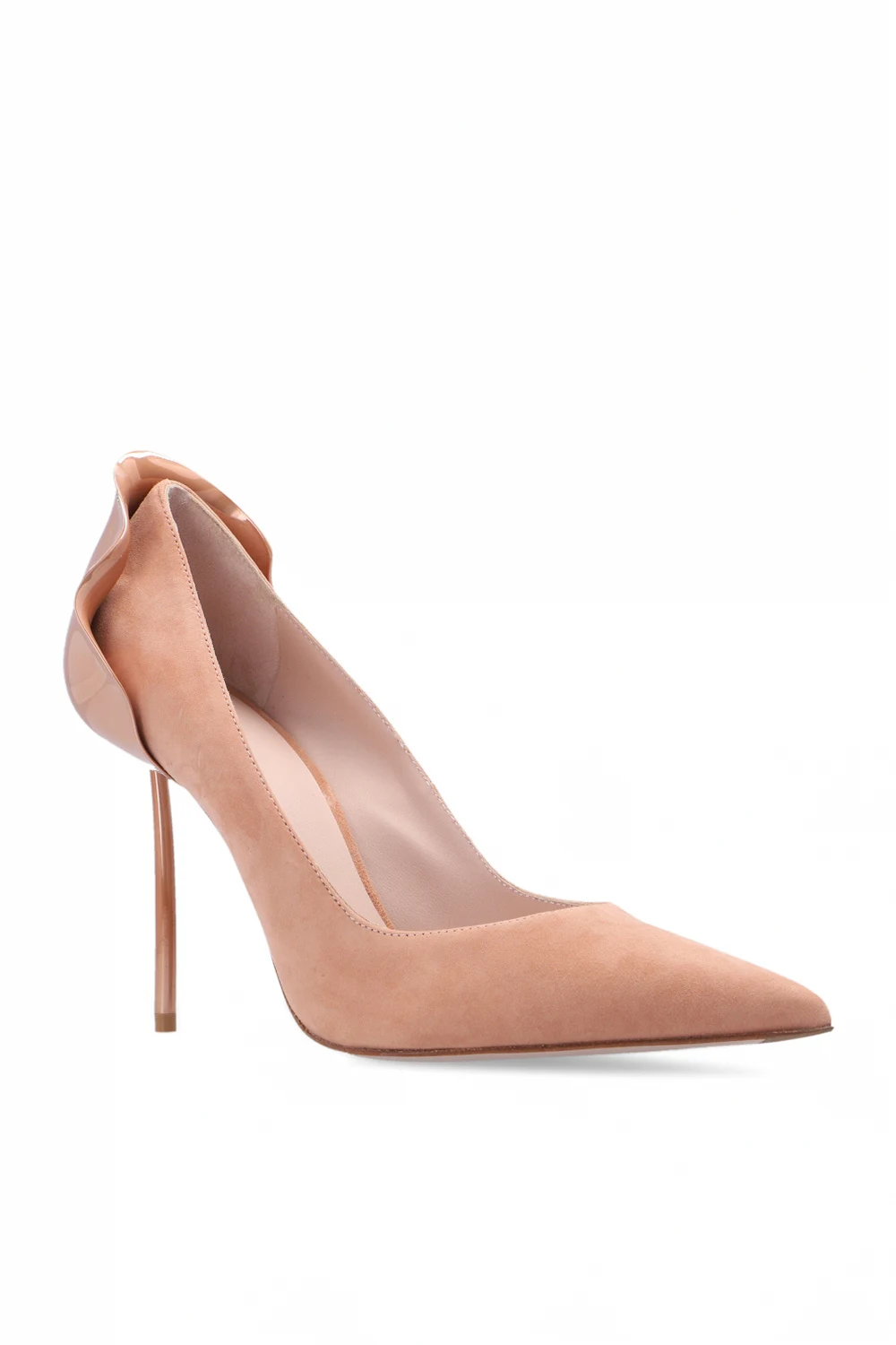 Blush pink 'Petalo' stiletto pumps from Le Silla. Handcrafted in Italy from suede, this model features a pointed toe silhouette, pink petal hardware at the back and a beige sole in leather and rubber.