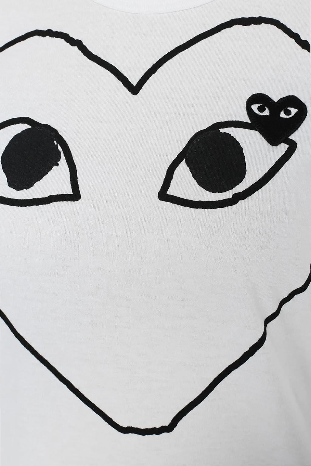 White cotton T-shirt from Comme des Garçons Play. Black heart-shaped patch and printed black heart on the front. Round neck. Short sleeves.