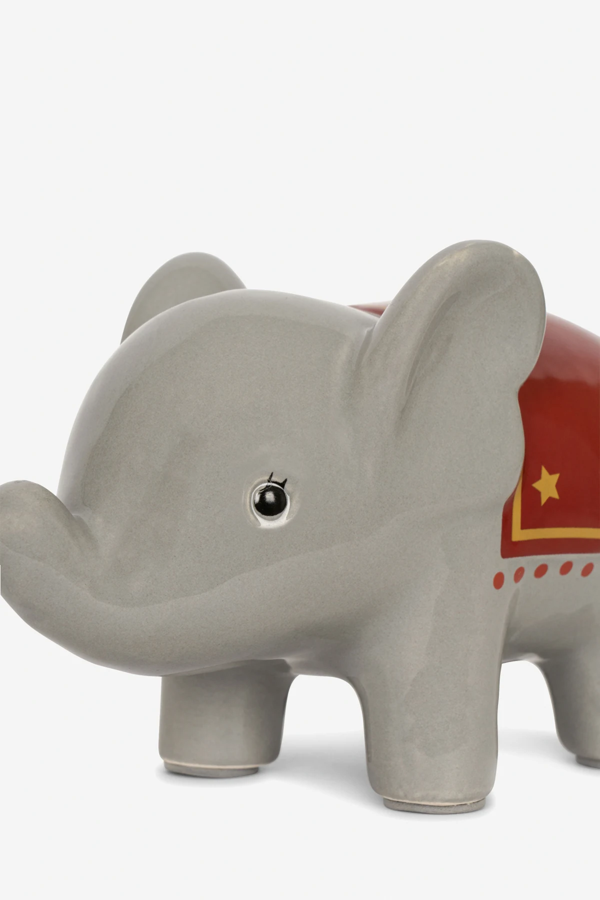 Grey, red and yellow ceramic money box in the shape of an elephant from Konges Slojd.