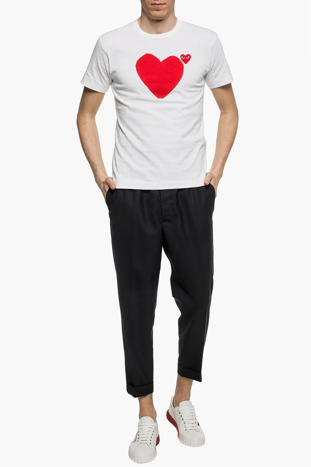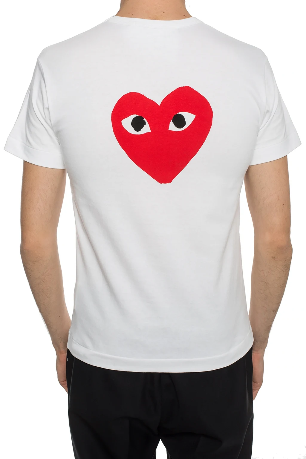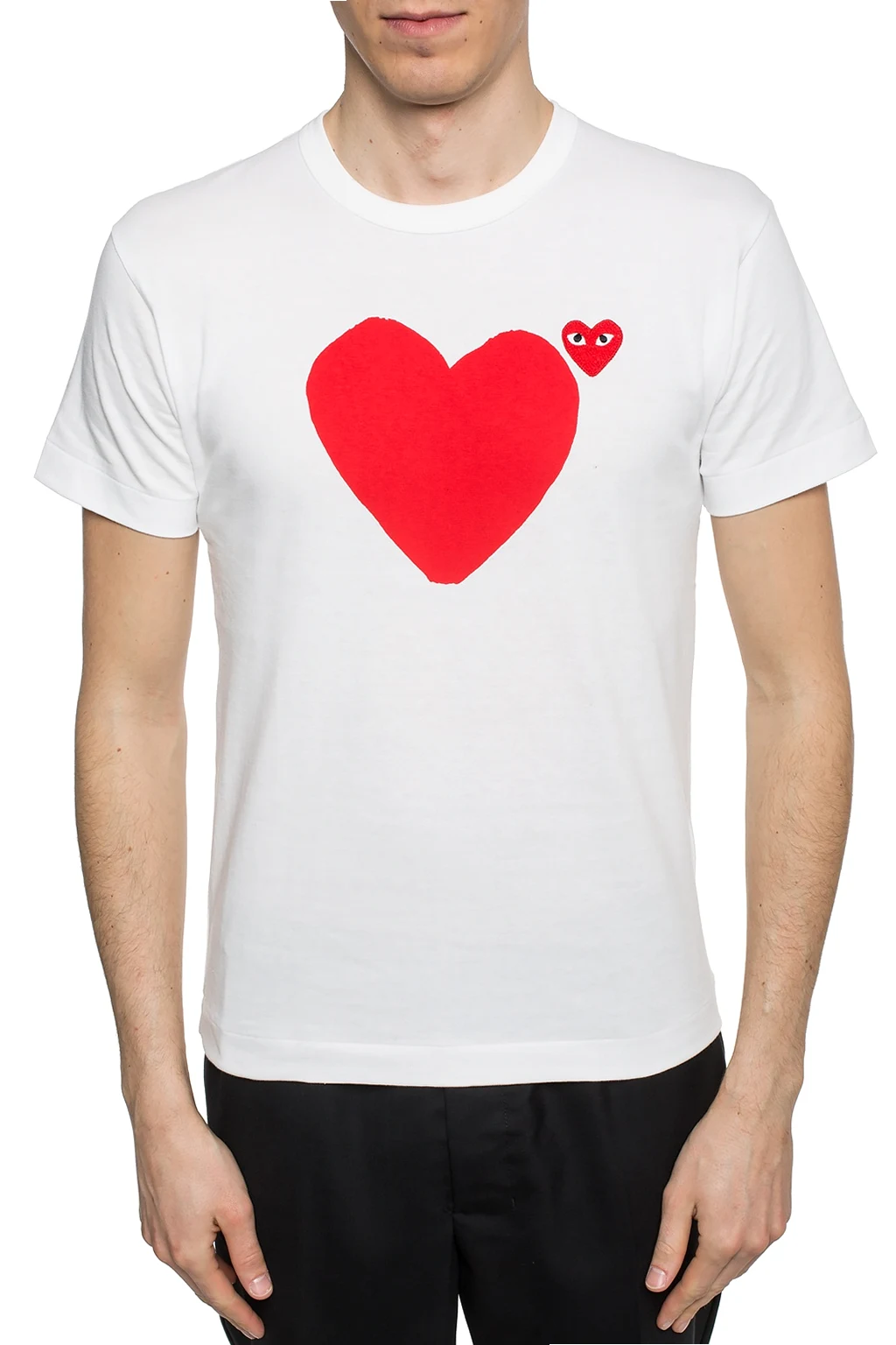 White T-shirt from Comme des Garcons Play. Made of cotton. Decorated with a heart print and a logo patch in red, black and white. Ribbed round neck.