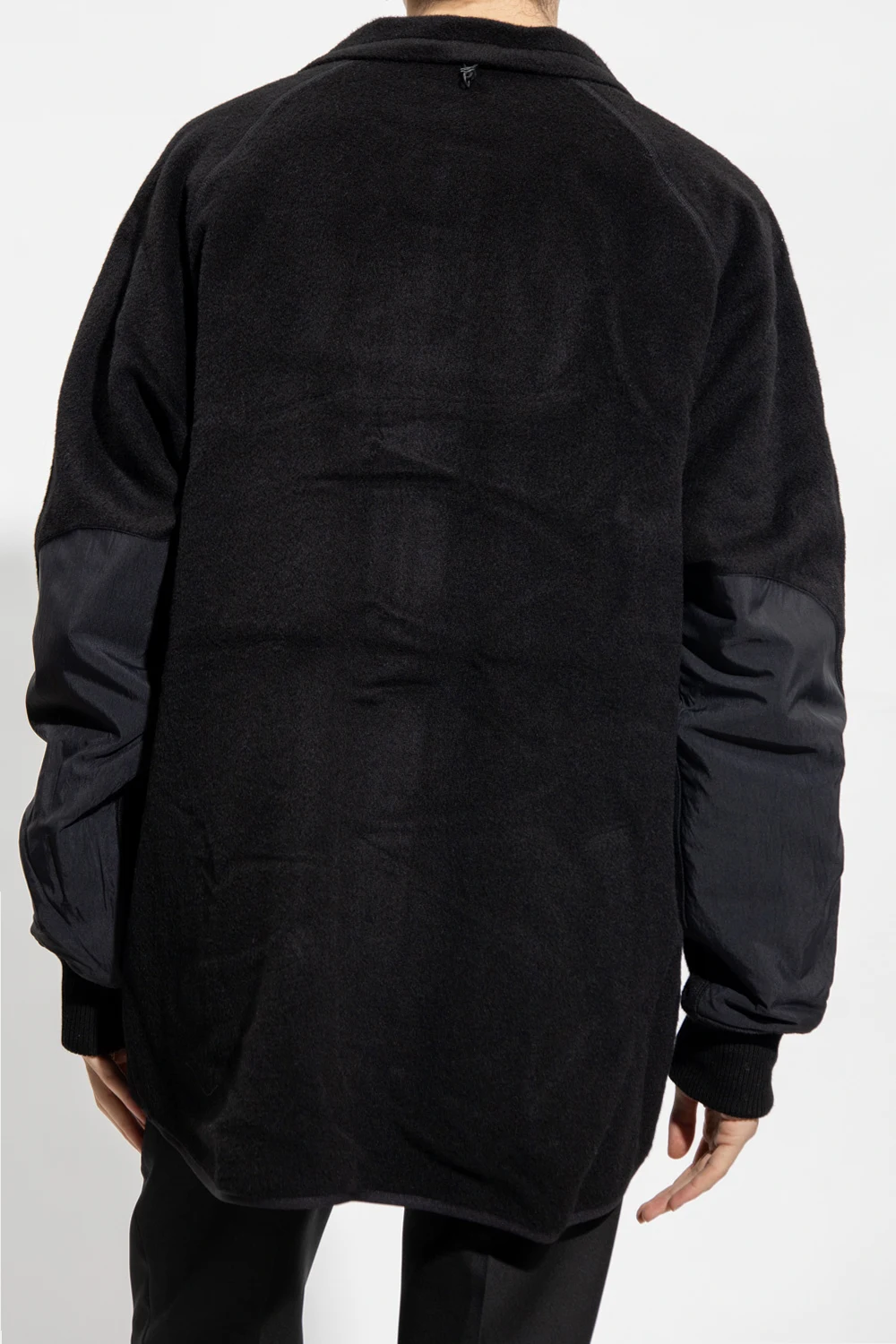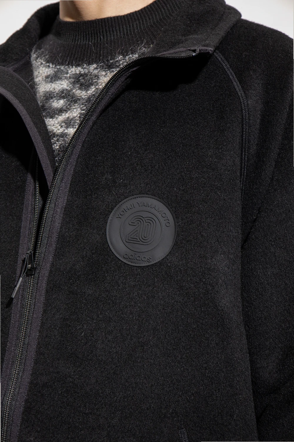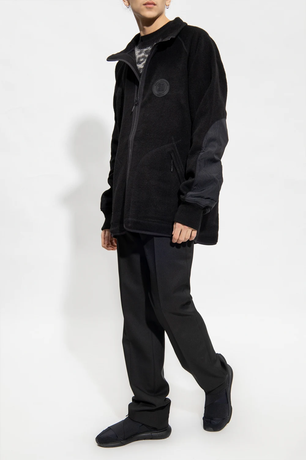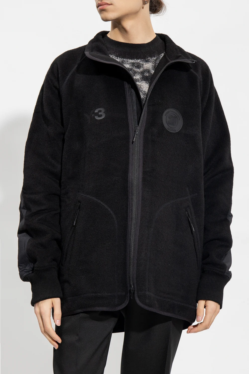 Black sweatshirt with a stand collar from Y-3 Yohji Yamamoto. Made of wool. This garment features a zip fastening, logo-embossed patch, two zip pockets and long sleeves with ribbed cuffs.