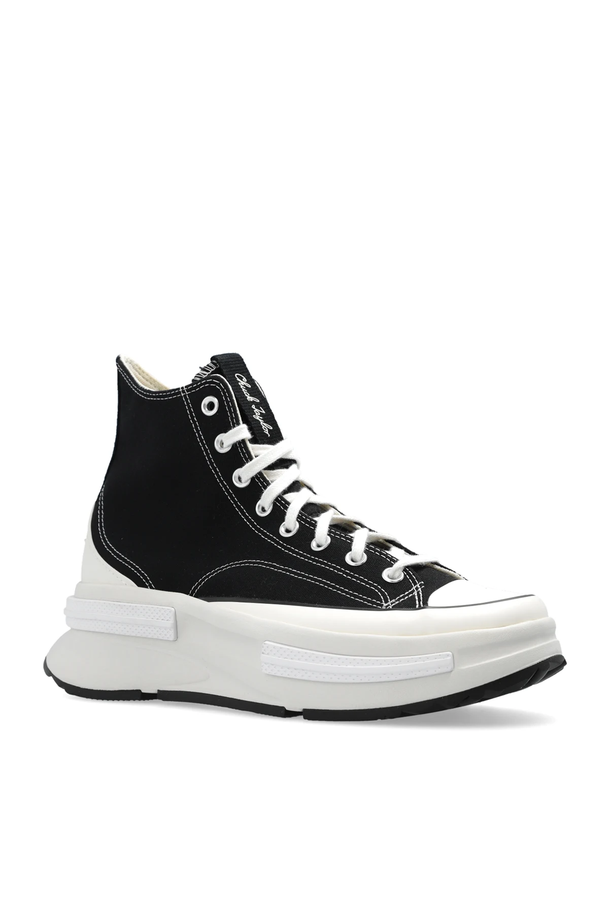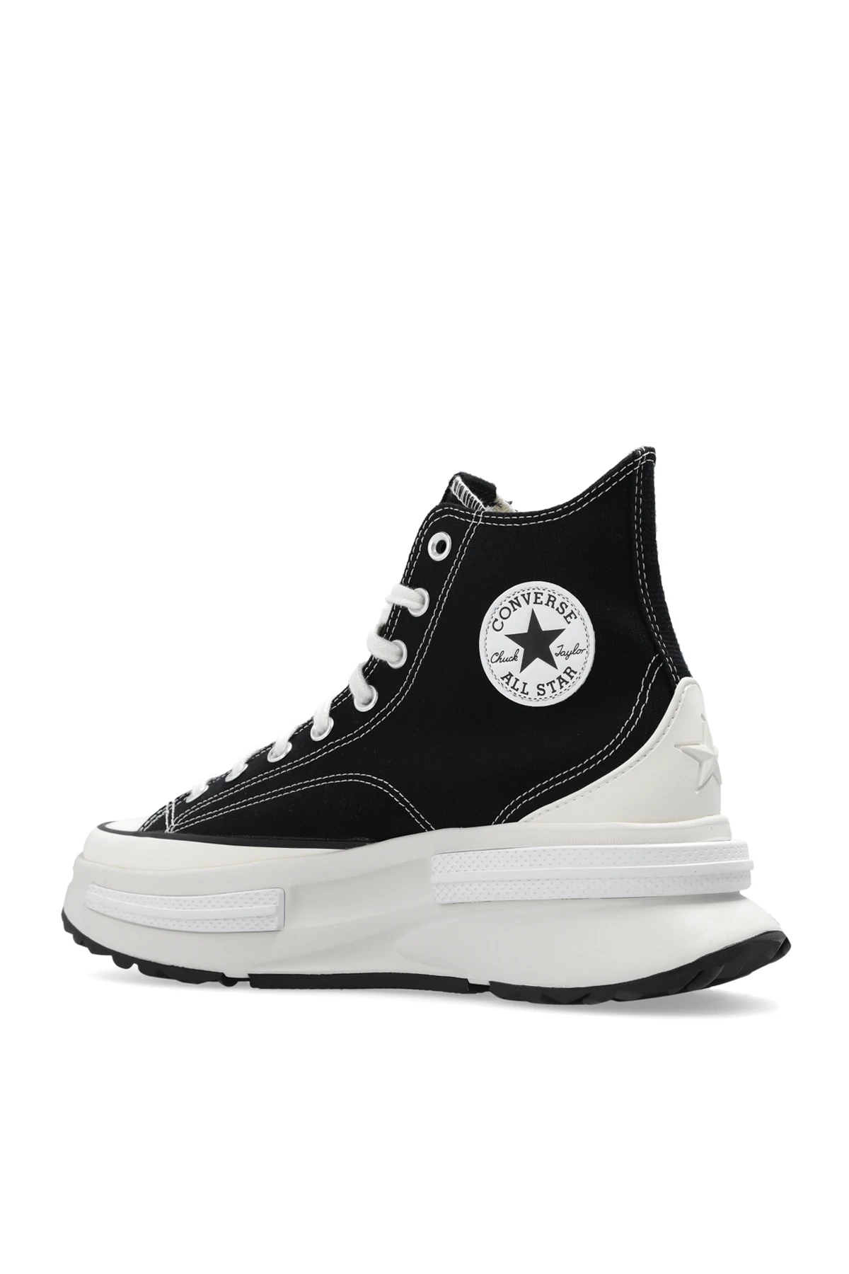 Black ‘Run Star Legacy CX’ sneakers from Converse. Emblazoned with a white logo patch and tactile star, this lace-up model sits on a cream, white and black rubber sole and features a high-top silhouette.