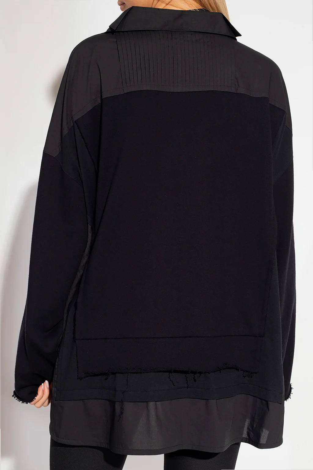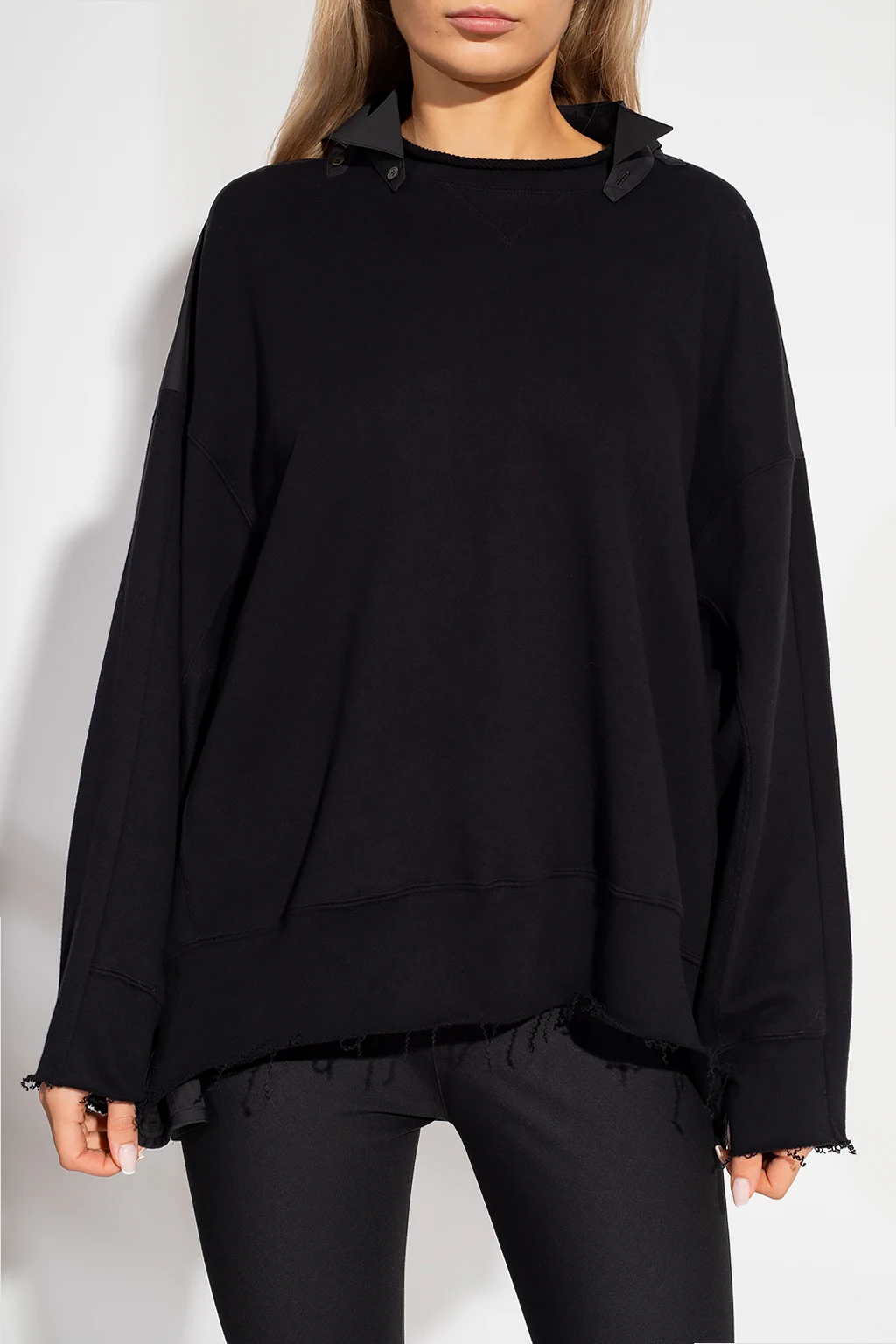 Black sweatshirt from Undercover. Made of cotton, this long sleeve design features a shirt insert with a collar as well as raw cut edges.