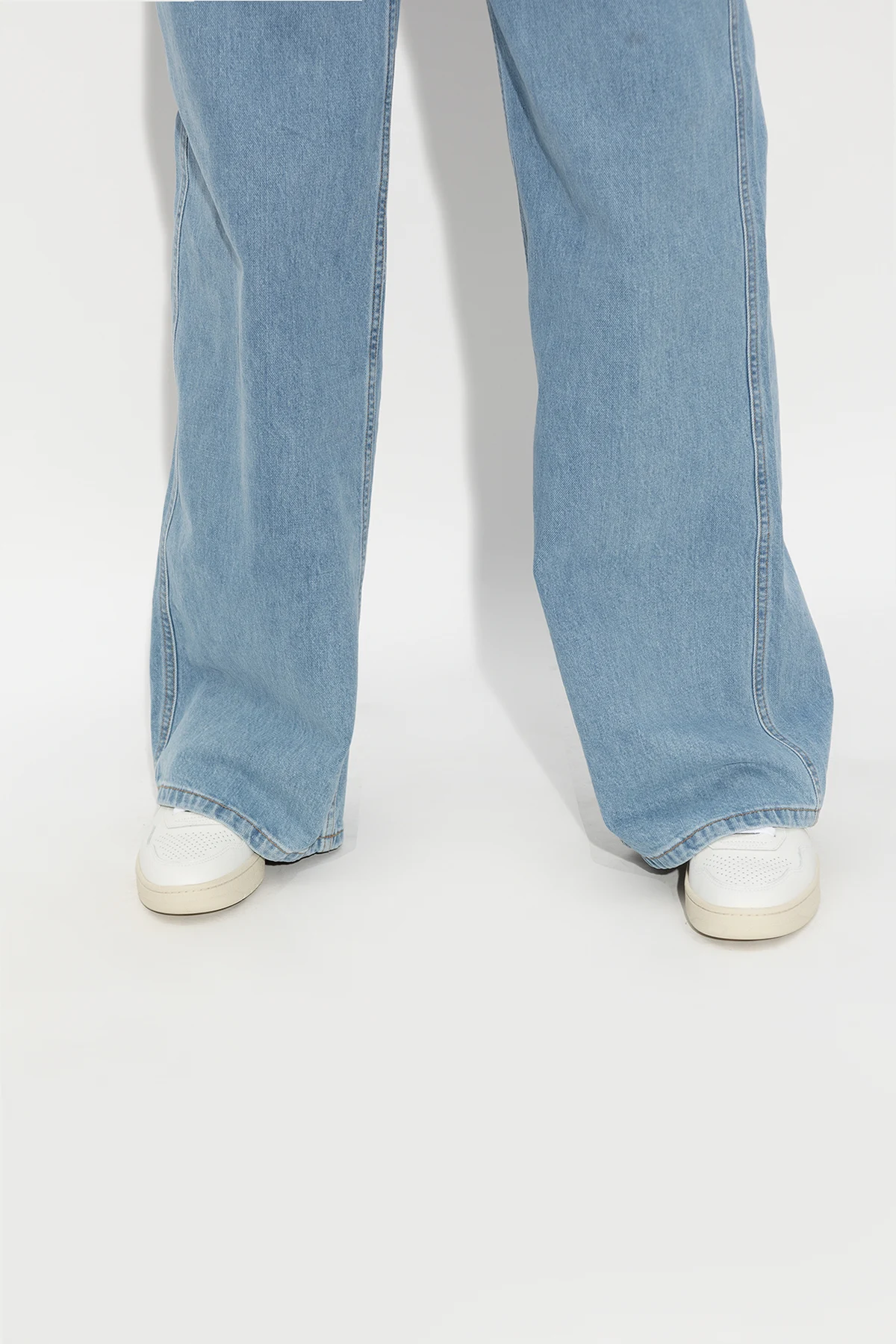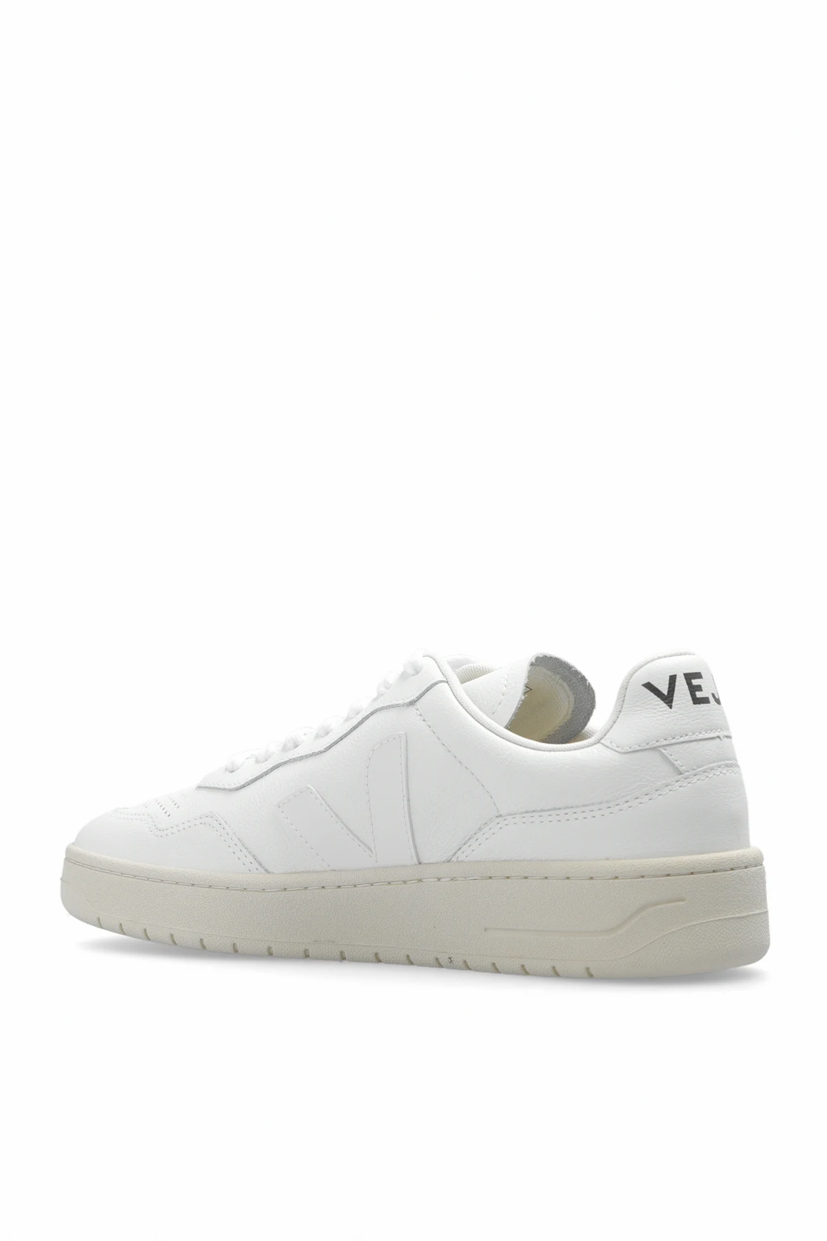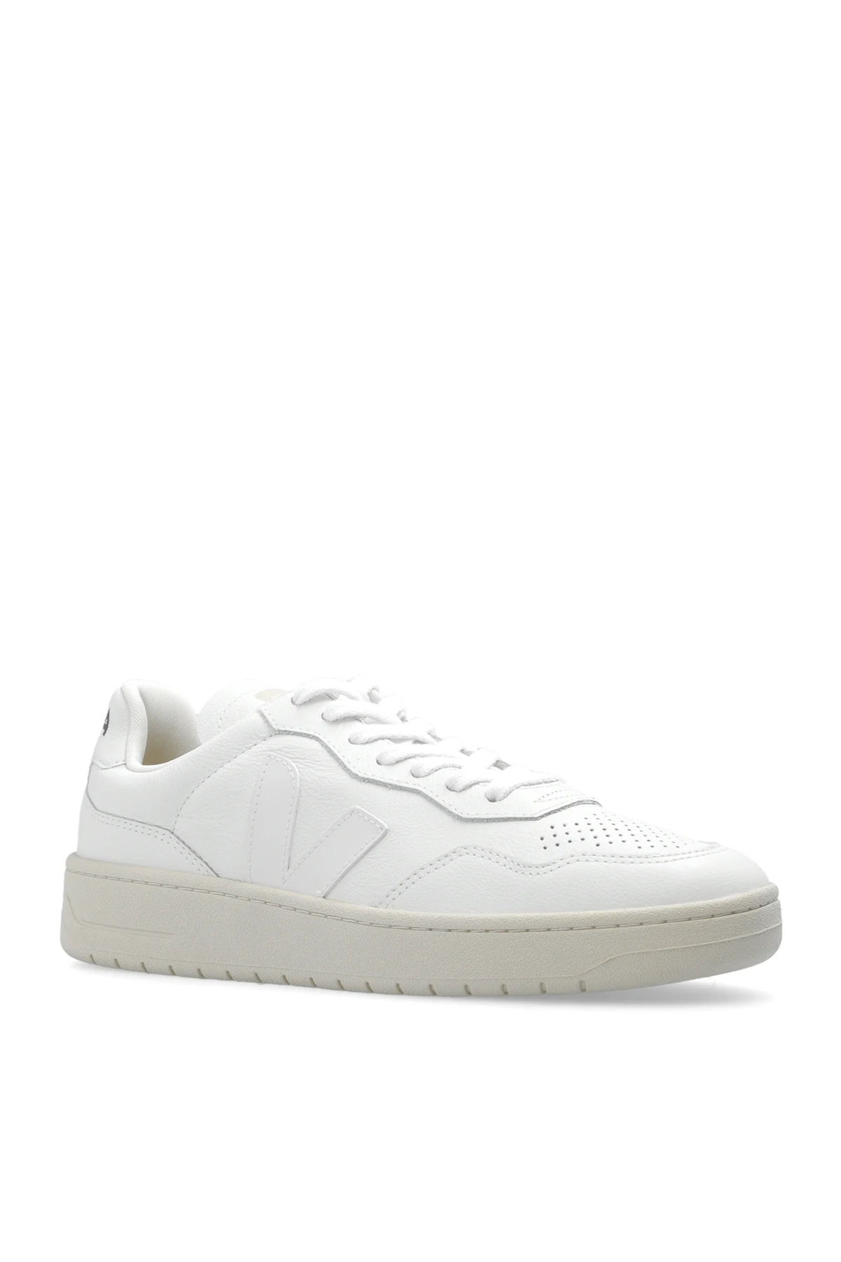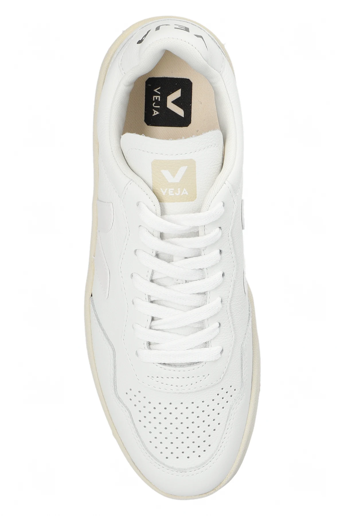 White ‘V-90 O.T. Leather’ sneakers from Veja. Crafted from suede and leather, this model features perforations, a signature logo patch in white, logo print and organic cotton shoelaces. The mesh inner lining made from recycled materials was developed to acquire a better resistance to friction. The organic-sourced and recycled insole consists of sugar cane, Amazon rubber, organic cotton and recycled EVA. It is set on a light grey rubber sole made from organic and recycled materials.