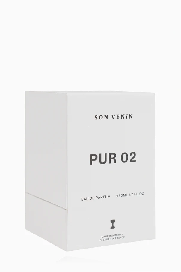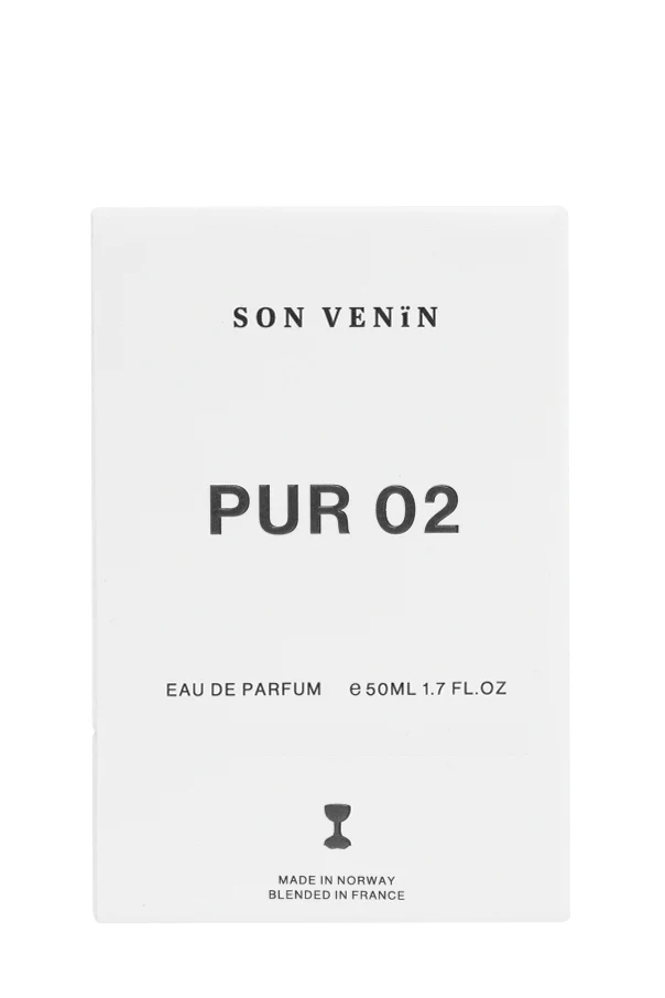 Ein weißes Etikett mit schwarzem Aufdruck informiert dezent über den Produktnamen PUR 02 und dessen Füllmenge 50ML (1.7 FL.OZ). Die äußere Verpackung, im minimalistischen Stil gehalten, enthält die Aufschriften: "SON VENÏN", "PUR 02", "EAU DE PARFUM" sowie die Herkunftsinformation - das Produkt wird in Norwegen hergestellt und in Frankreich gemischt.