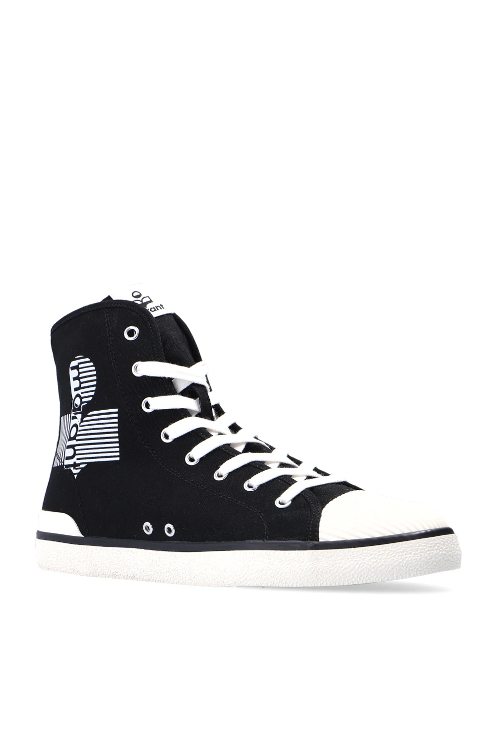 Black and white ‘Benkeenh’ high-top sneakers from Isabel Marant. Crafted from fabric, this lace-up model sits on a brown and white rubber sole and showcases a white logo pattern.