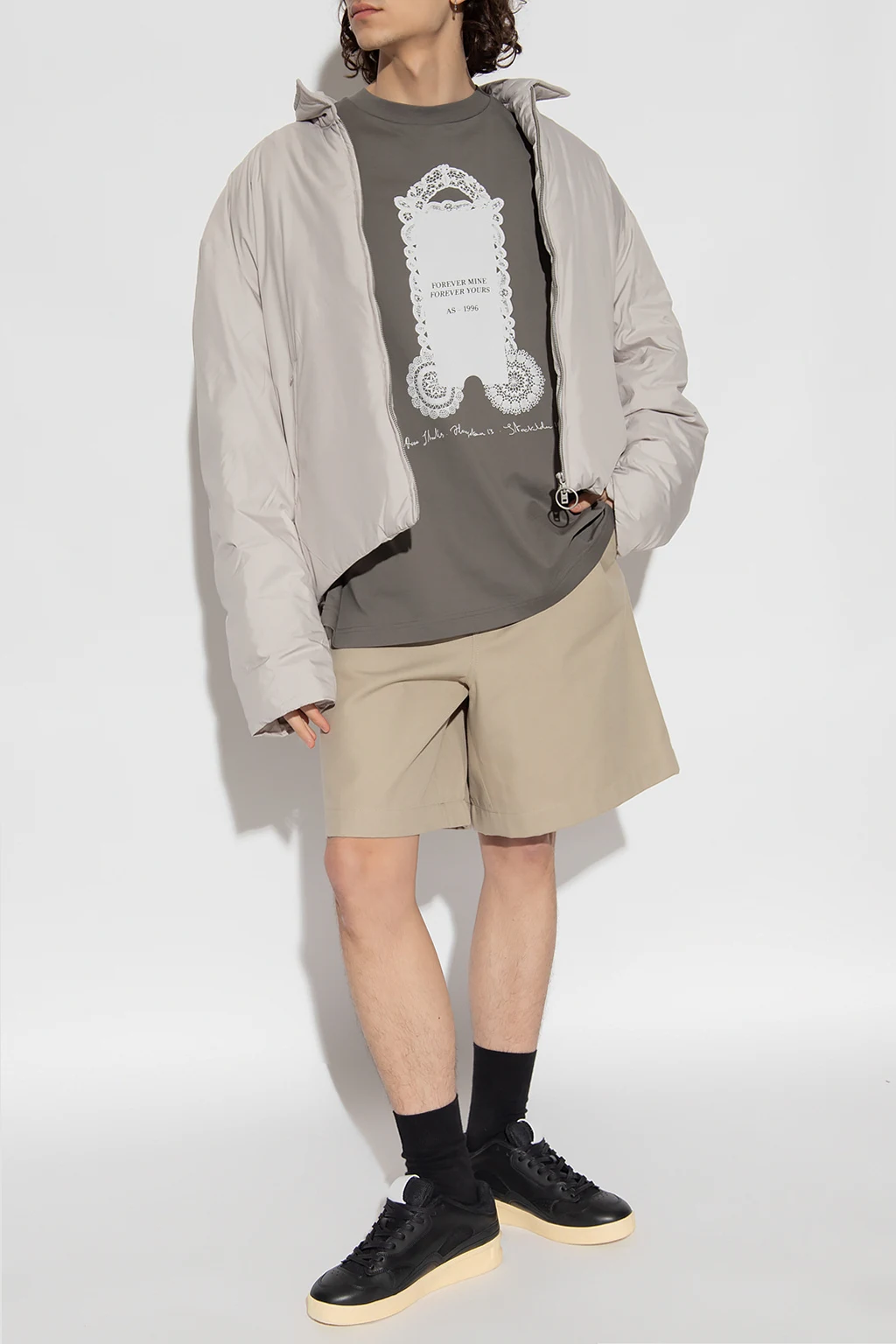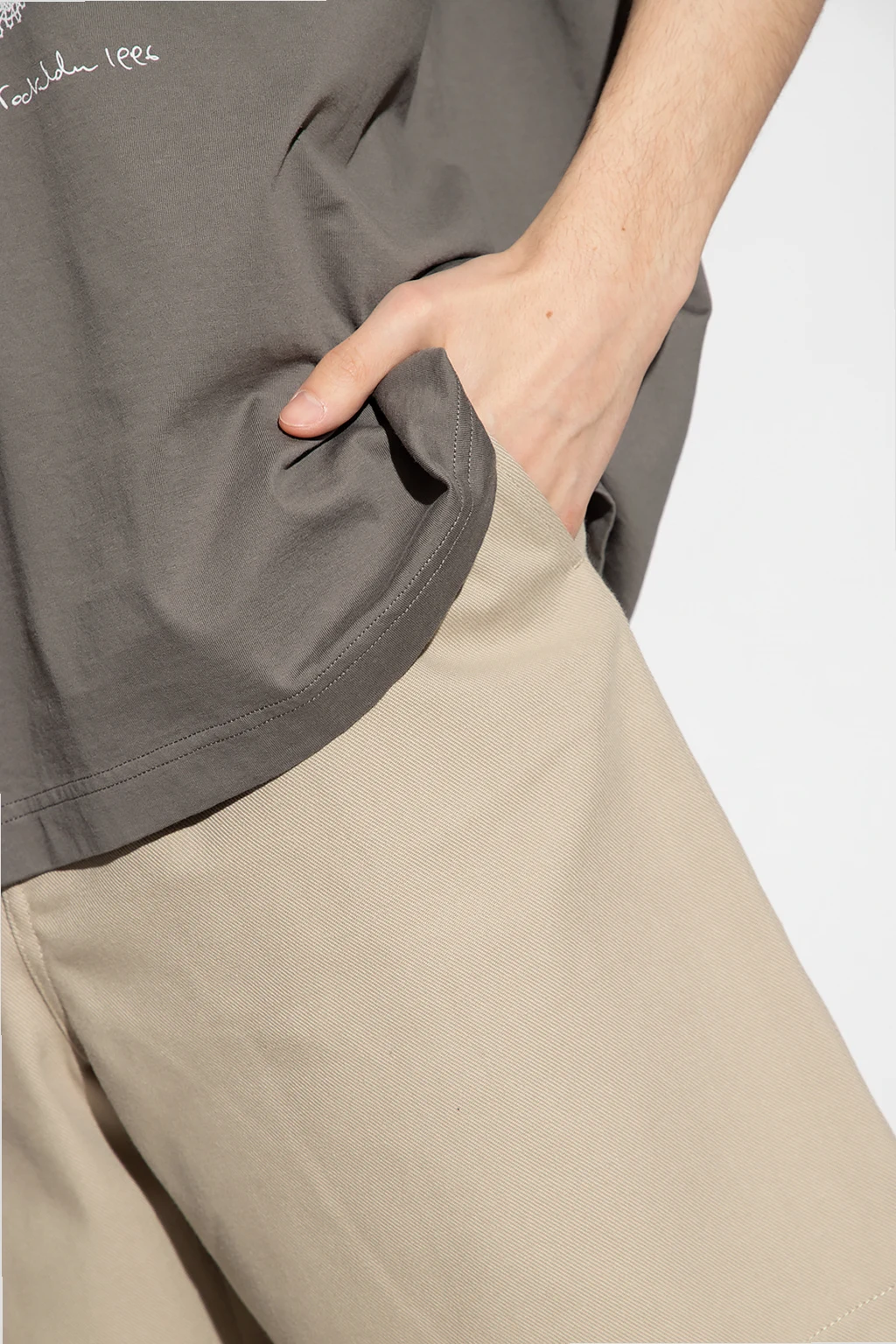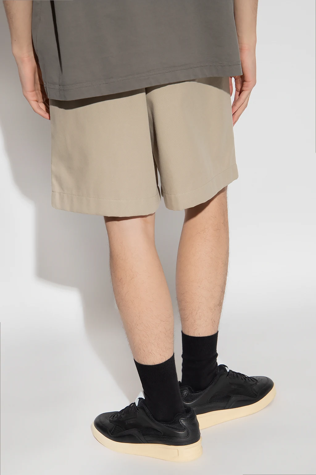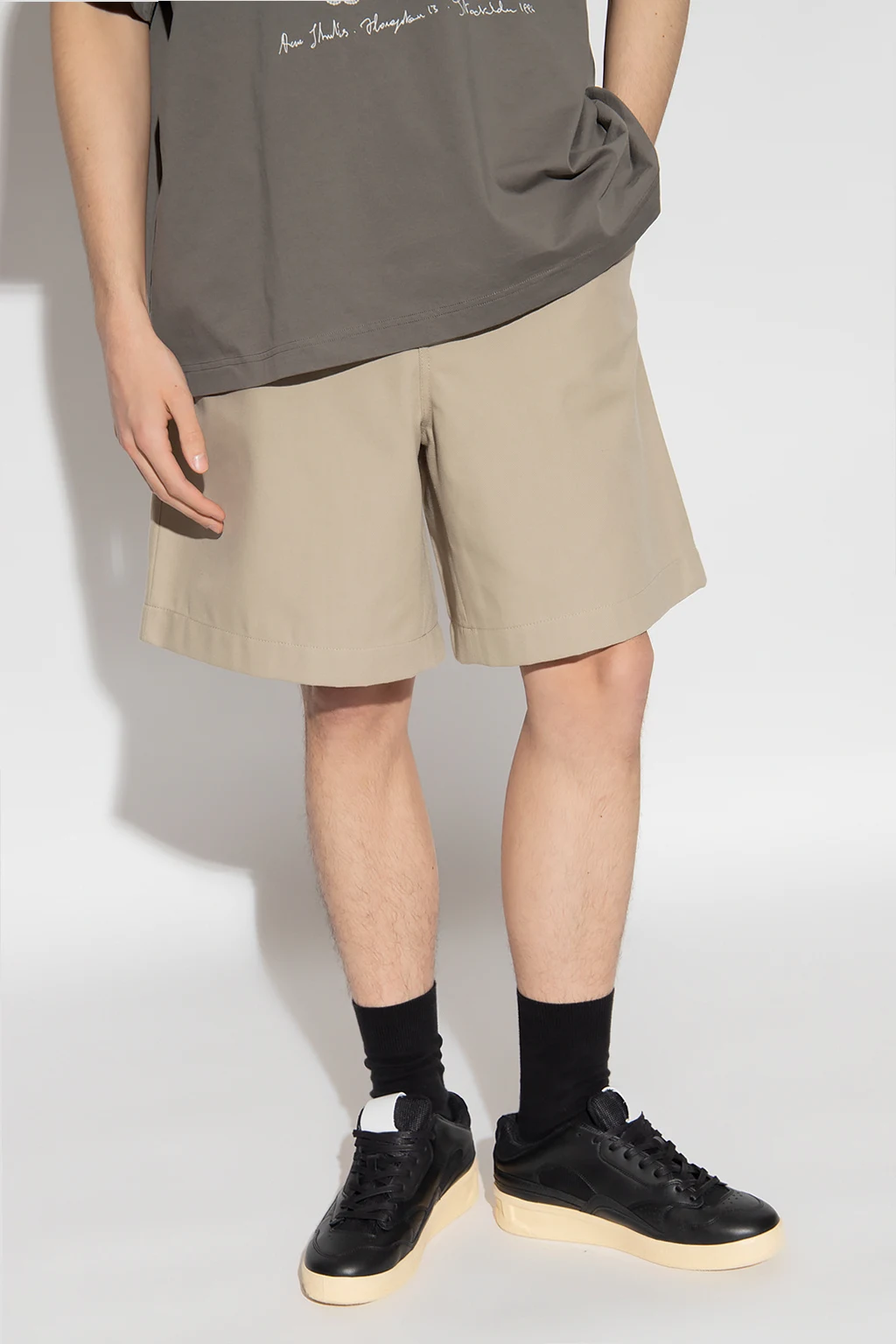 Beige shorts from Acne Studios. Emblazoned at back with a pink logo patch, this pair features a zip fly with a button, three slip pockets and an elasticated waistband.
