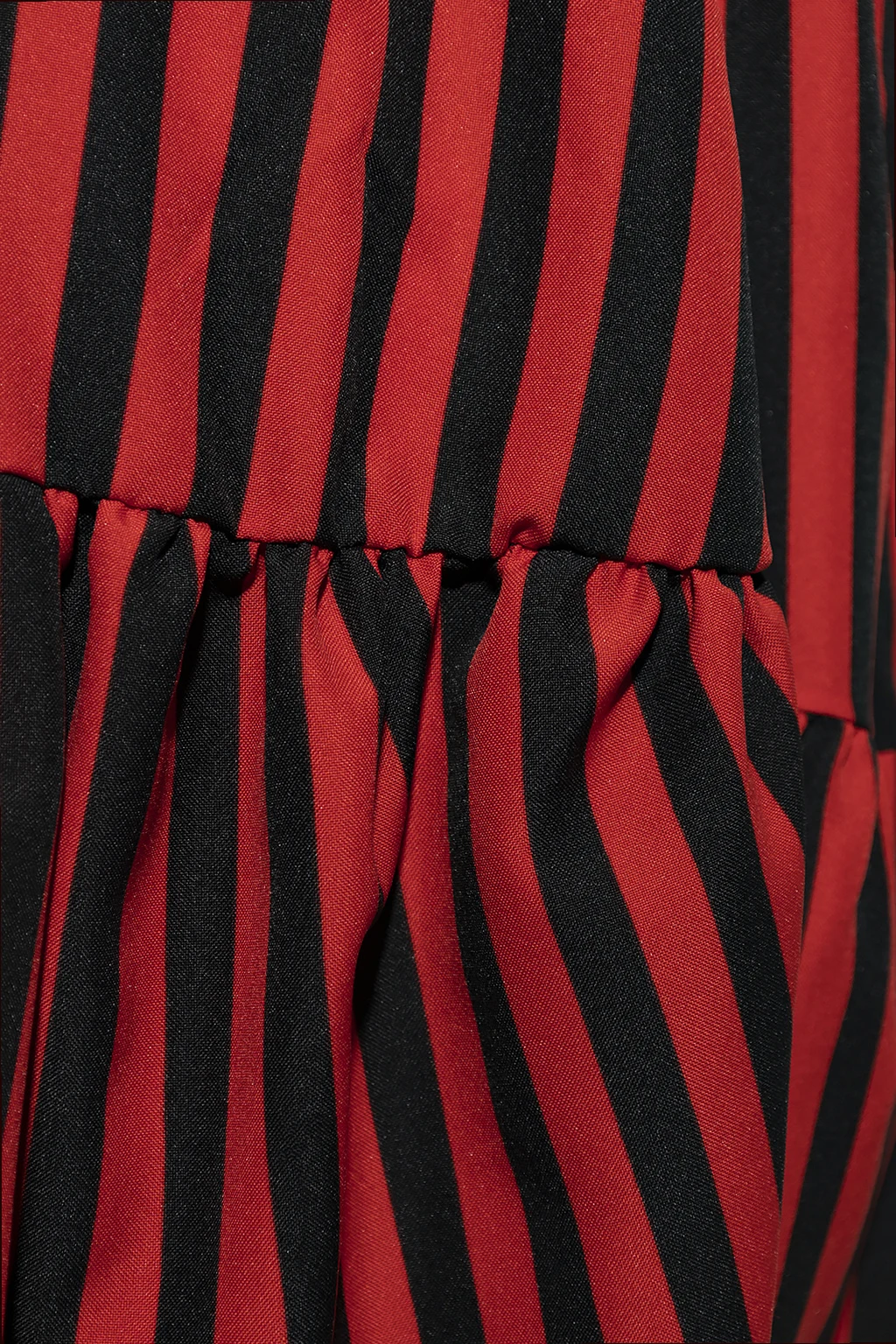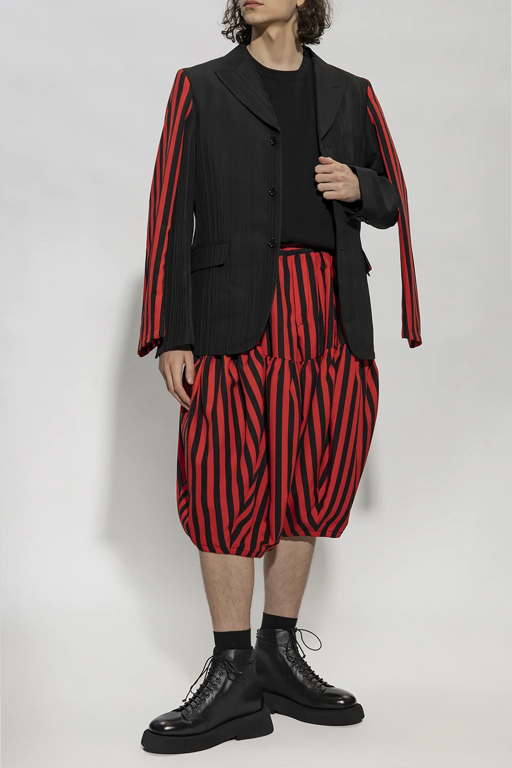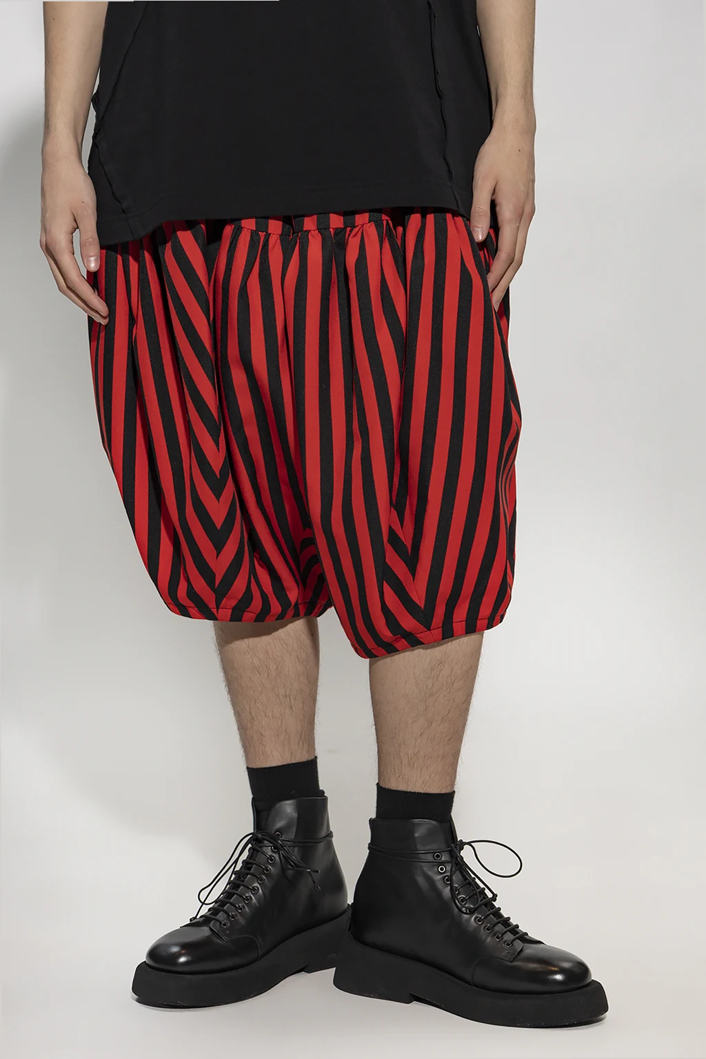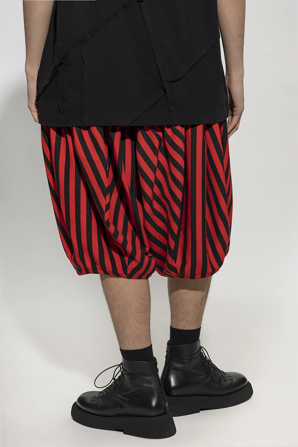 Red and black trousers from Comme des Garcons Homme Plus. Cut with balloon legs, this pair is cinched with drawcords at the waist and features a stripe pattern, a hidden zip fly and two slip pockets.