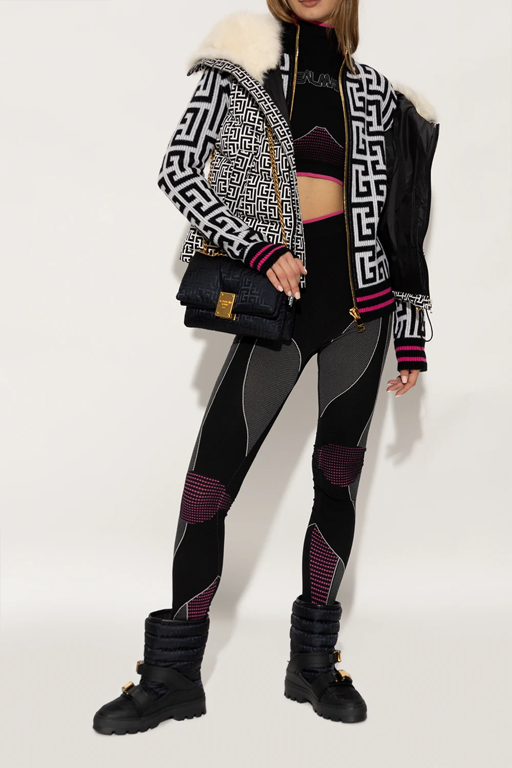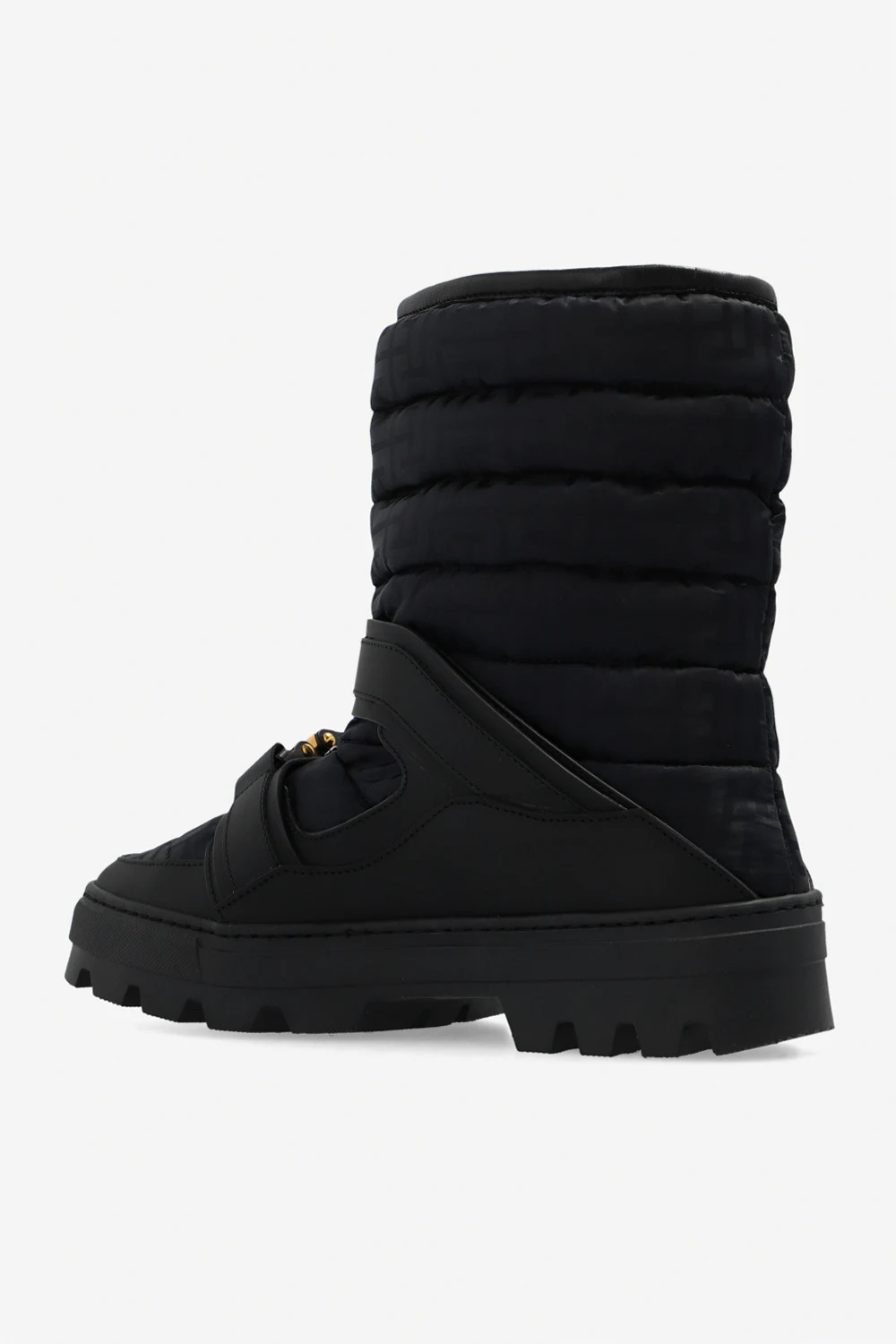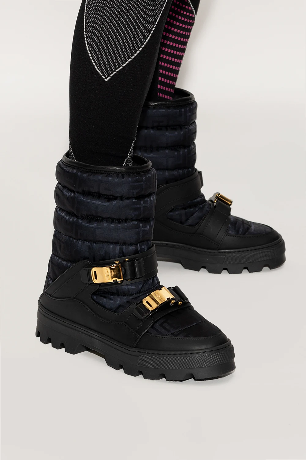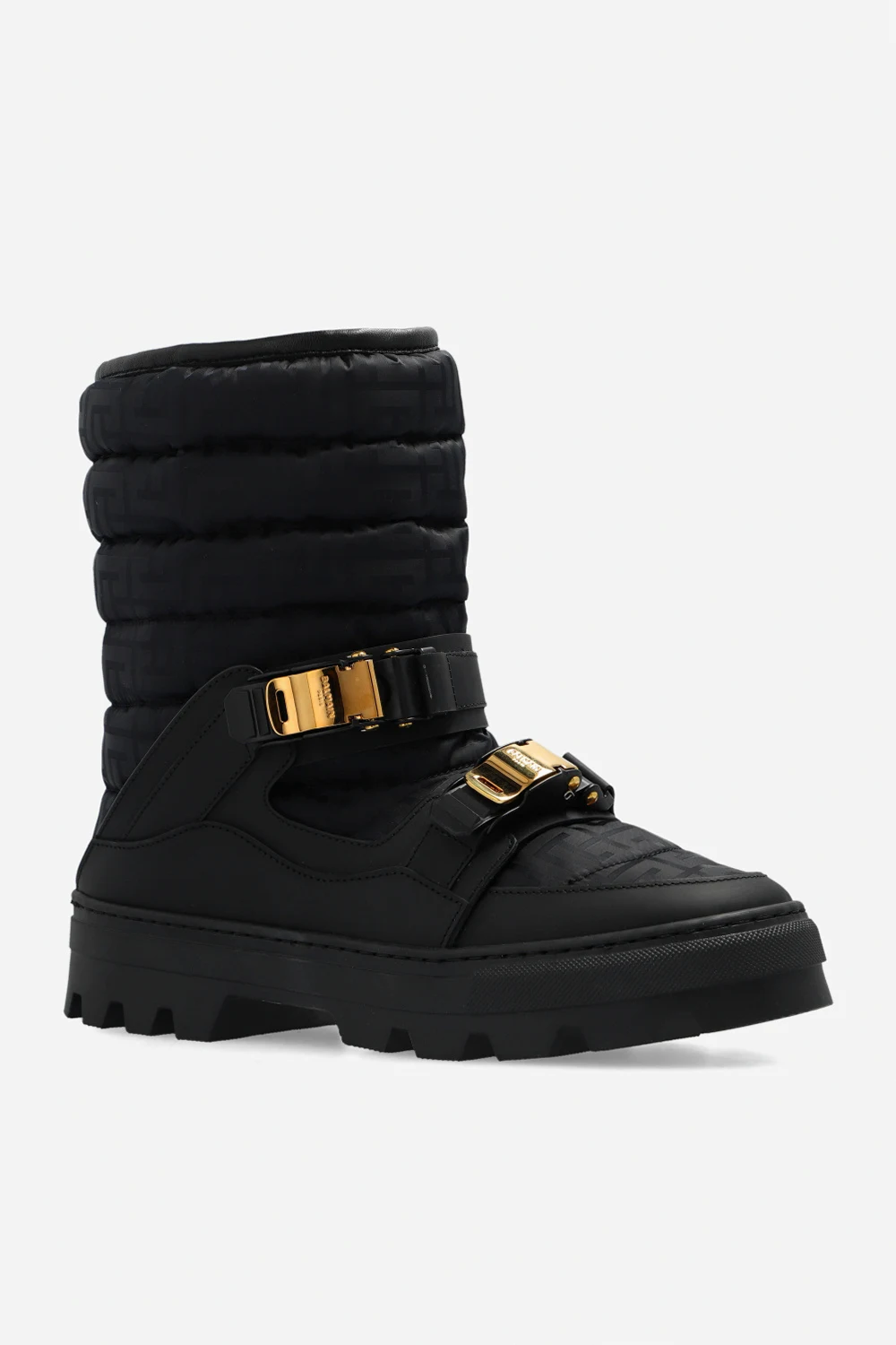 Black quilted snow boots from Balmain x Rossignol. Crafted from monogrammed fabric and leather, this model sits on a black rubber sole and features an adjustable snap closure with the brand's logo.