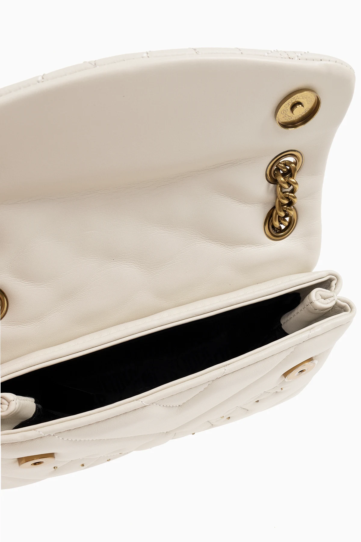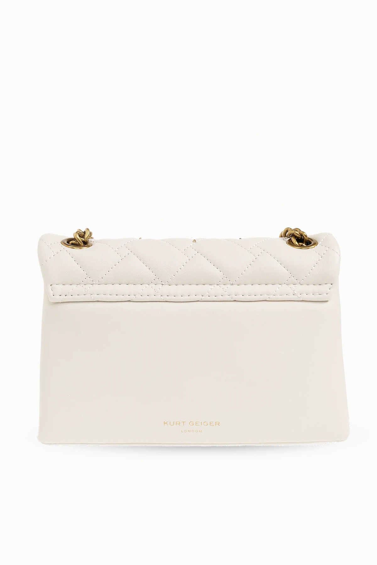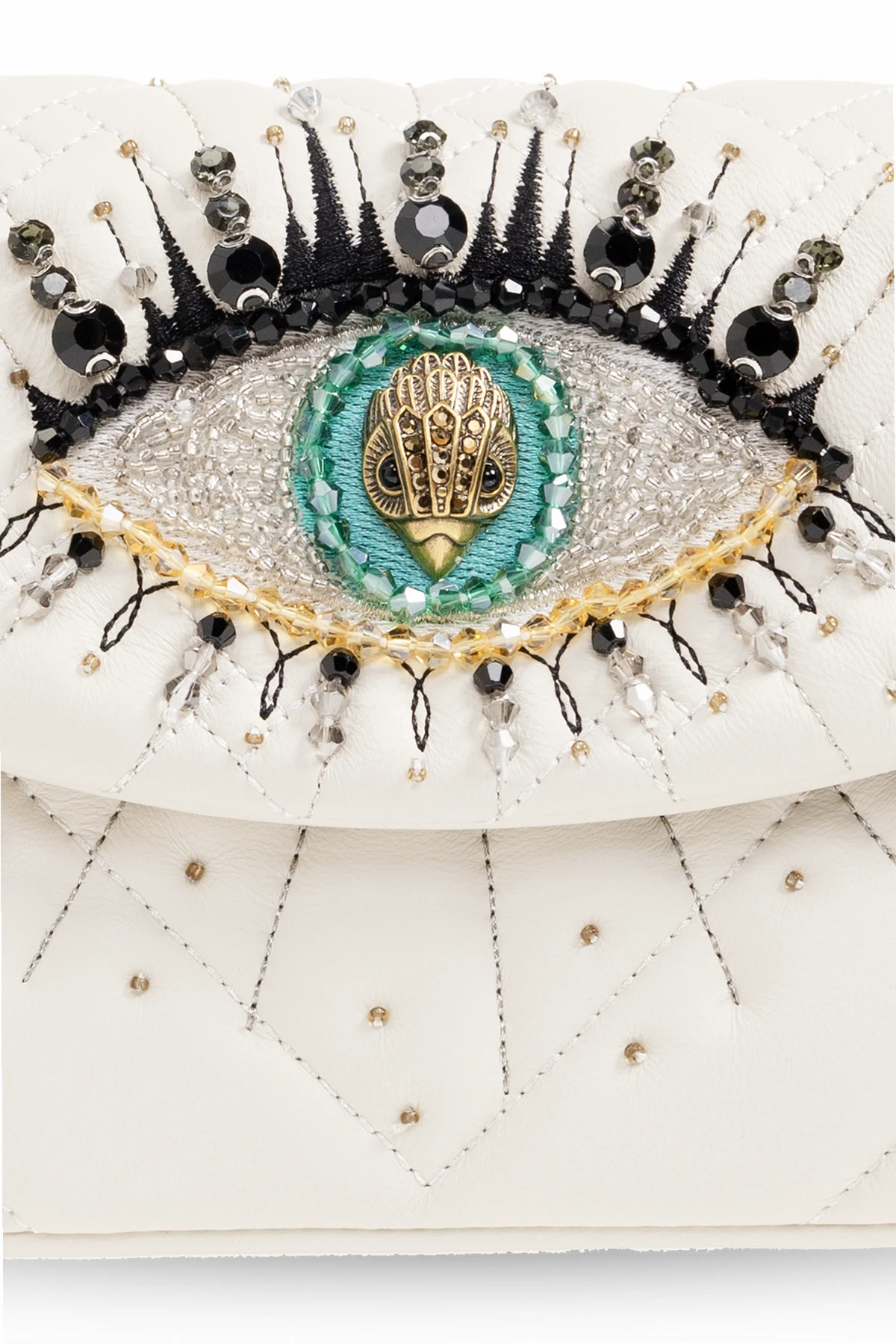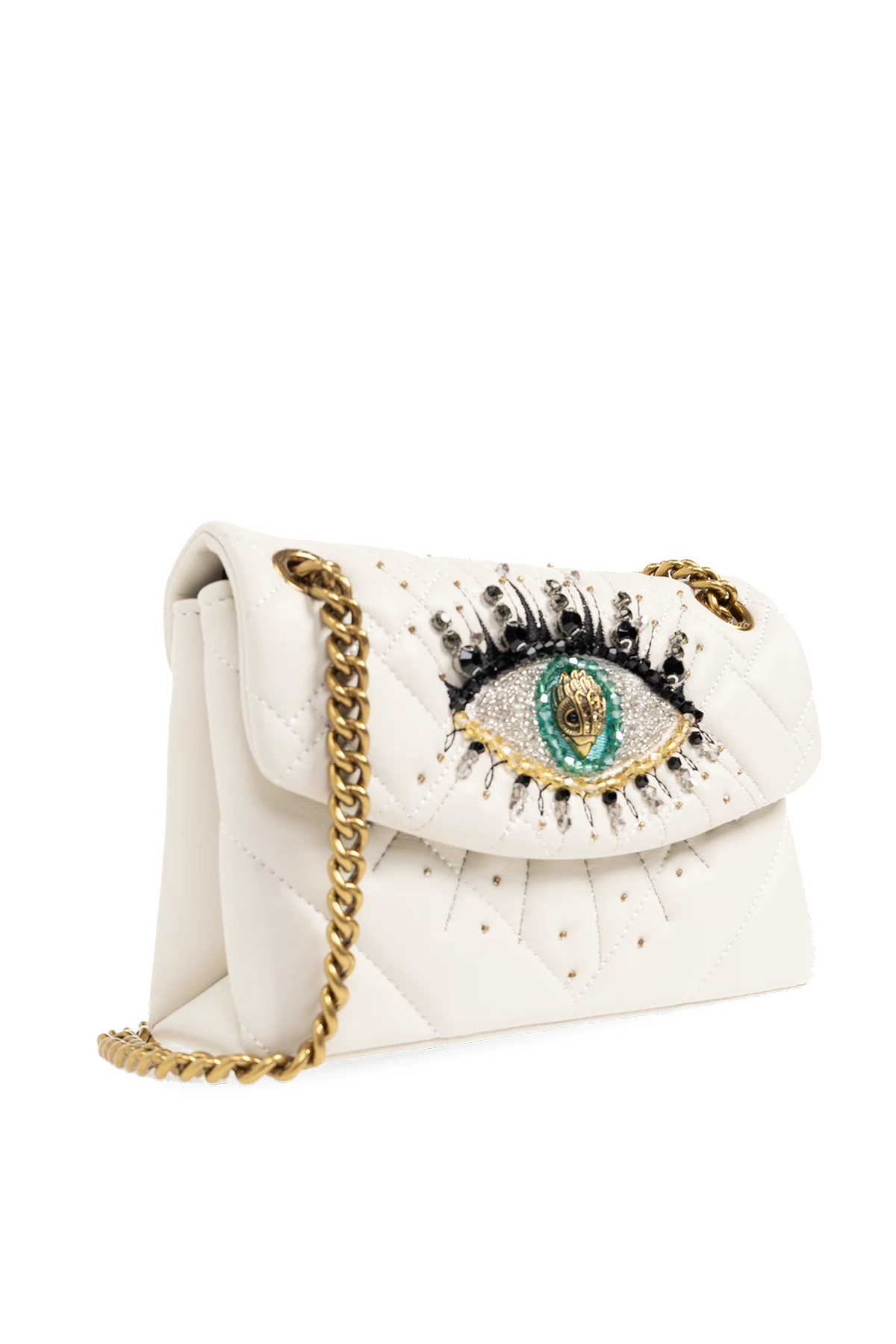 Cream ‘Kensington Mini’ leather shoulder bag from Kurt Geiger. Made of leather, this design secures with snaps and showcases an embroidered and applied crystal eye detail and the brand's signature eagle head plaque on the front, partial quilting, a printed logo on the back, a chain shoulder strap, antiqued gold-tone metal hardware and one internal compartment with a slip pocket.