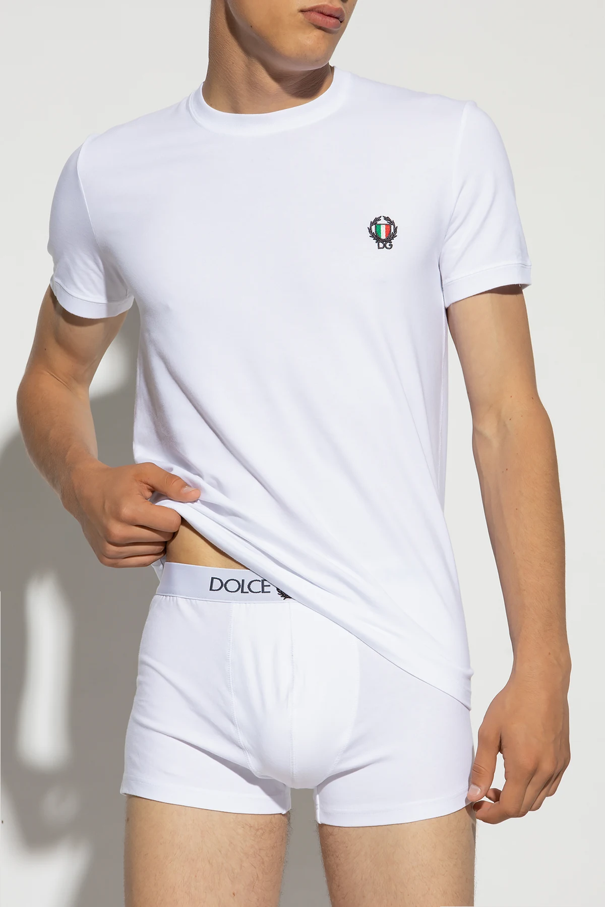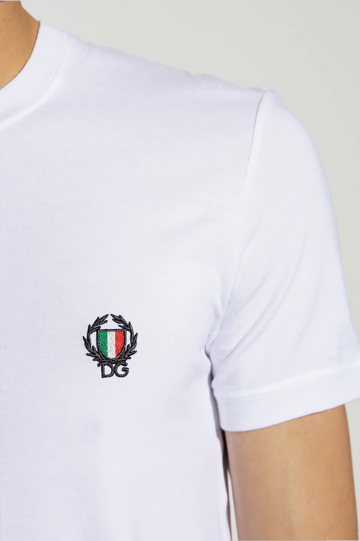 White T-shirt with a ribbed crew neck from Dolce & Gabbana. Crafted from cotton, this short sleeve design features a multicolored emblem and laurel logo patch.