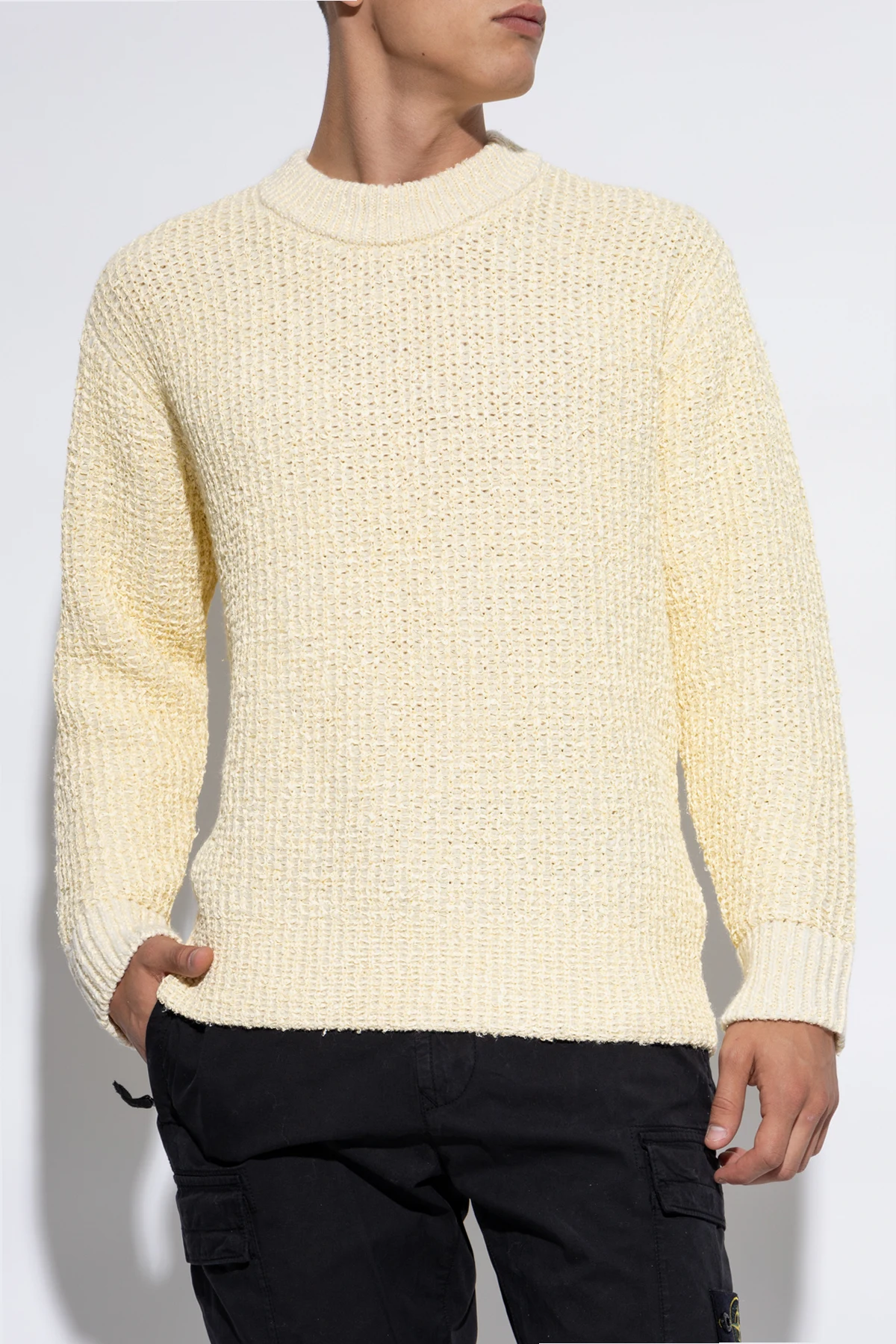 Die dominierende Farbe ist ein dezentes, aufgehelltes Gelb, das Sanftheit und zurückhaltende Eleganz einbringt. Der Pullover ist sorgfältig verarbeitet – die Bündchen, der Saum und der Ausschnitt sind mit einem schmalen, gerippten Strick verziert, was für eine hervorragende Passform und Tragekomfort sorgt.