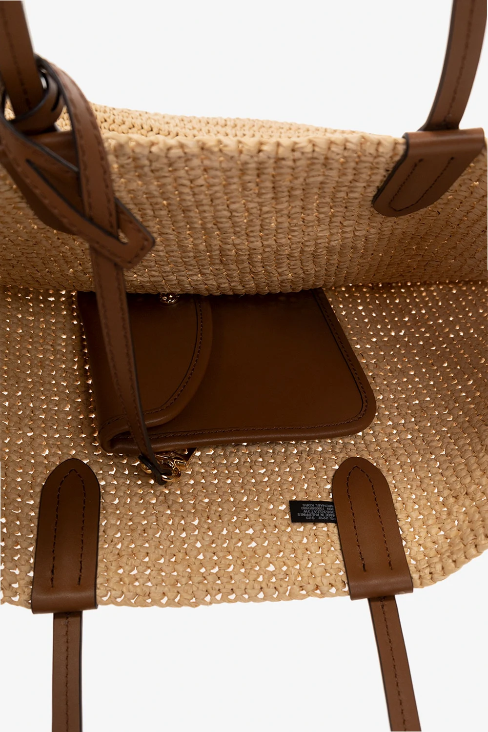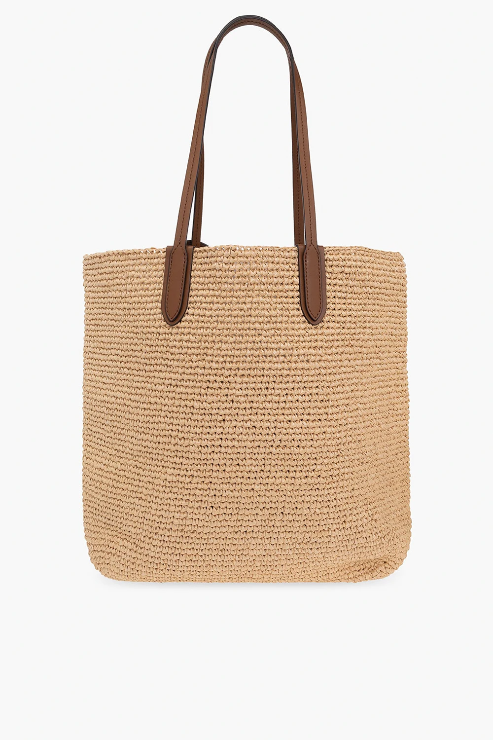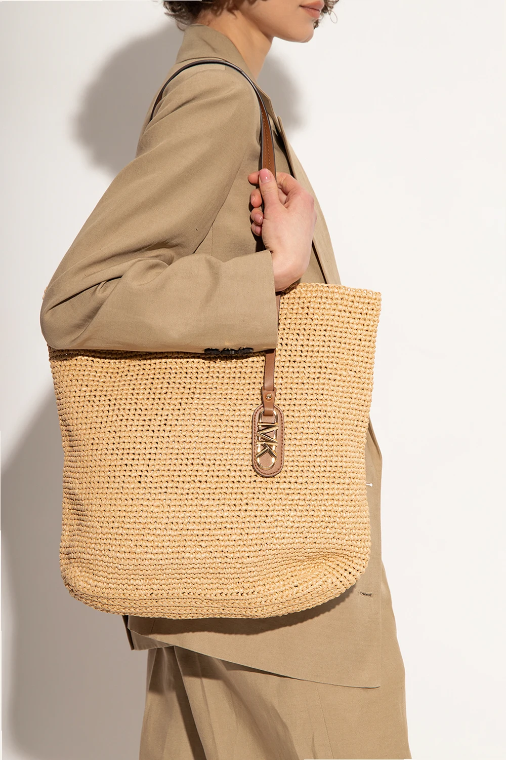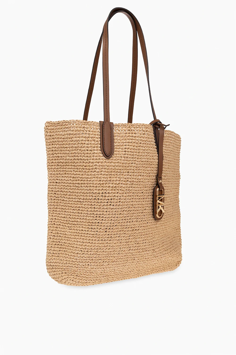 Brown and beige 'Eliza' shoulder bag from Michael Kors. Crafted from woven material and trimmed with faux leather, this design features two half-round handles, gold-tone metal hardware and one internal compartment with a removable pouch.