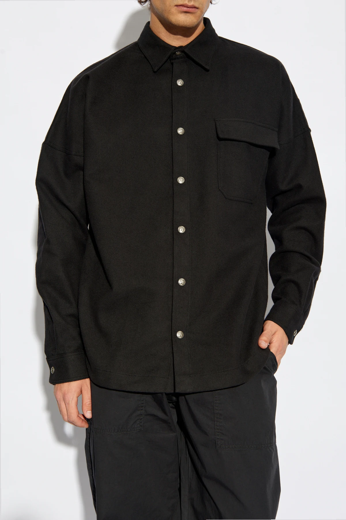 Klassischer Kragen und durchgehende Knopfleiste garantieren zeitlose Eleganz. Auf der Vorderseite befindet sich eine Patten-Tasche , die Praktikabilität und Stil hinzufügt. Auf dem Rücken des Hemdes prangt ein großer weißer Aufdruck mit dem Markennamen, und kontrastierende Knöpfe bringen ein visuelles Interesse ein.