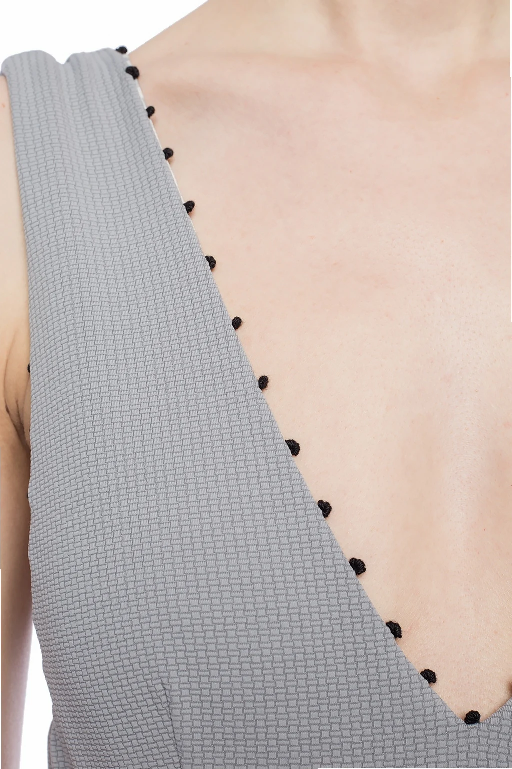Light grey one-piece swimsuit on straps from Marysia. Decorated with a ruffle and fringes in black. V-neck. Includes a case.