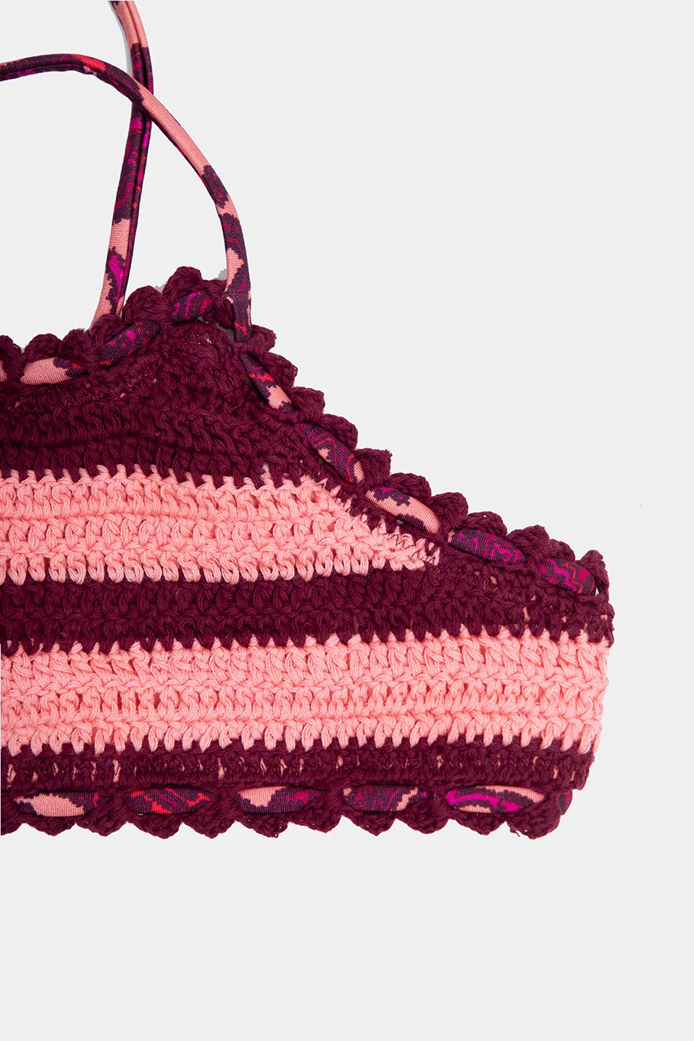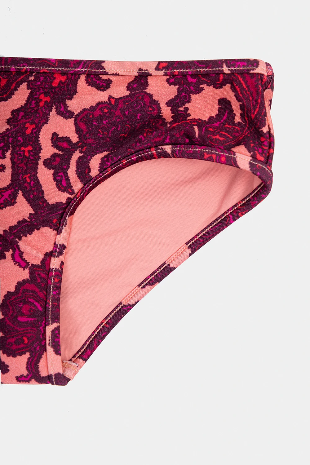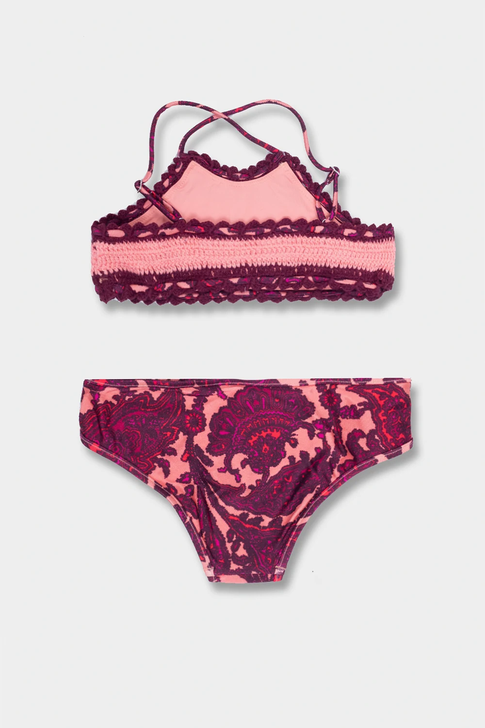 Pink and maroon two-piece swimsuit from Zimmermann Kids. Crafted in contrasting fabrics, this style showcases a graphic pattern. A top has adjustable shoulder straps.