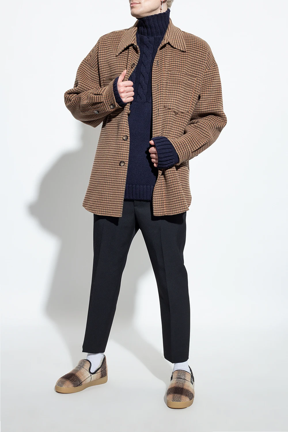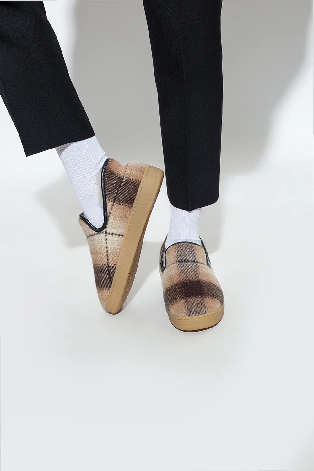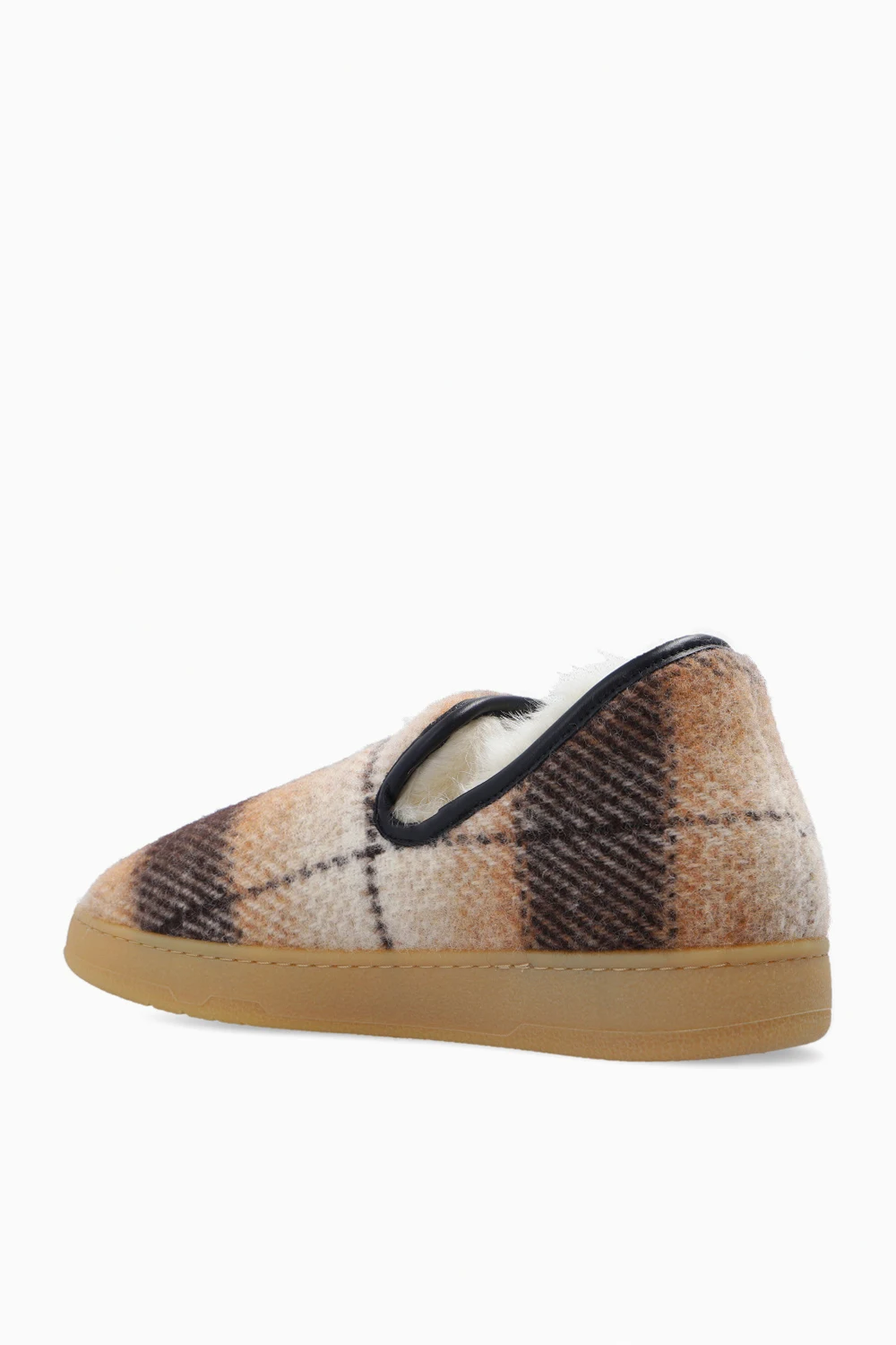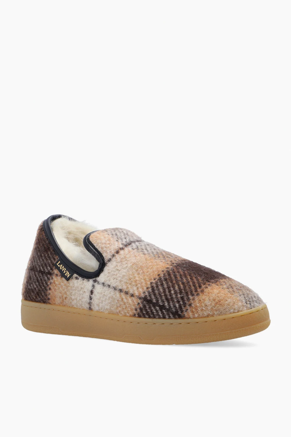 Beige, cream and black ‘Slipper Cosy’ slip-ons from Lanvin. Made of wool, this design features a check pattern, a logo patch, shearling lining and rubber sole in beige.