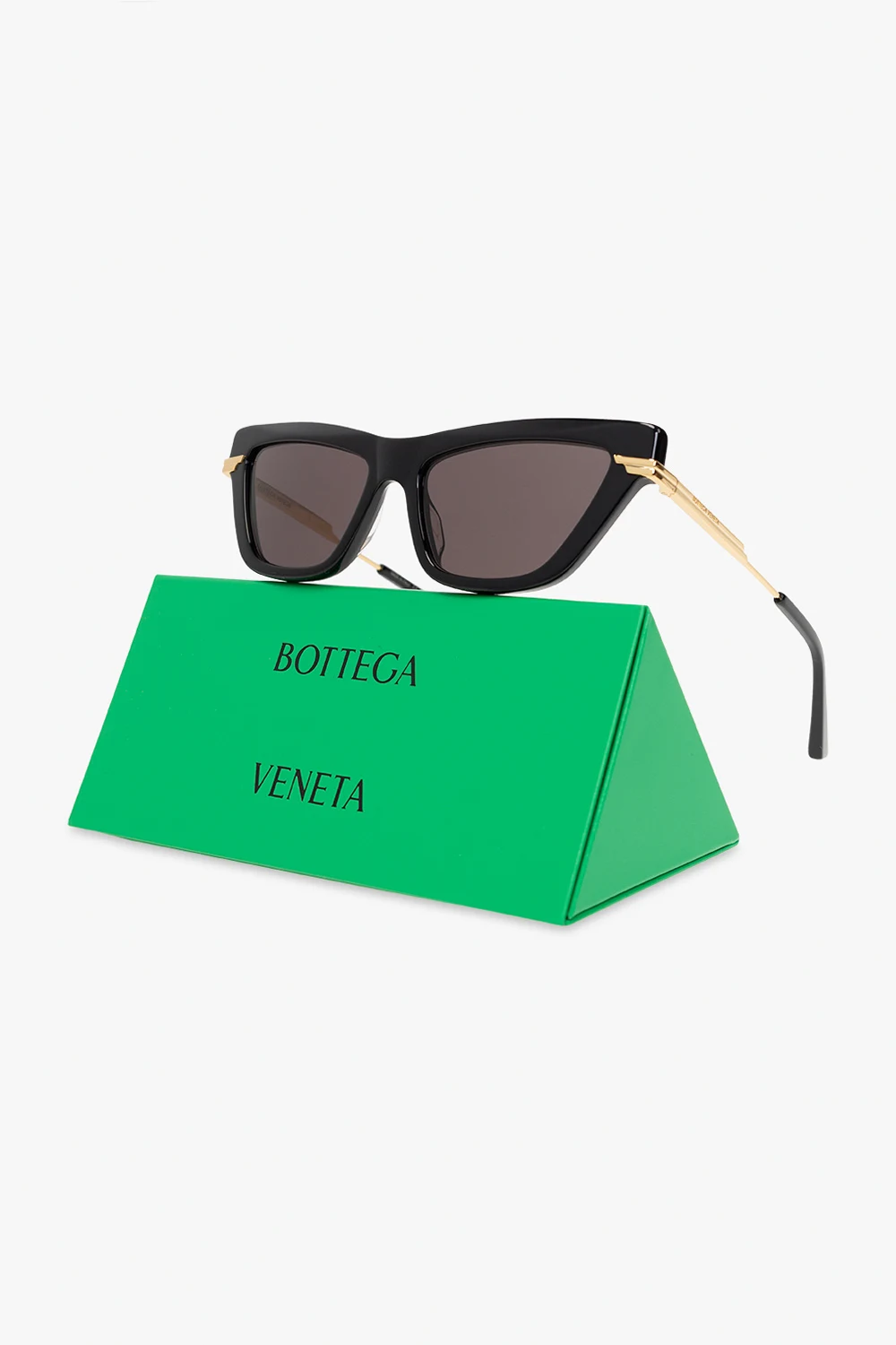 Black and gold-tone ‘Classic’ sunglasses from Bottega Veneta. This pair has a transparent cat-eye frame, the brand's signature logo-engraved detail on the temples and grey lenses with 100% UV protection. Case included.
