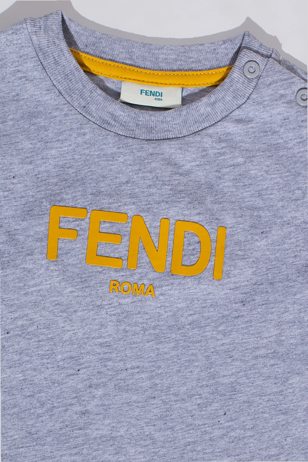 Grey T-shirt from Fendi Kids. Crafted from cotton, this short sleeve features snap fastenings, yellow logo pattern and ribbed crewneck.