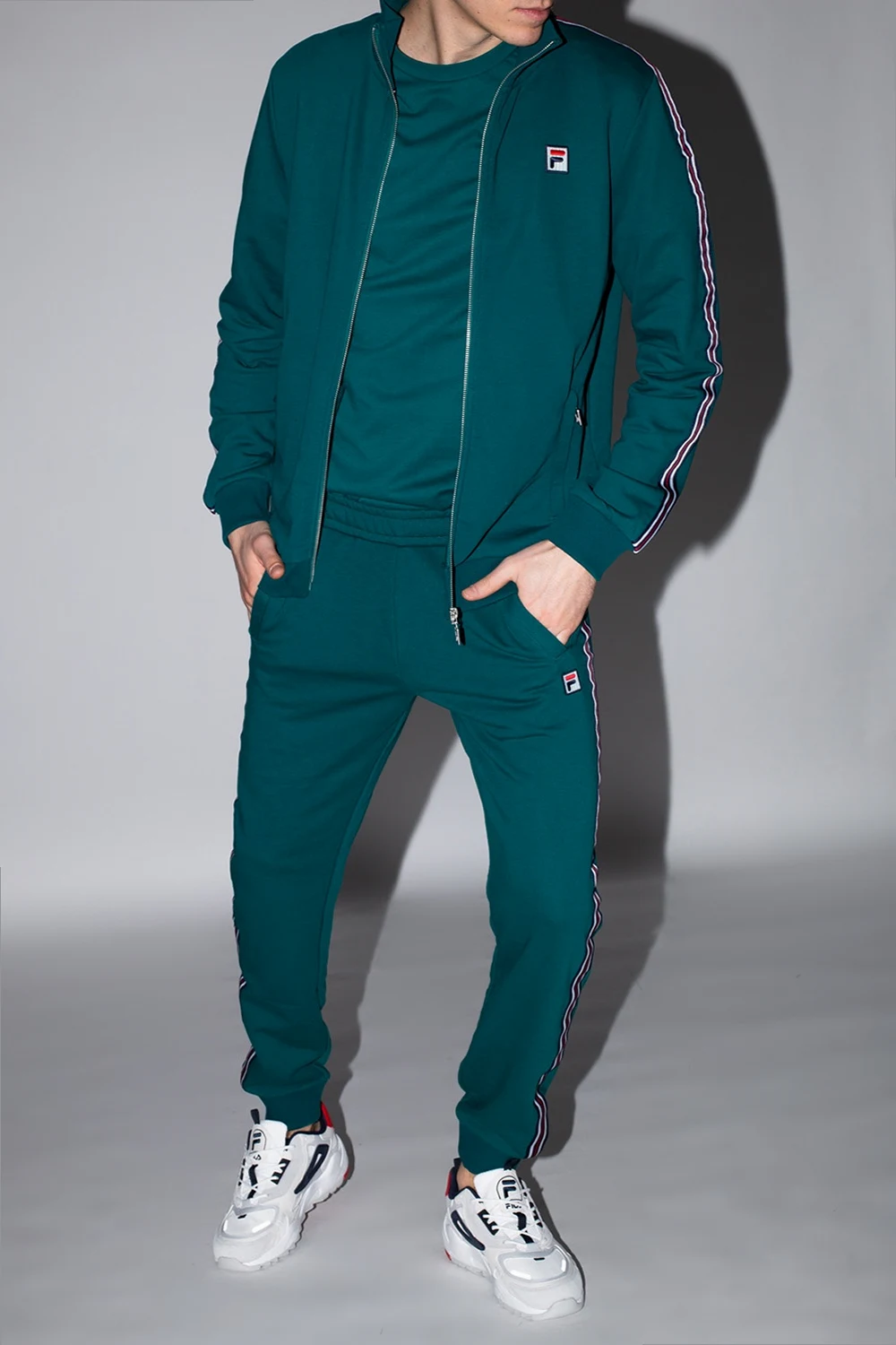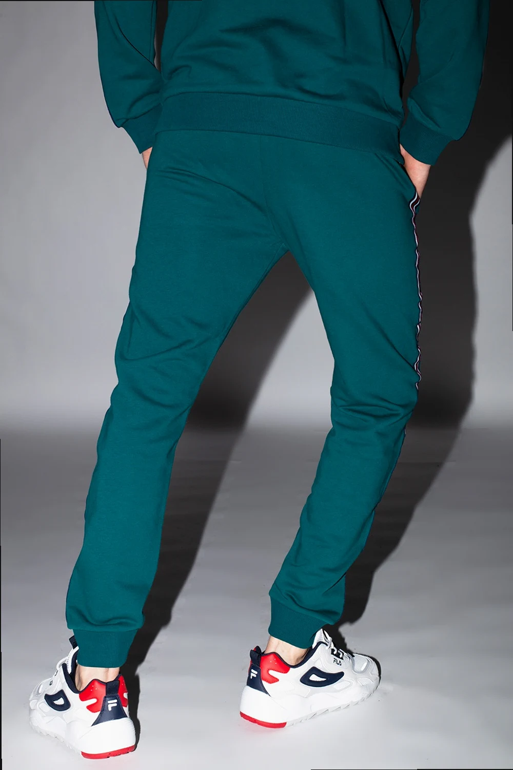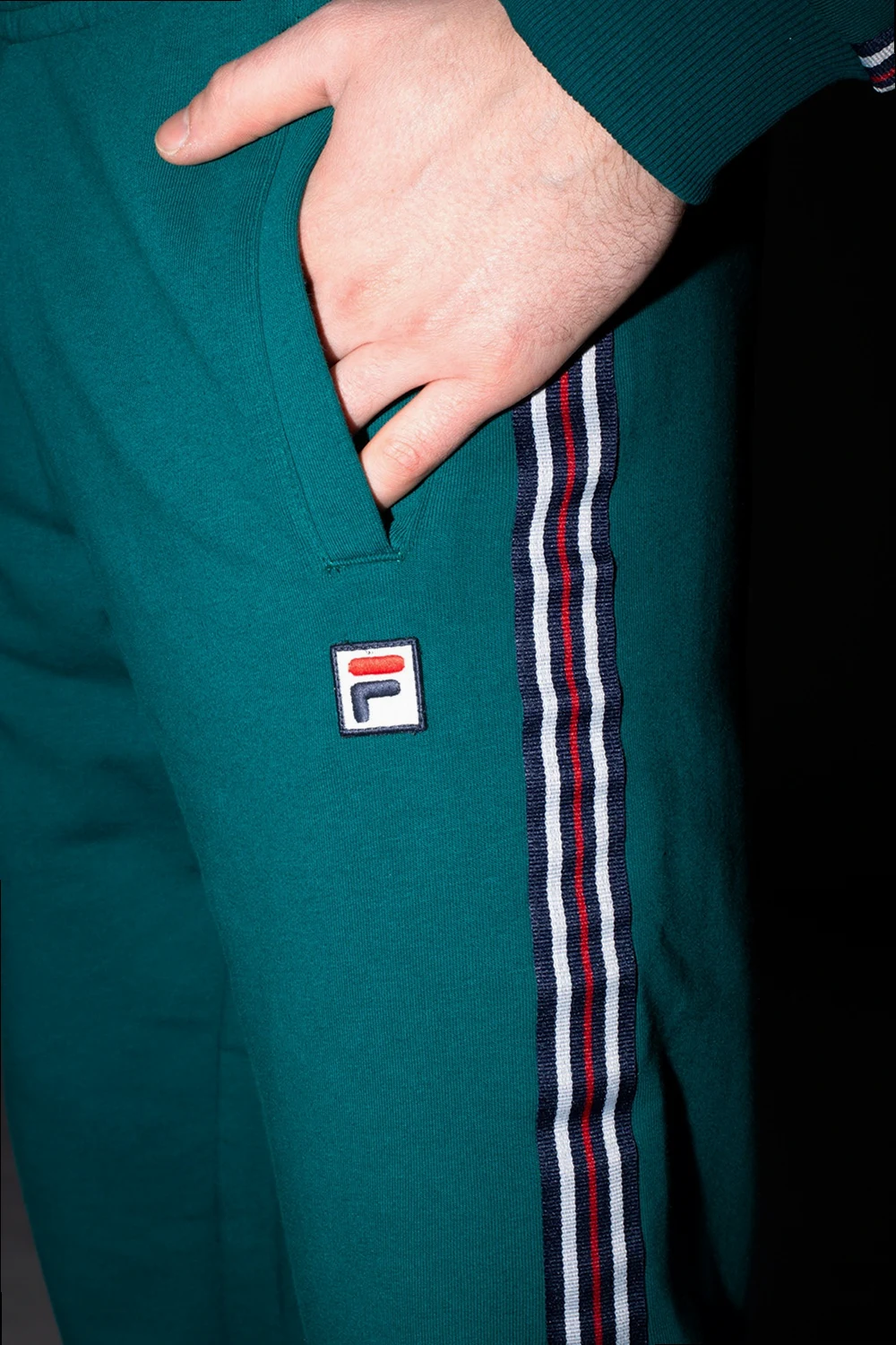 Green sweatpants from Fila. Fastened with drawstrings, this design features a logo patch, navy, white and red appliqués, two front slip pockets and ribbed cuffs.
