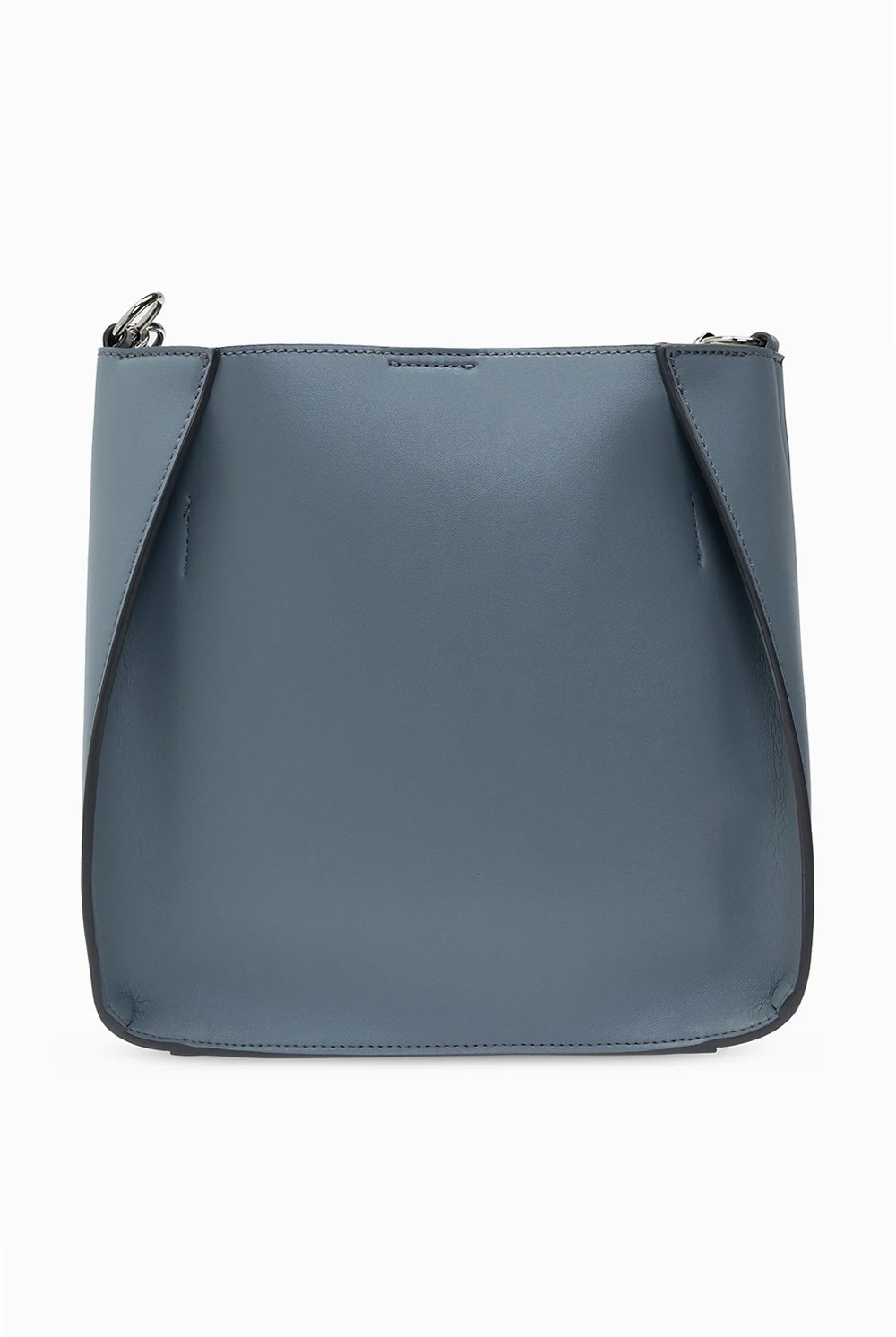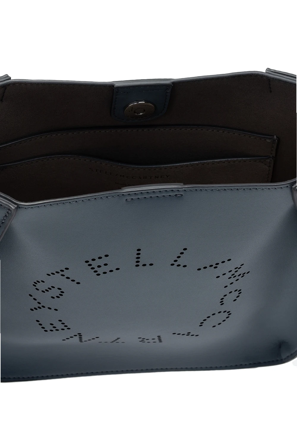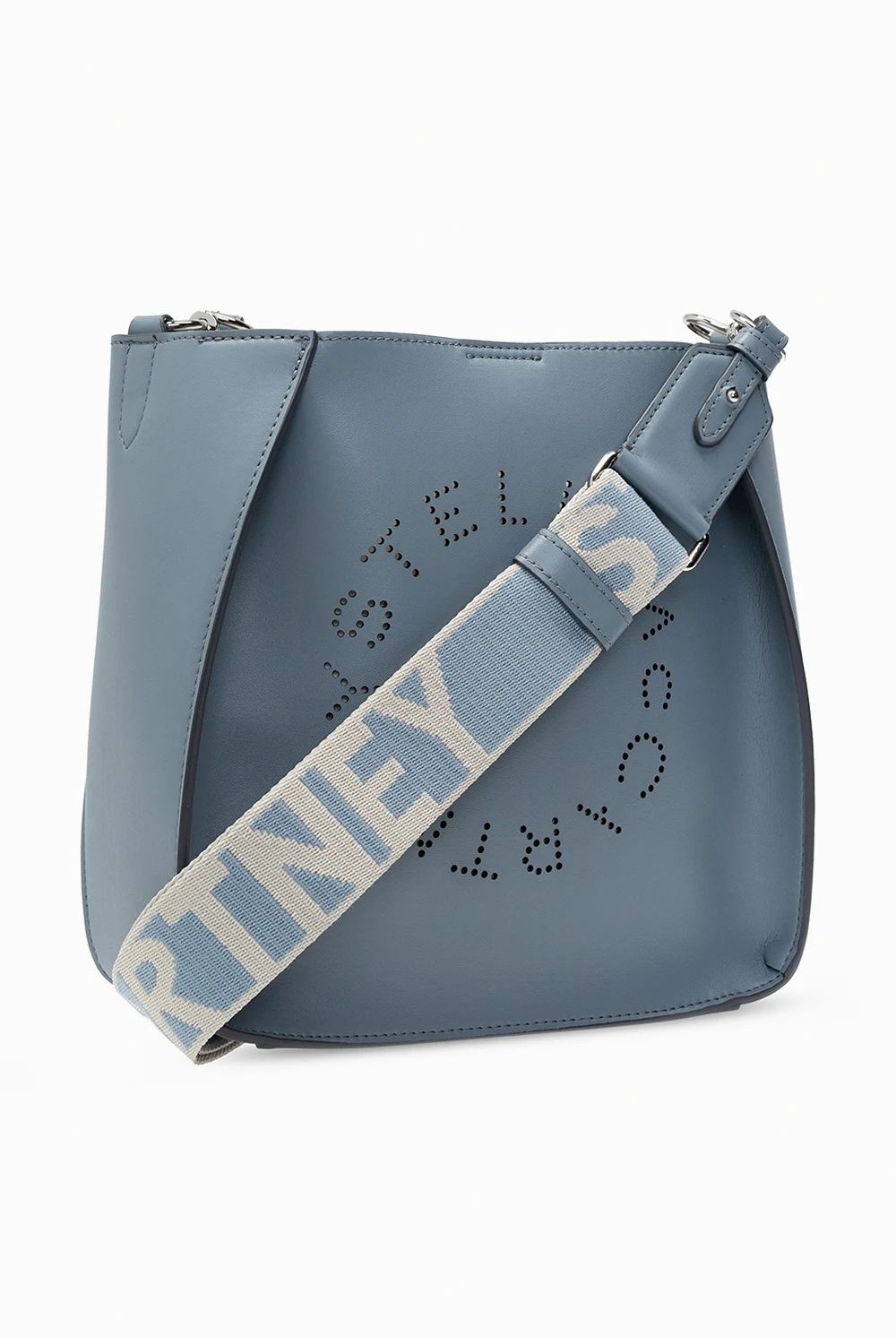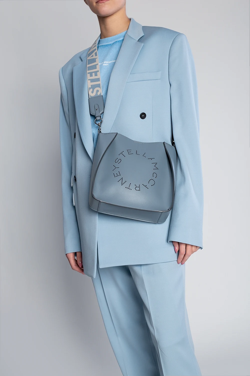 Light blue shoulder bag from Stella McCartney. Size mini. Crafted from eco-leather with a logo perforation, this design fastens via a magnetic snap and features a detachable and adjustable shoulder strap, silver-tone metal hardware and interior with one compartment and two slip pockets.