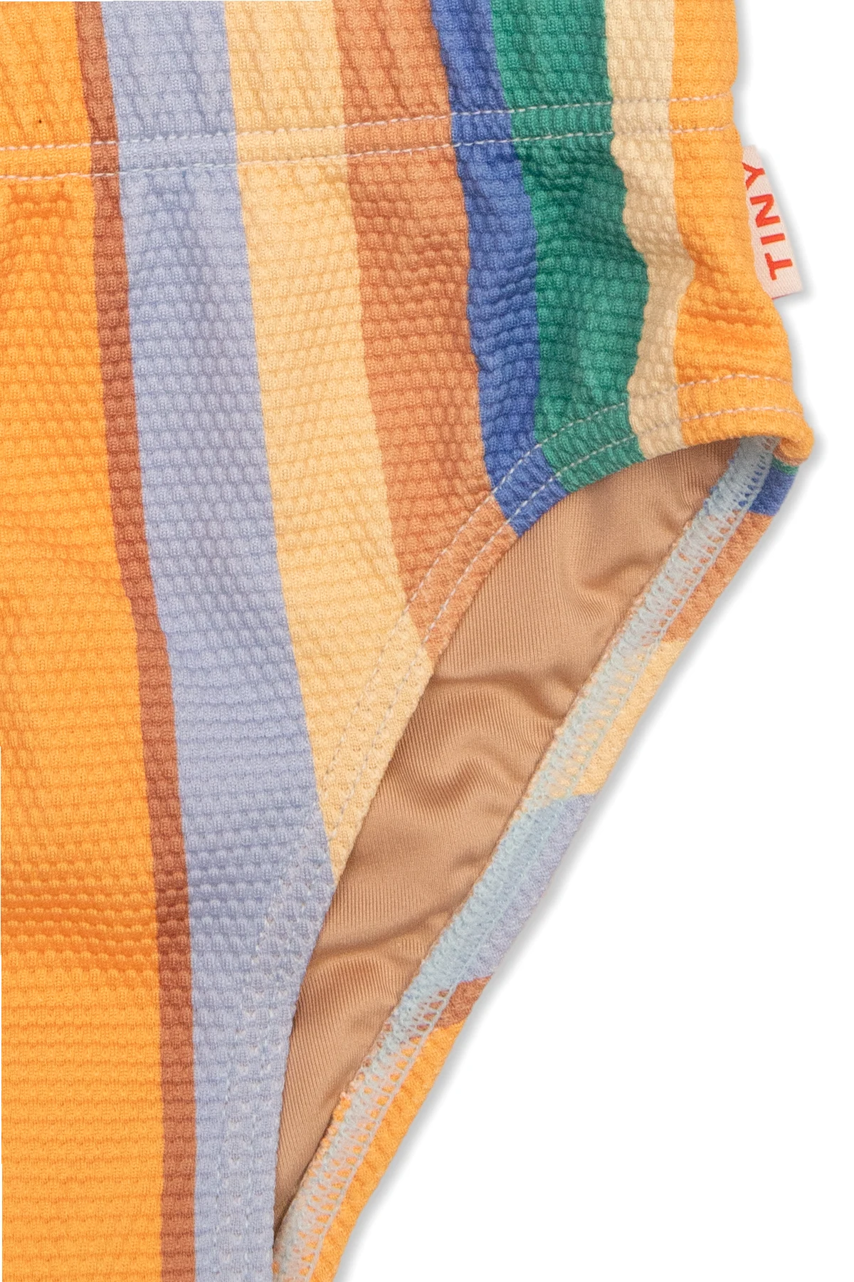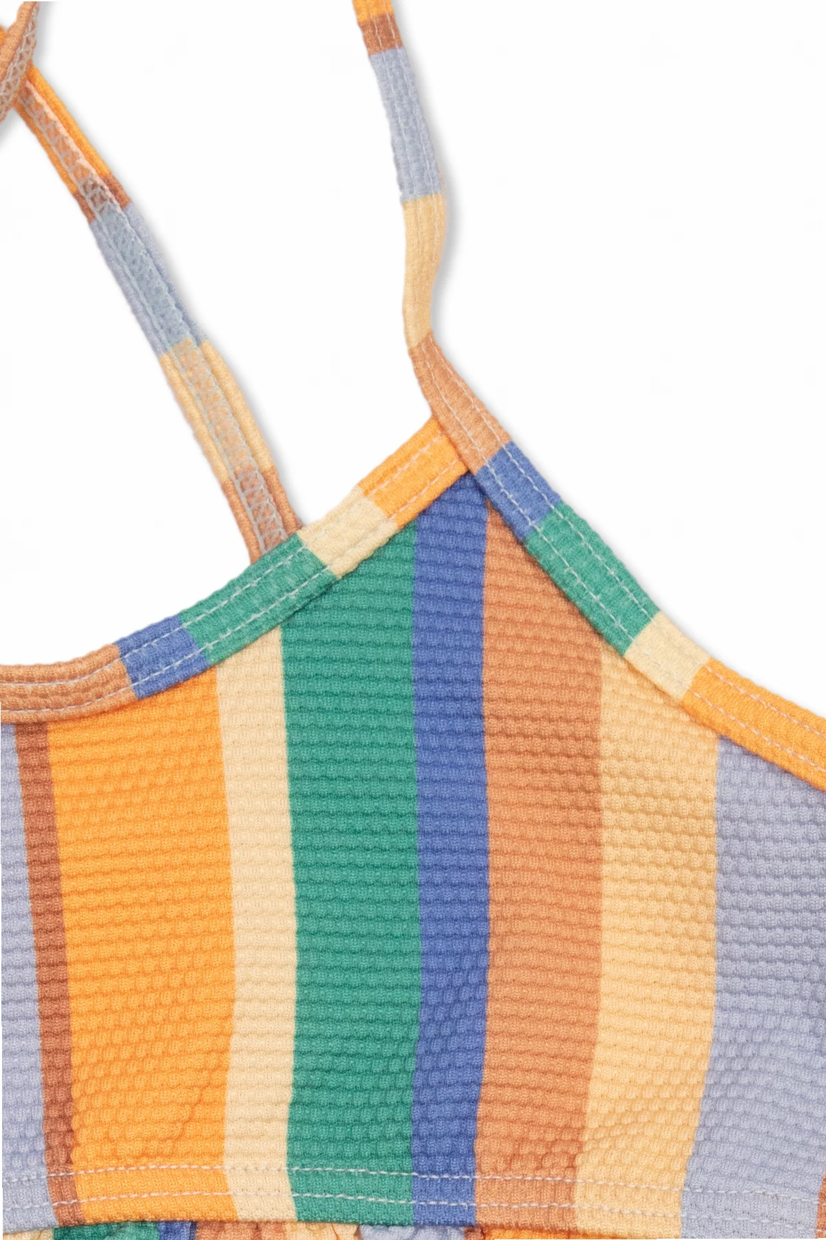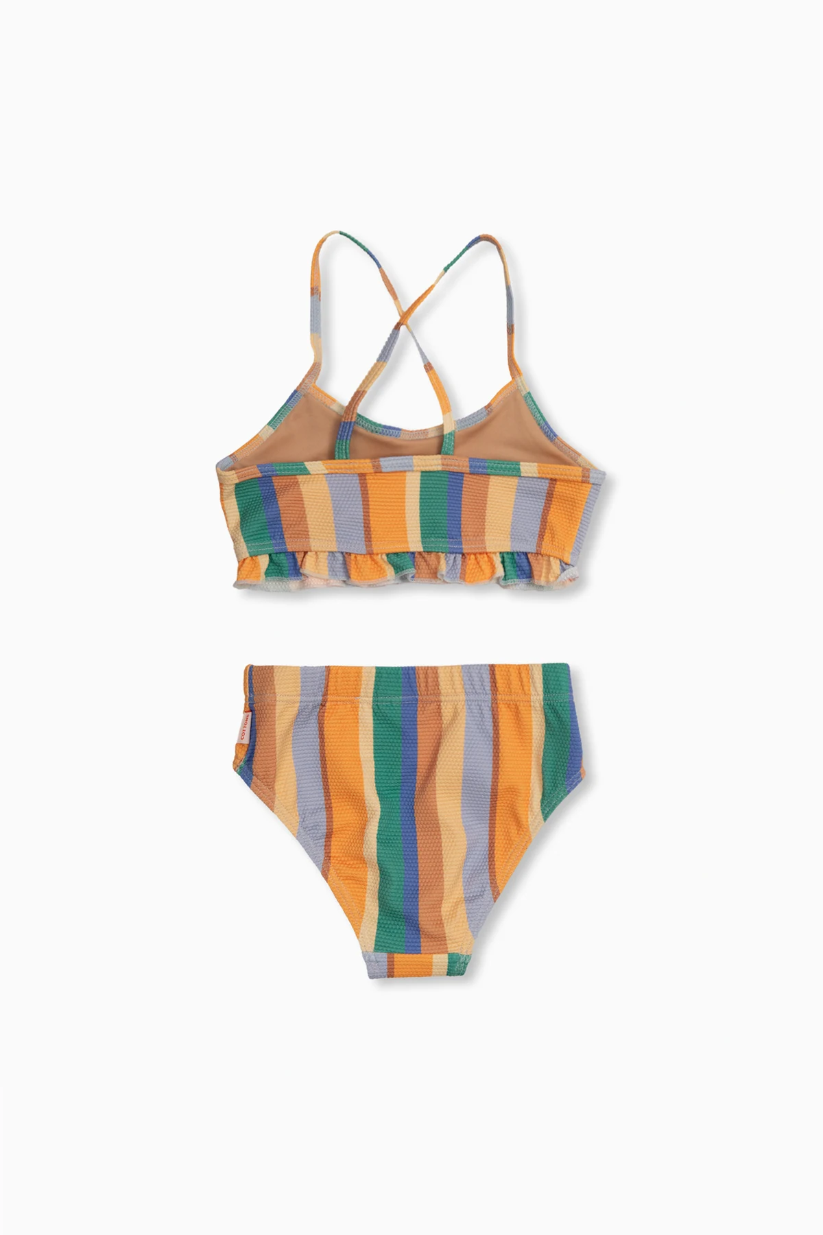 Multicoloured two-piece swimsuit from Tiny Cottons. This set is embellished with a stripe pattern and features a top with shoulder straps and a ruffle and bottoms with an elasticized waistband.