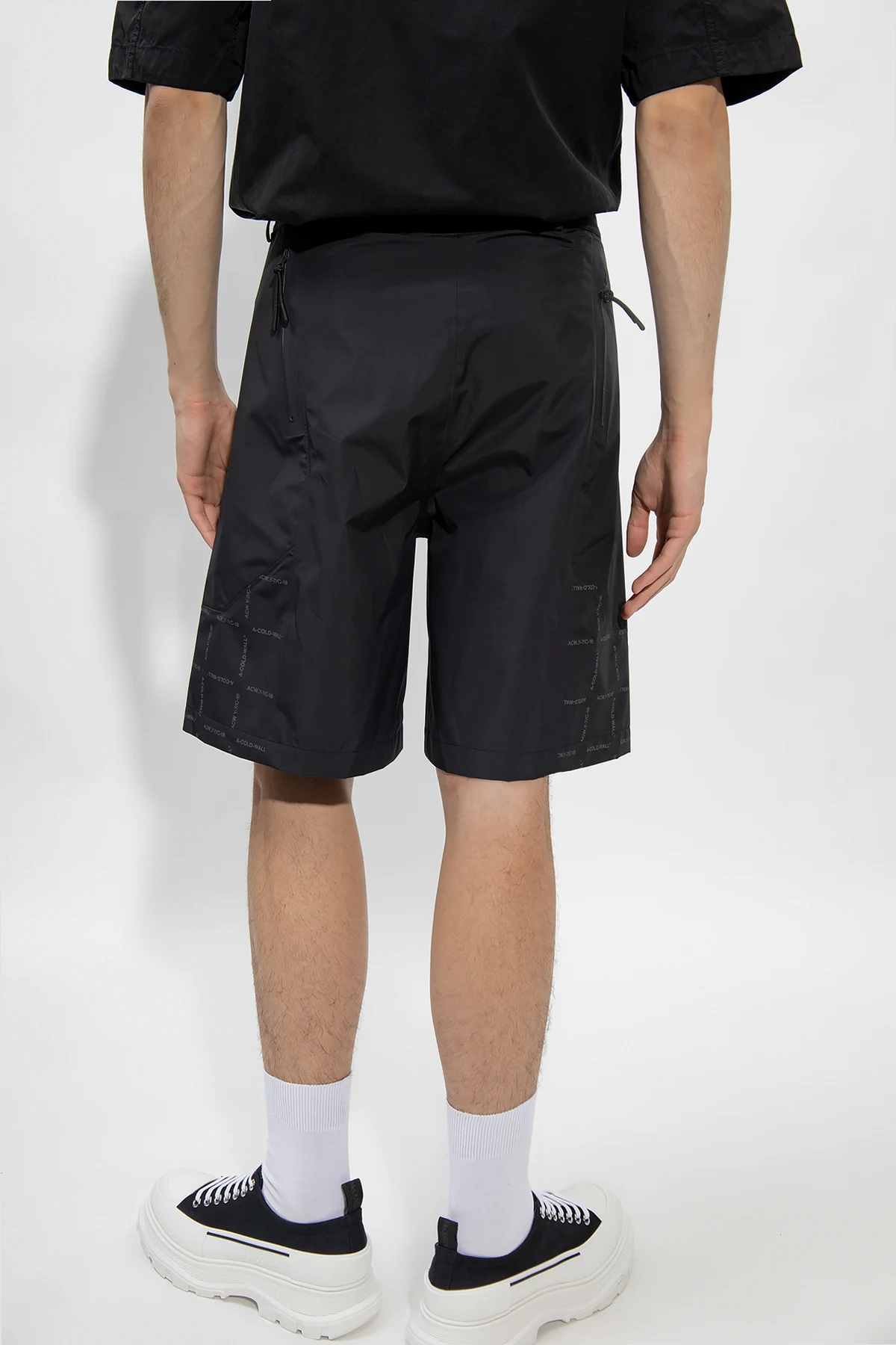 Black shorts from A-COLD-WALL*. Crafted from fabric with Performance membrane offering breathable, waterproof and windproof properties, this pair showcases a graphic pattern and a logo patch. It is complete with a zip fly with a button and snap and laser-cut zip pockets: two on the front and back.