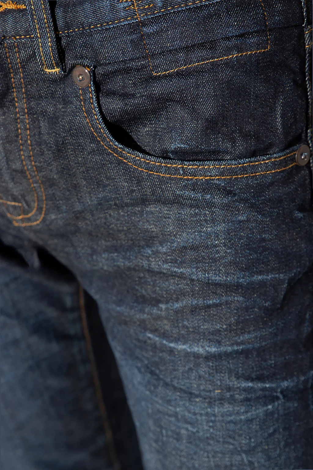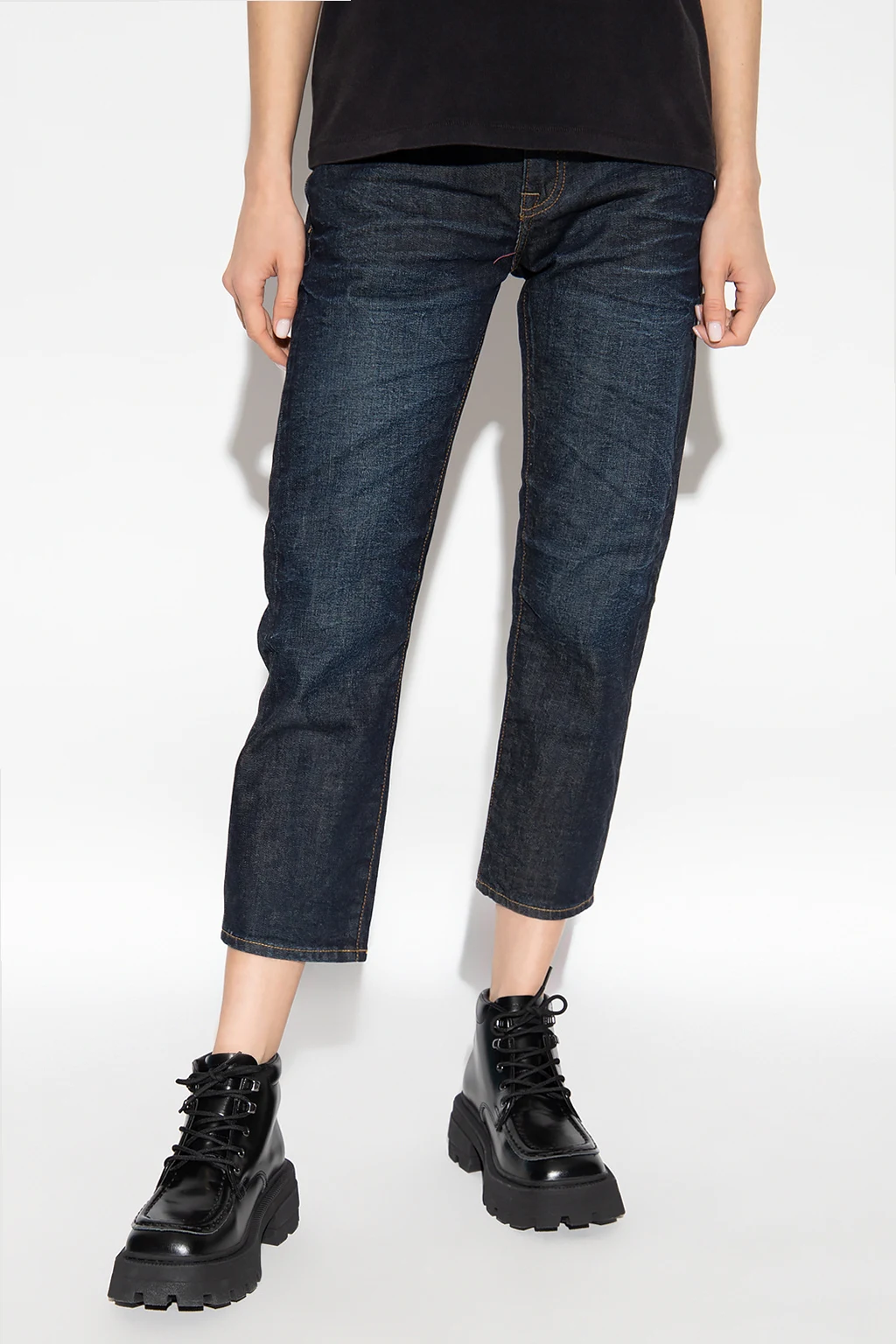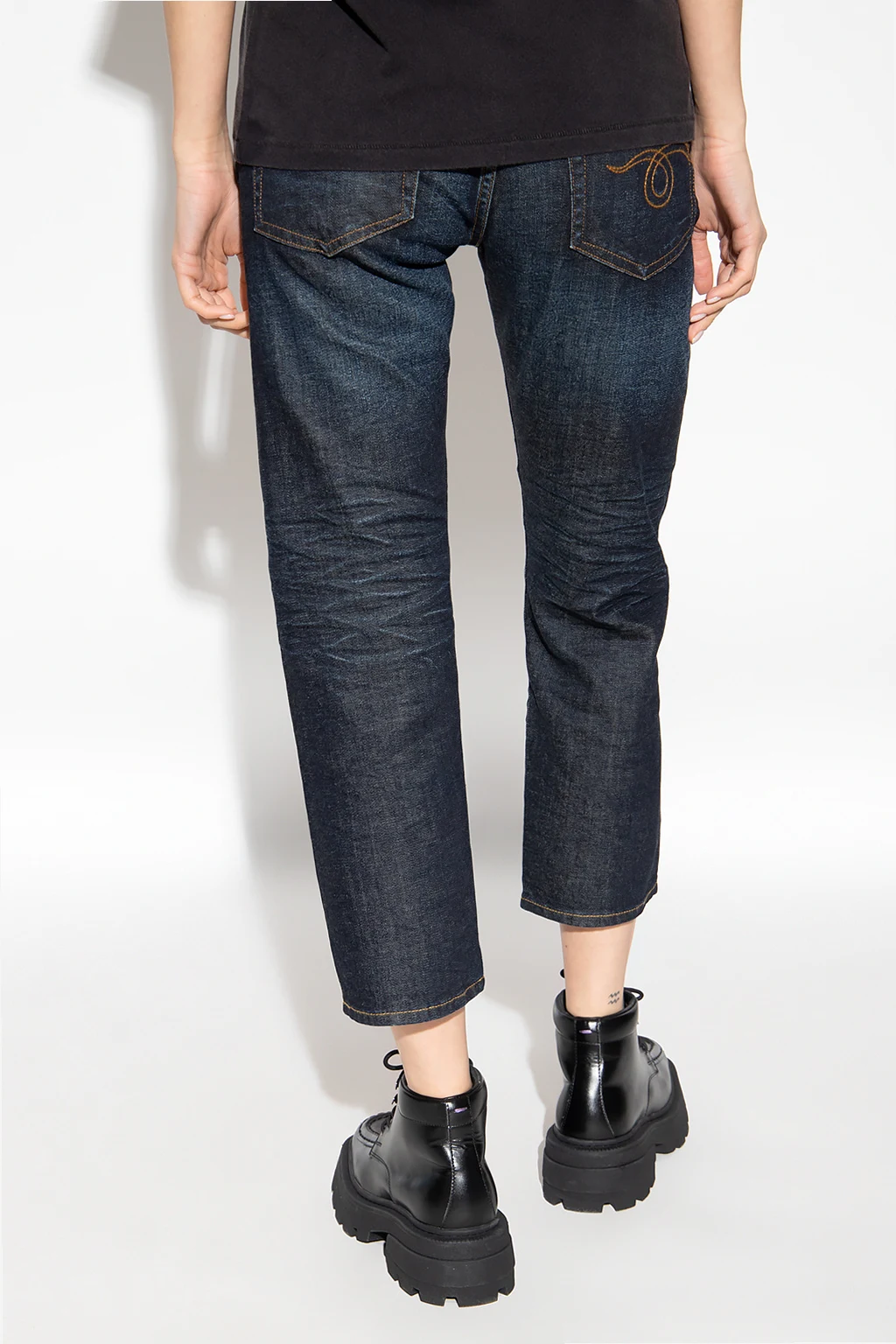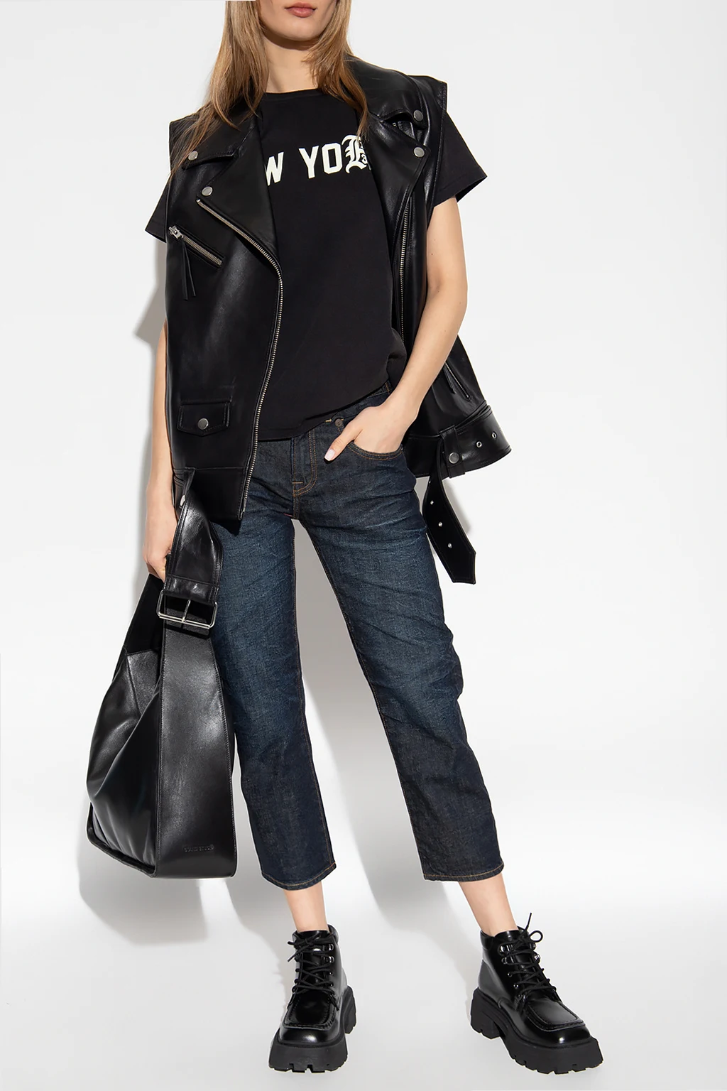 Navy jeans from Black T-shirt from R13. Made of cotton, this short sleeve design features a logo patch at the back, three front pockets, two back pockets and cropped legs.