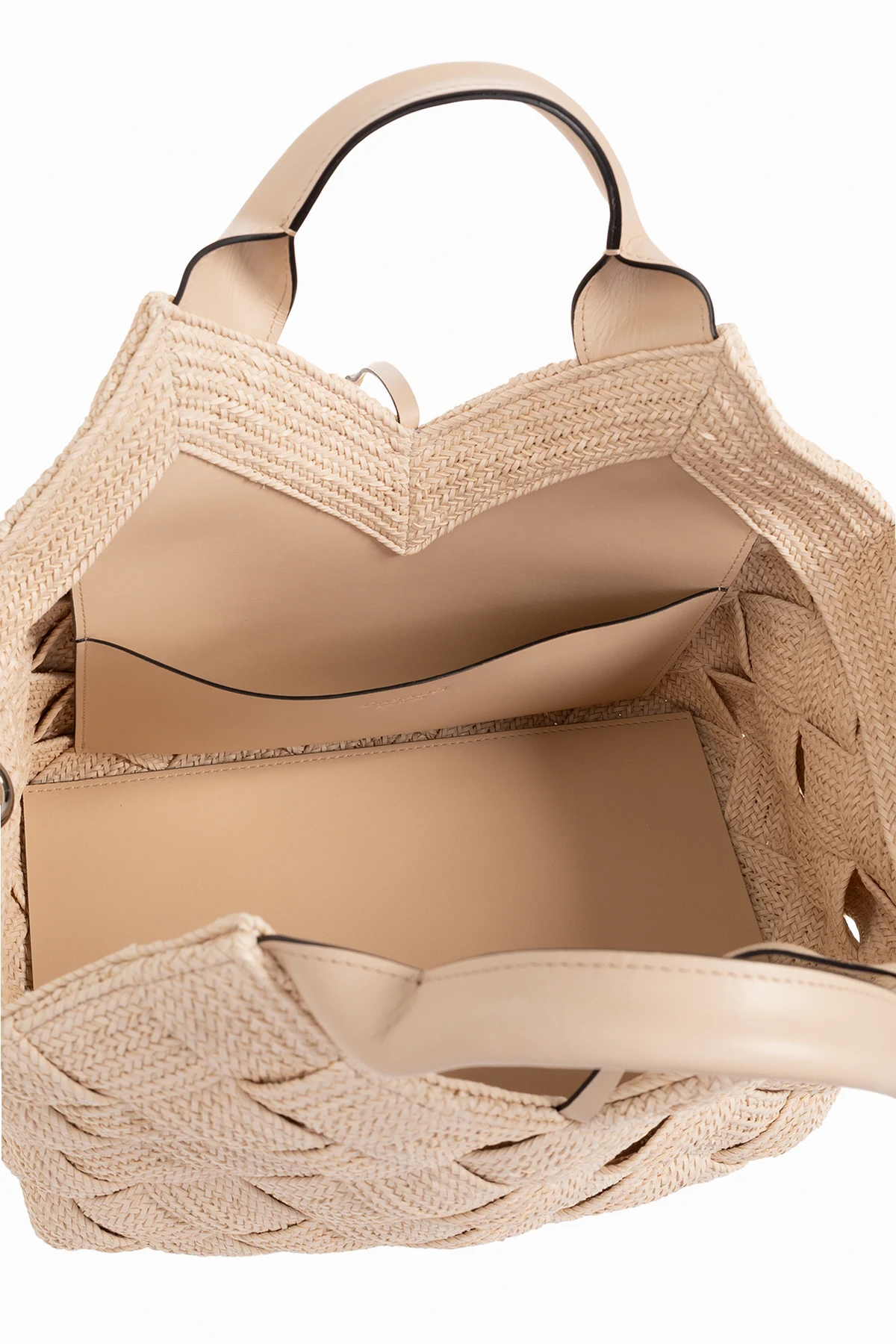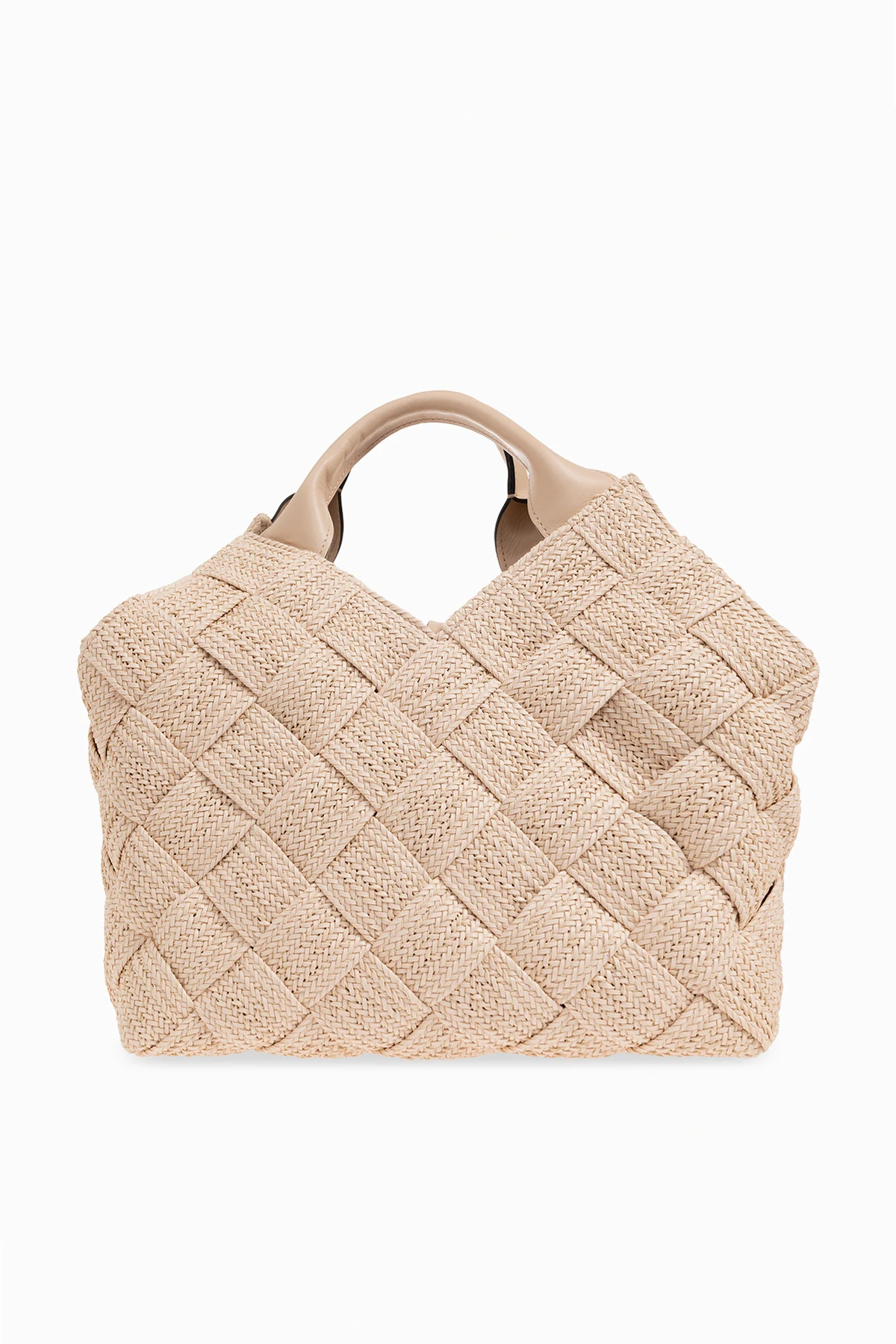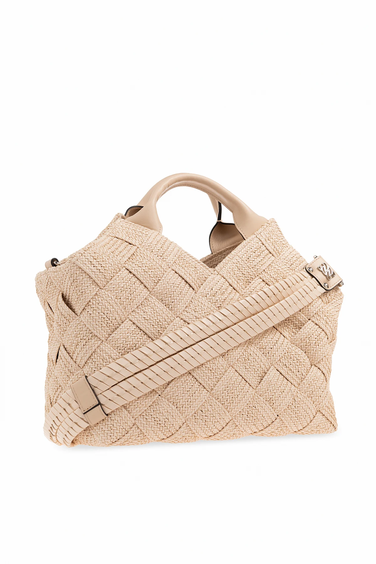 Cream ‘Hanoi’ shopper bag from Casadei. Constructed from woven vegan leather straps, this pair features tie fastenings, two handles, detachable shoulder strap, silver-tone metal hardware and one internal compartment with one slip pocket.