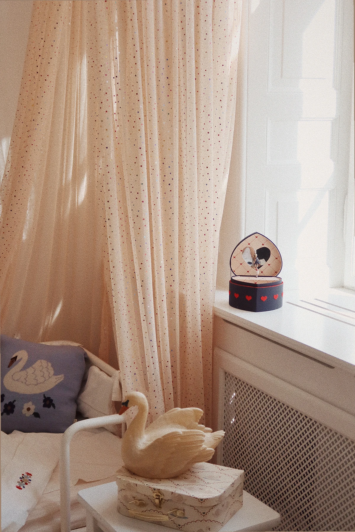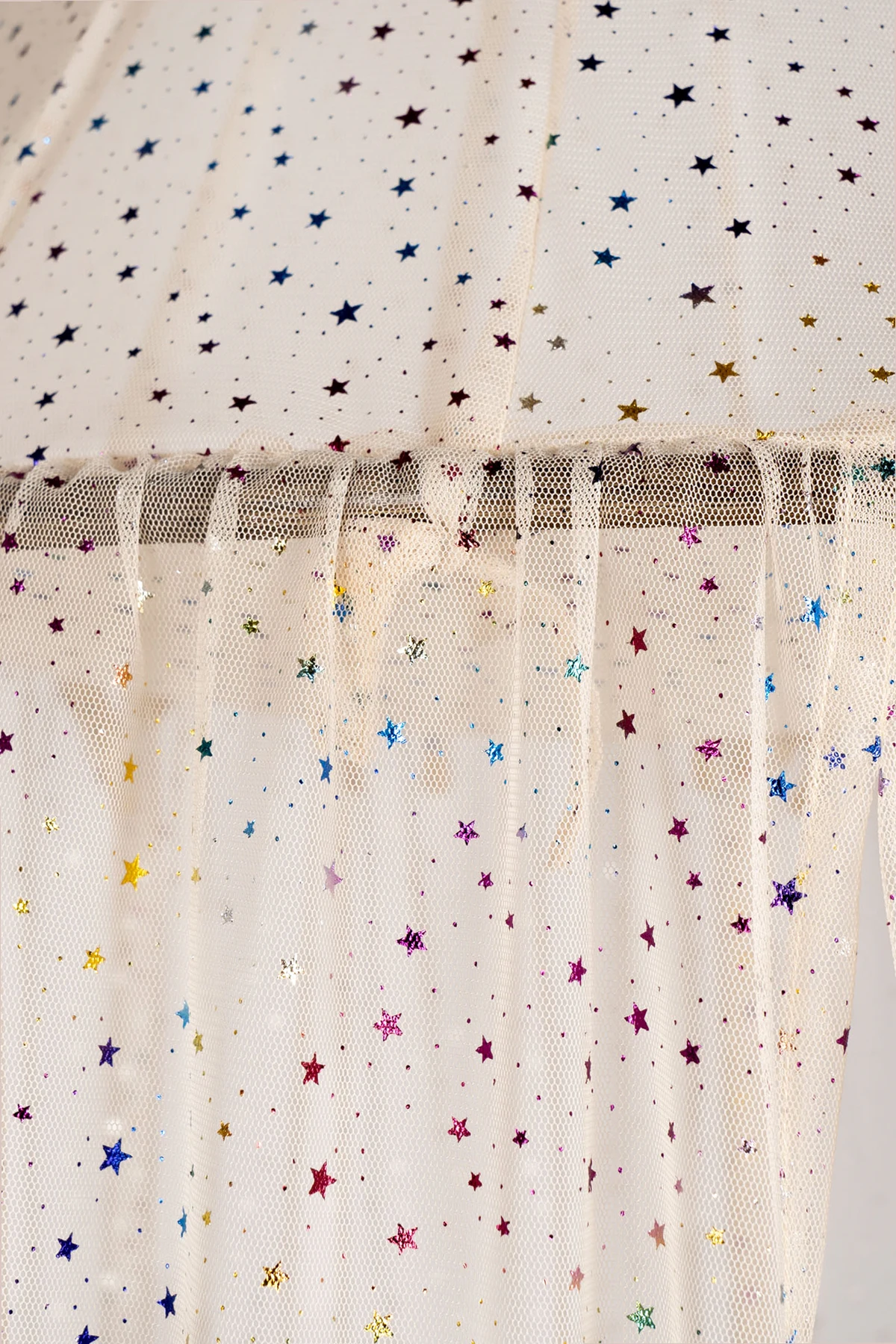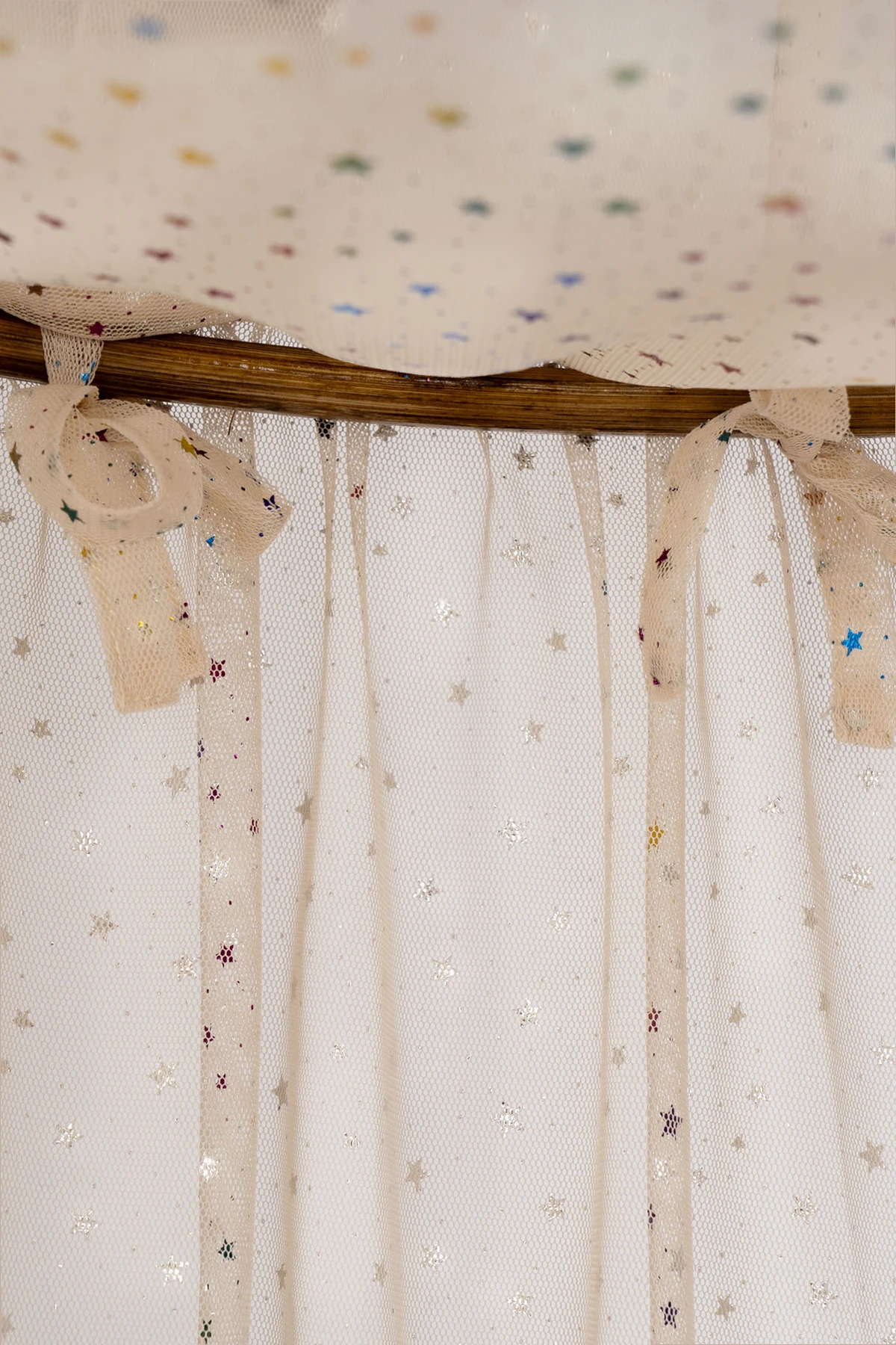 Cream tulle bed canopy with a star pattern from Konges Slojd. It creates a cozy and calm space for your little one. Can be used for play or for sleeping soundly and protected at night. Either way we are sure that your little one will love the magical feeling that it will bring to their room.